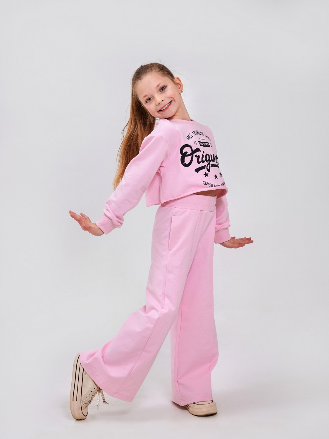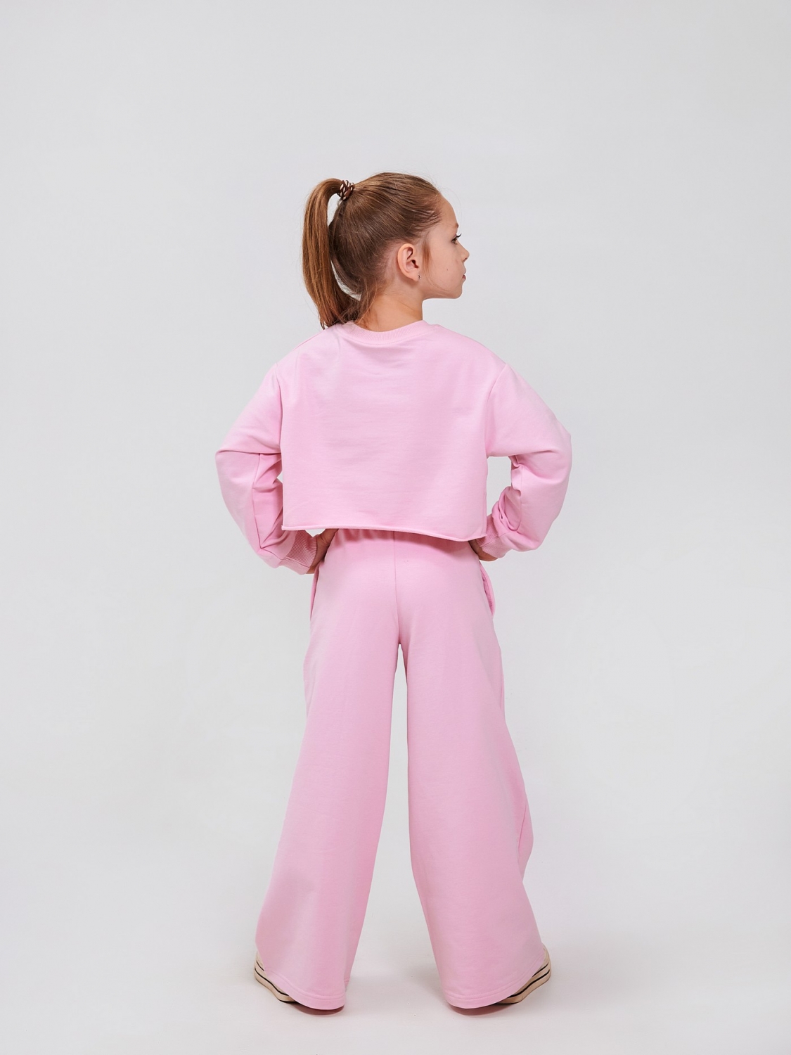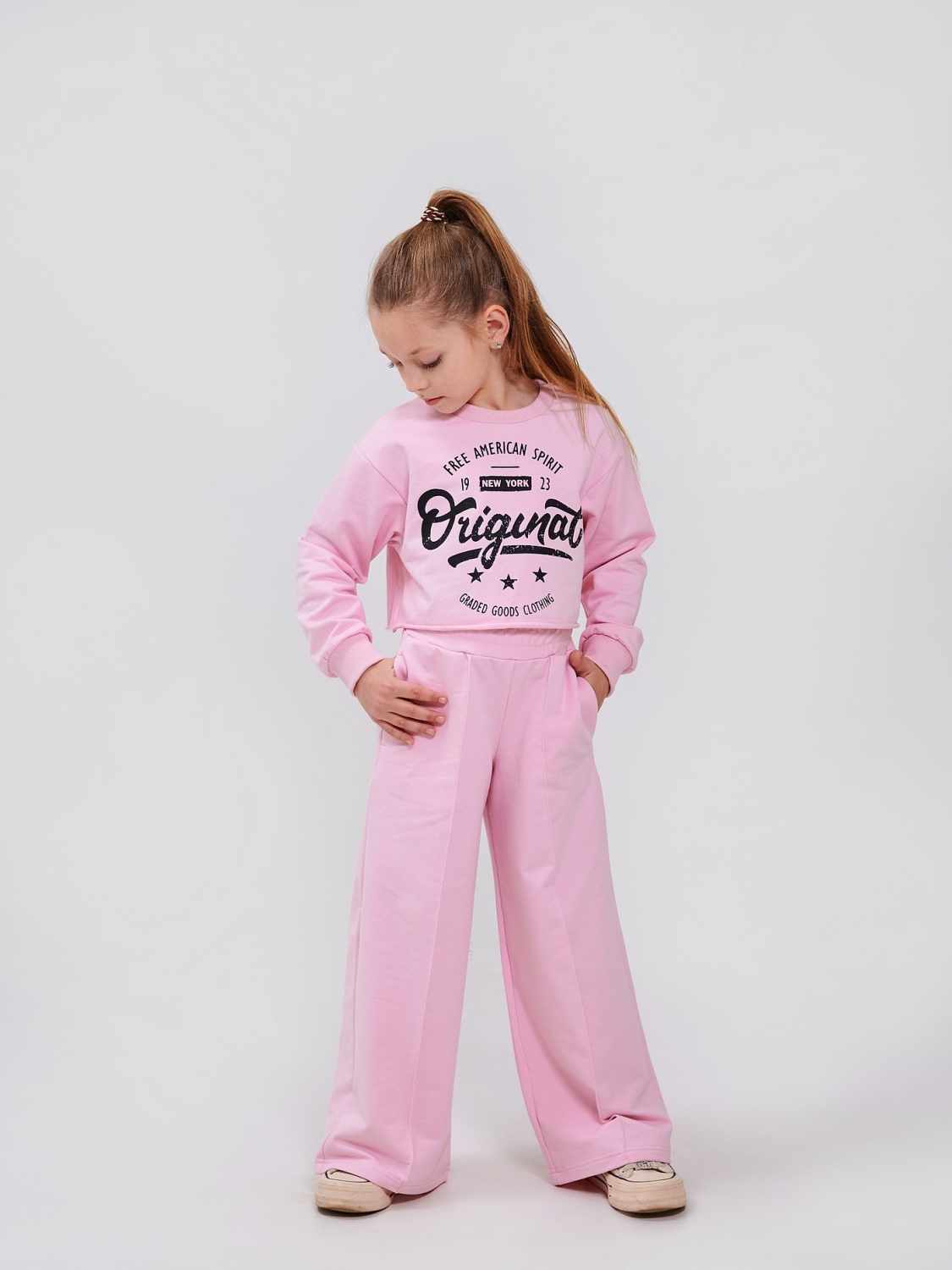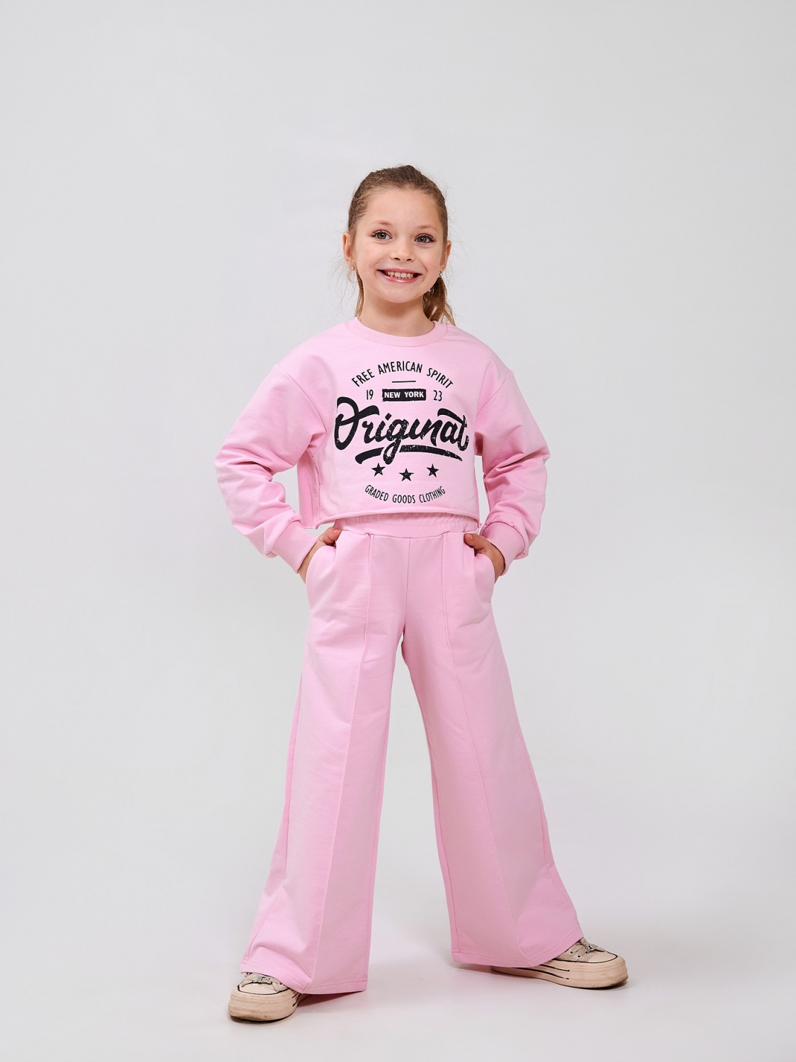 Стильный костюм для девочки – комфорт и мода в одном образе! Свитшот с прямой печатью – яркий и стильный акцент. Расклешенные брюки – модный фасон, который красиво сидит и не стесняет движений. Функциональные карманы – удобно для мелочей и добавят стиля в образ. Стрейчевый футер – мягкий, теплый и эластичный для максимального комфорта. Идеален для прогулок, праздников и стильных повседневных образов!
