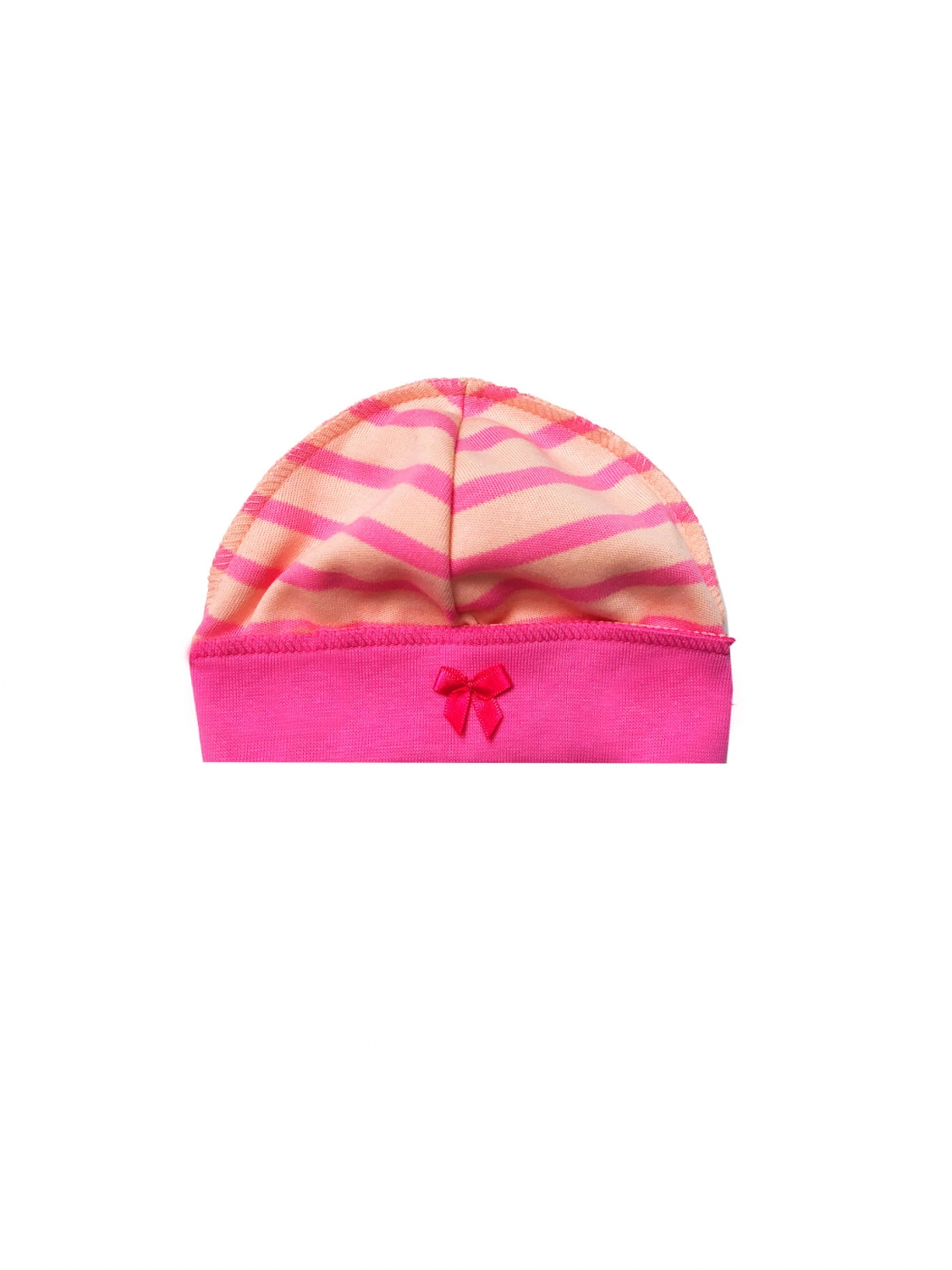 Стильная демисезонная шапочка в розово-малиновую полоску пригодится каждой малышке. Это изделие можно носить на прогулки, сочетая с куртками и кофтами. Для пошива использовался качественный, мягкий, приятный к телу интерлок. Эластичный ободок розового цвета обеспечивает комфортную посадку и защищает от ветра, в качестве декора выступает небольшой бантик. Так как изделие предназначено для самых маленьких, все швы в нем сделаны наружу