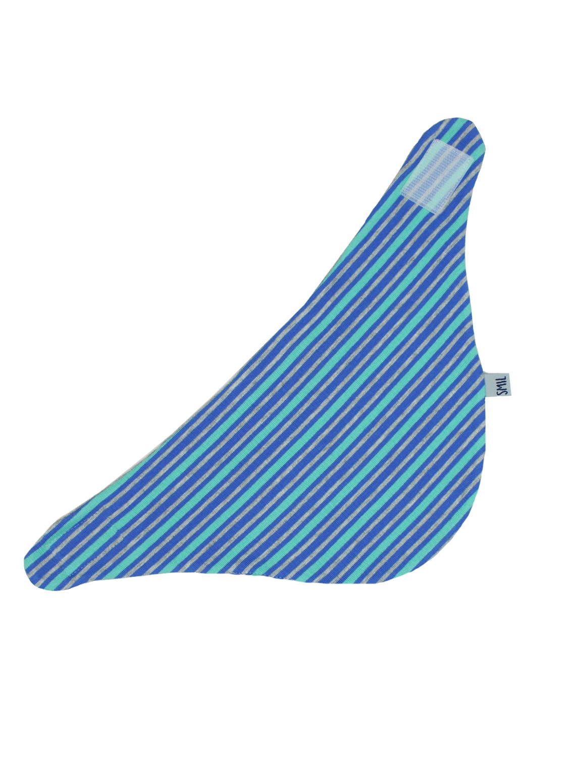 Горловина в бирюзовую полоску. В изделии предусмотрена липучка, благодаря которой его надевание будет легким и комфортным для ребенка. Модель сшита из стрейчевого ластика