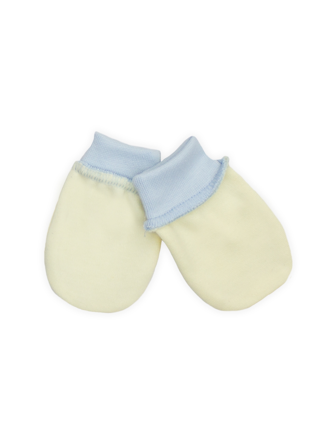 Универсальные царапки в кремовом оттенке – аксессуар, который сохранит ручки малыша в тепле и не даст ему себя поцарапать. Изделие выполнено из гипоаллергенного хлопкового полотна – интерлока, который дает коже дышать. Царапки оснащены широкими резинками голубого оттенка, благодаря им они держатся на ручках. Этот аксессуар рассчитан на ежедневное использование.