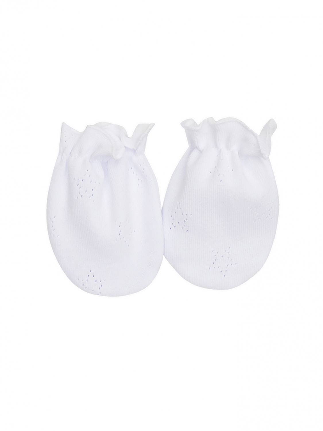 Универсальные белые царапки точно пригодятся вашему малышу. Так как это изделие не дает ребенку поцарапать себя и сохраняет ручки в тепле. Изделие выполнено из мягкого полотна – интерлок софта, который не препятствует воздухообмену. Царапки с перфорацией оснащены резинками, благодаря им изделие держится на ручках. Эта модель подойдет и для девочек, и для мальчиков.
