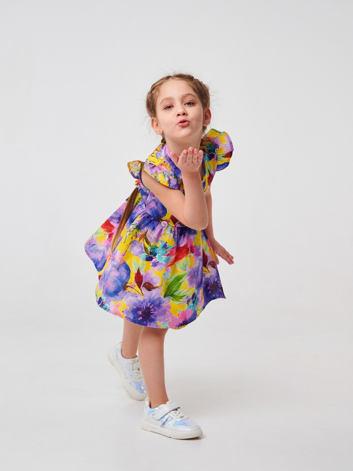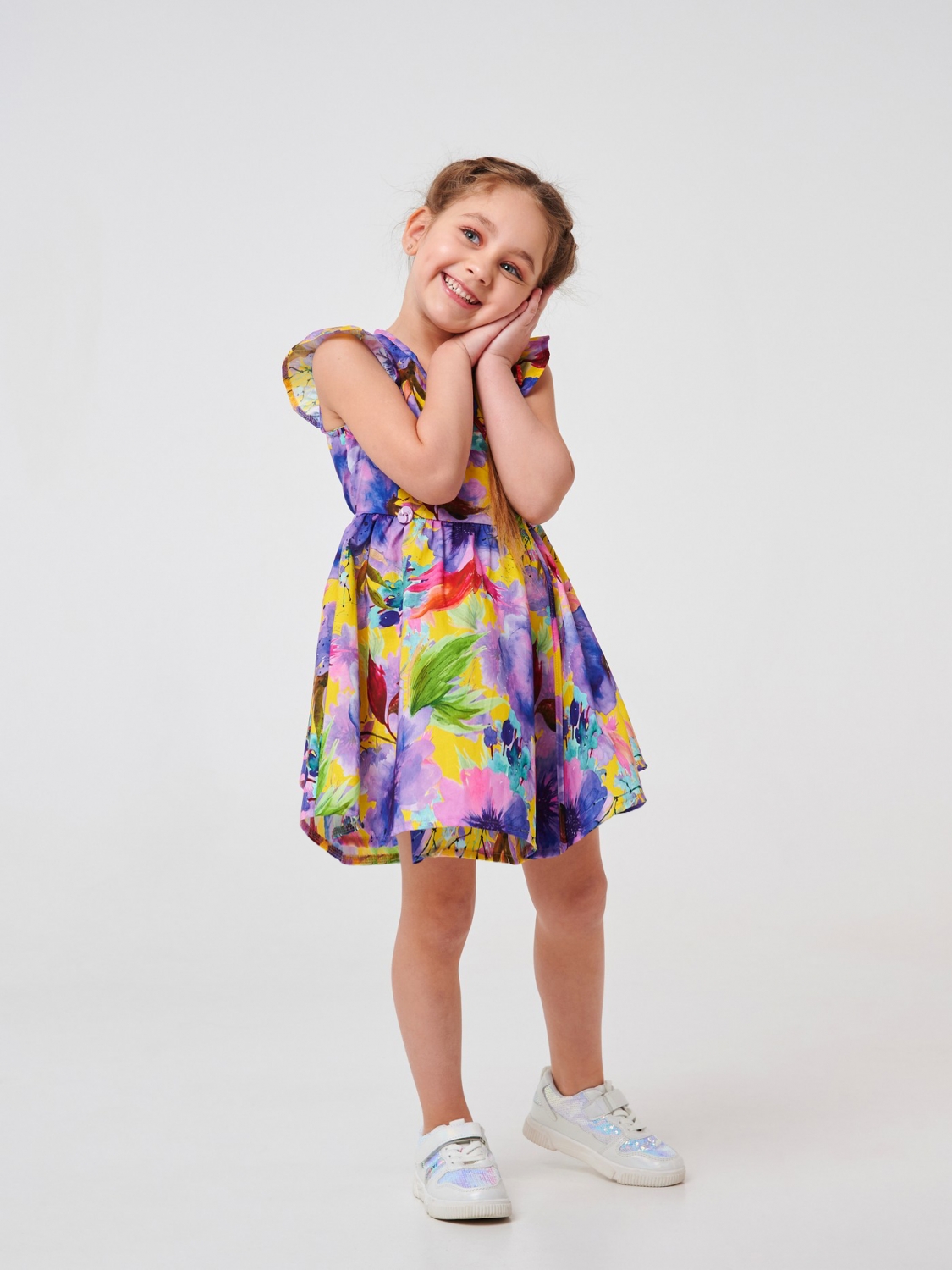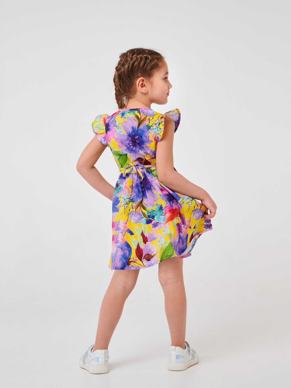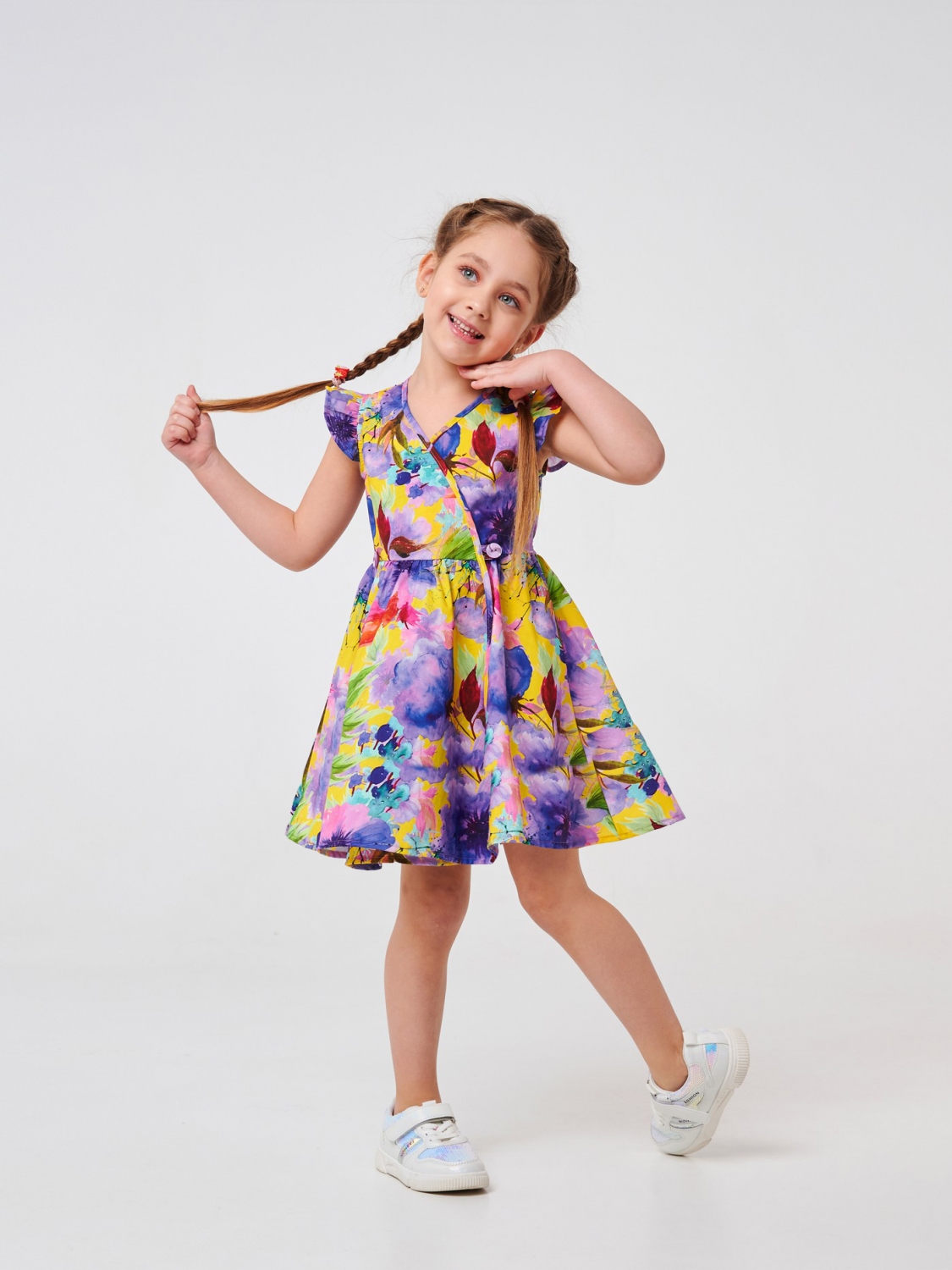 Ситцевое платье для девочки. Это модель, созданная из ситца в красивый цветочный принт. В пошиве изделия использован на 100% хлопковый материал, который хорошо пропускает воздух, приятен на ощупь. Изделие с V-образным вырезом можно носить каждый день. Симпатичные рукава-бабочки придают наряду праздничности. Модель завязывается сзади на талии на тонкий пояс, а спереди застегивается на пуговицу.