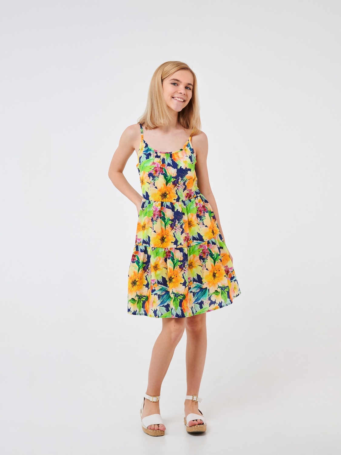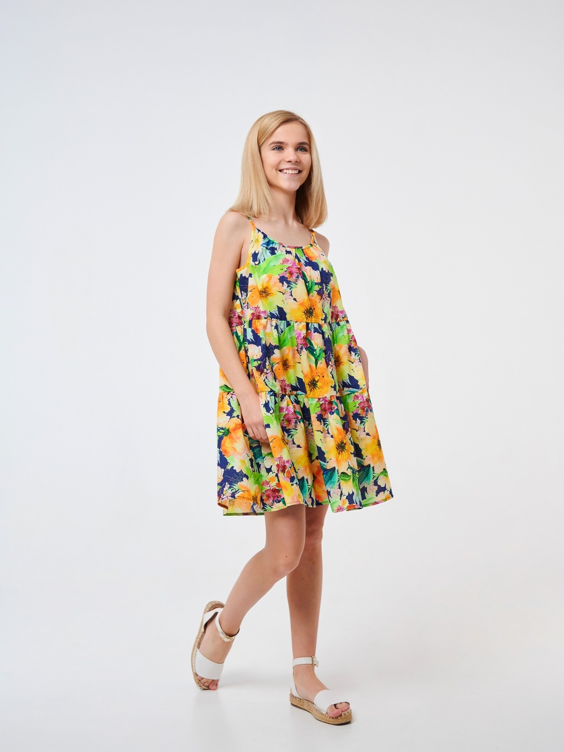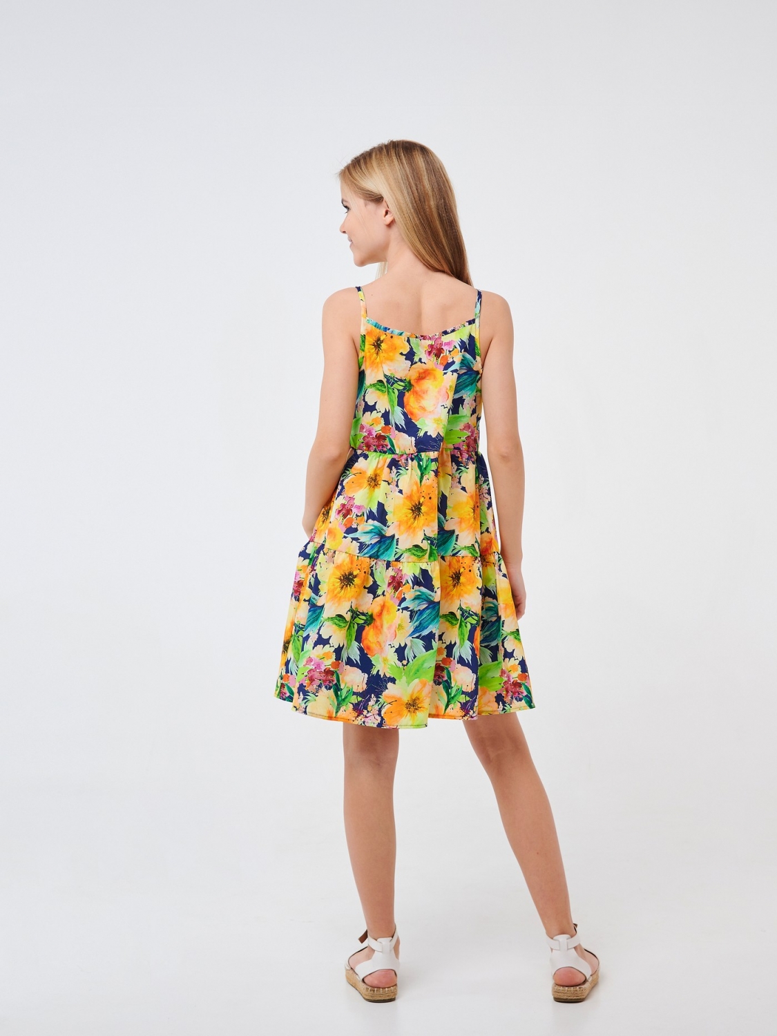 Сарафан в романтическом стиле для девочки. Модель свободного кроя пошита из ситца. Это на 100% натуральный материал, воздушный, приятный на ощупь. Изделие на тонких бретелях с красивым цветочным принтом подойдет для повседневного ношения.