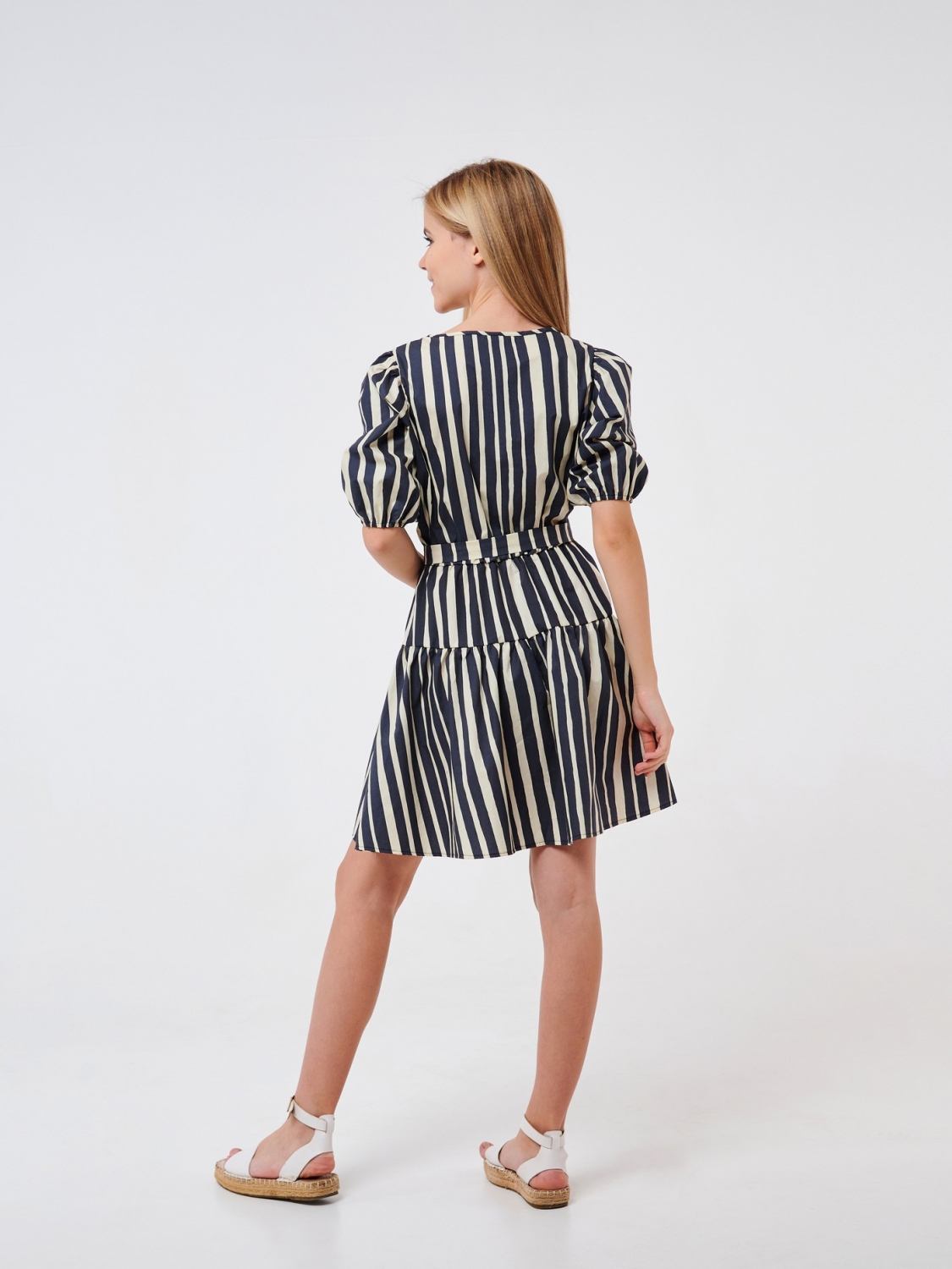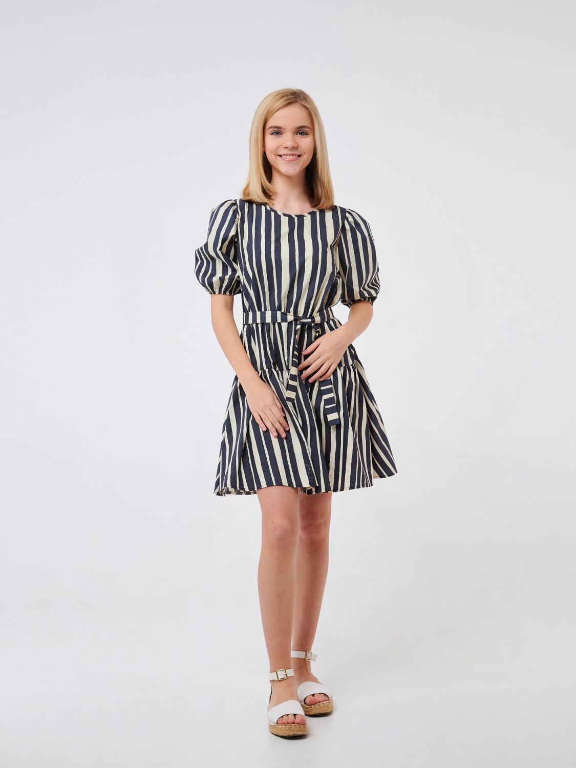 Летнее платье для девочки. Оно пошито из 100% натурального хлопкового материала – ситца. Это воздухопроницаемый, легкий материал, который идеально подходит для создания летней одежды. Изделие декорировано полосатым принтом. Модель с приталенным силуэтом, короткими рукавами и поясом понравится школьнице. В этом платье она сможет отправиться на прогулку с друзьями.