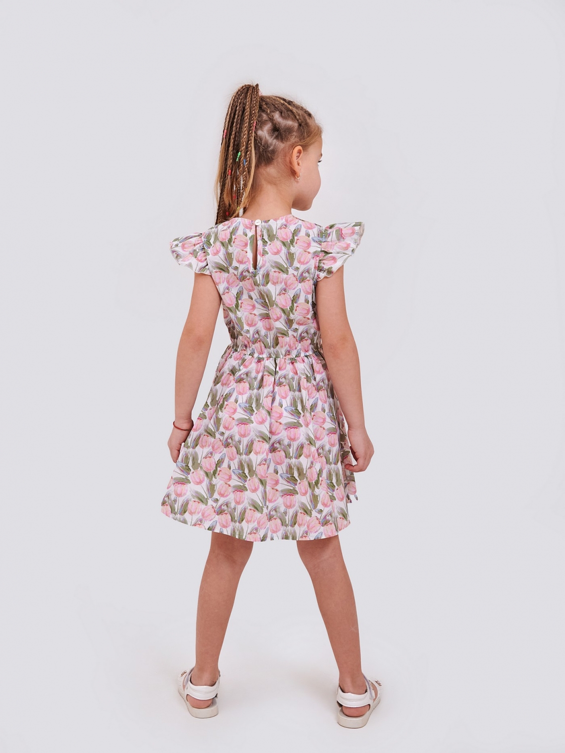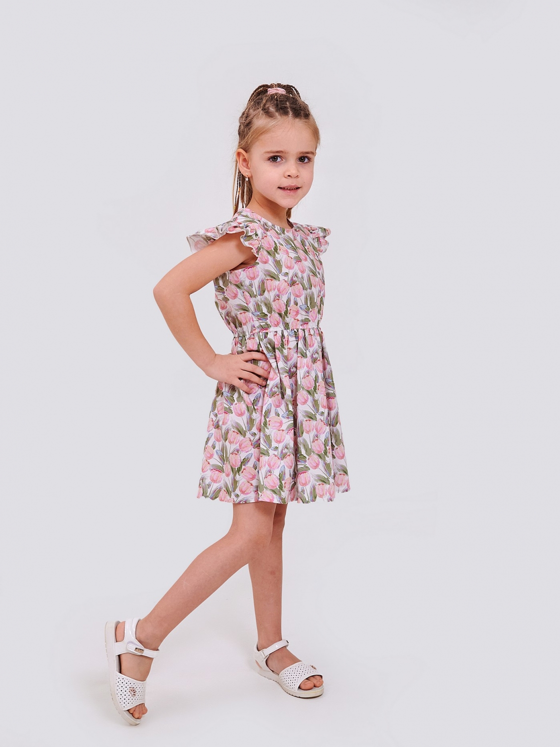 Очаровательное платье для девочки из воздушного ситца с нежным рисунком розовых тюльпанов подарит комфорт и ощущение лёгкости. Воланчики на рукавах добавляют романтичности, застёжка-пуговка на спинке делает модель удобной, а резинка в поясе создаёт красивый силуэт. Идеальный выбор для летних прогулок, праздников и особенных моментов!
