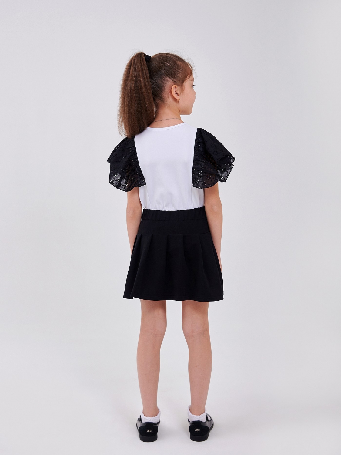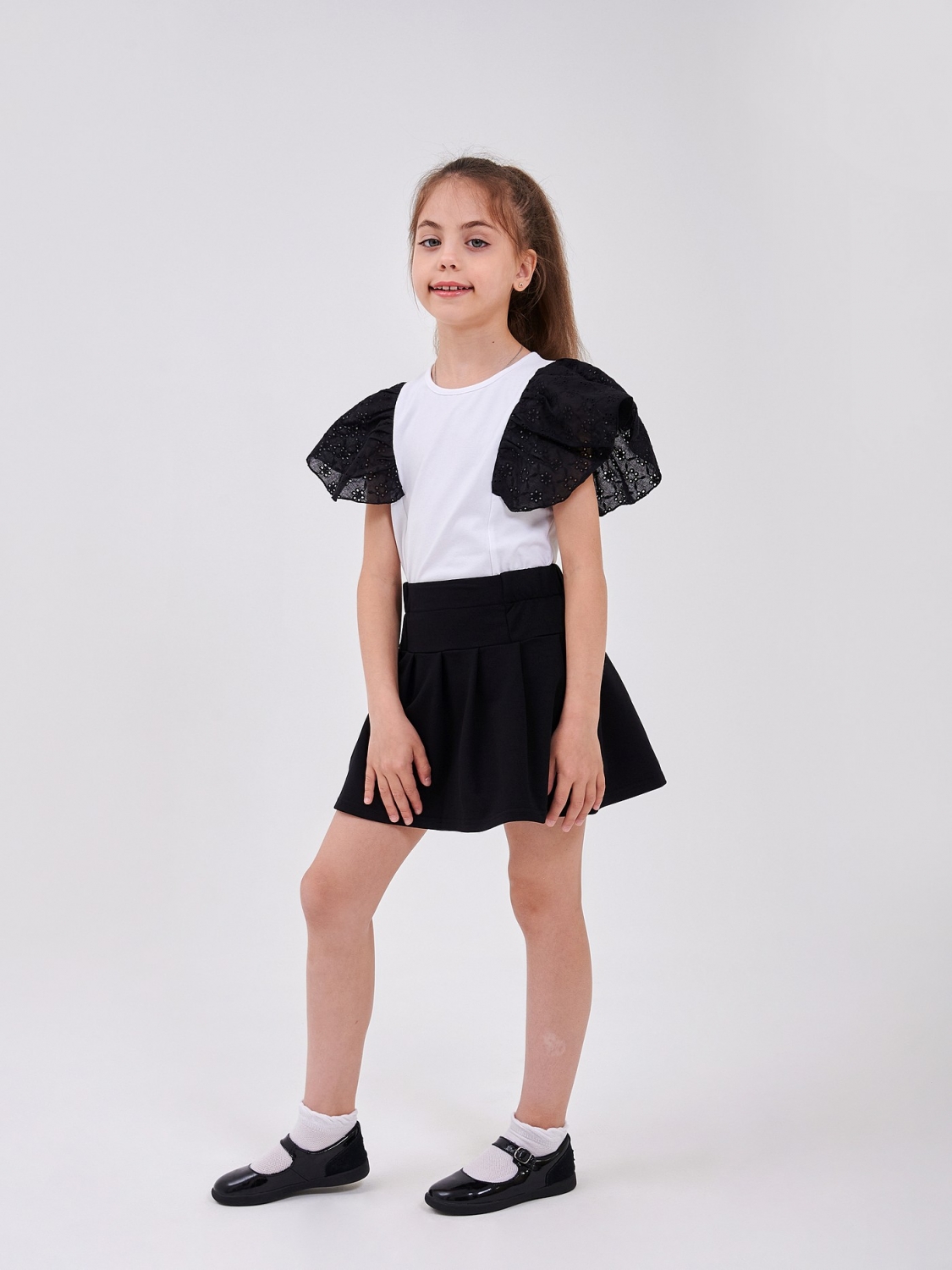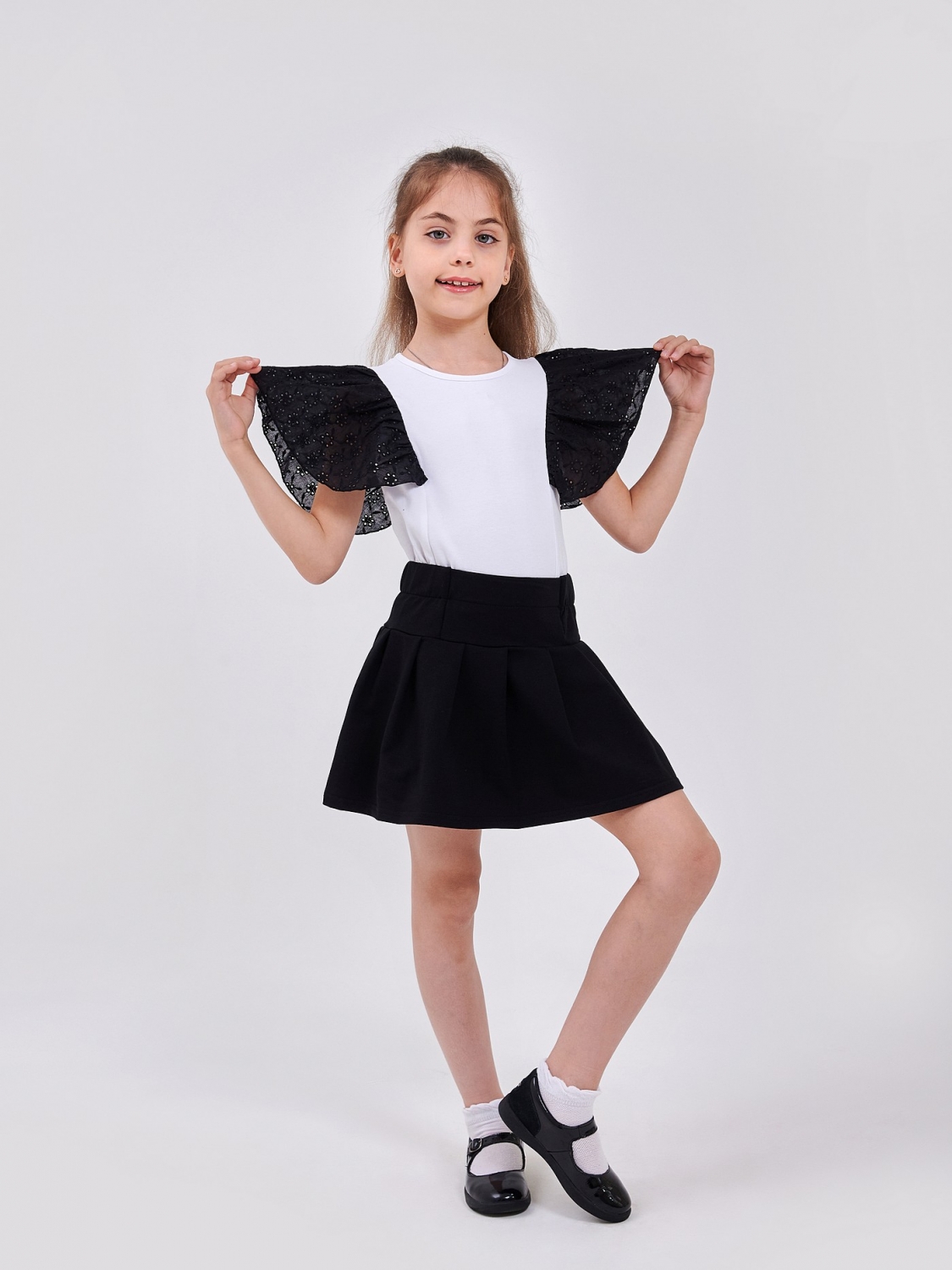Элегантная расклешённая юбка для девочек — идеальный выбор для школы, праздников и повседневных образов. Грамотно продуманный силуэт красиво смотрится в движении, подчёркивая утончённость и лёгкость. Удобный пояс на резинке, качественное полотно и универсальный чёрный цвет — легко сочетается с любой блузкой или гольфом.