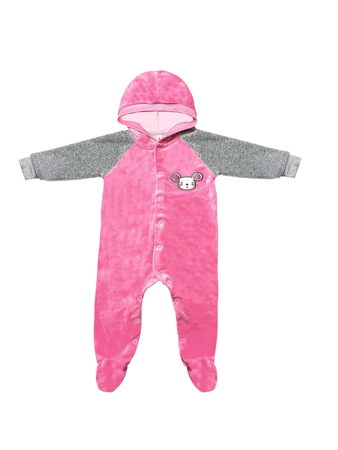 Универсальный и практичный комбинезон серо-розового цвета сшит из мягкого, качественного и износостойкого велюра. Это изделие рассчитано на девочек в возрасте от 6 до 18 месяцев. Комбинезон с капюшоном и закрытыми стопами украшает аппликативная вышивка. На рукавах есть манжеты, модель застегивается на кнопки-колечки, которые находятся спереди и на штанинах
