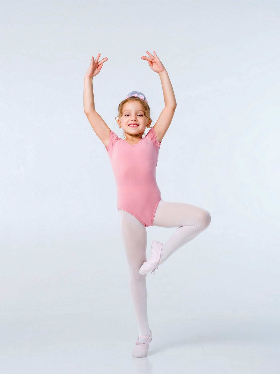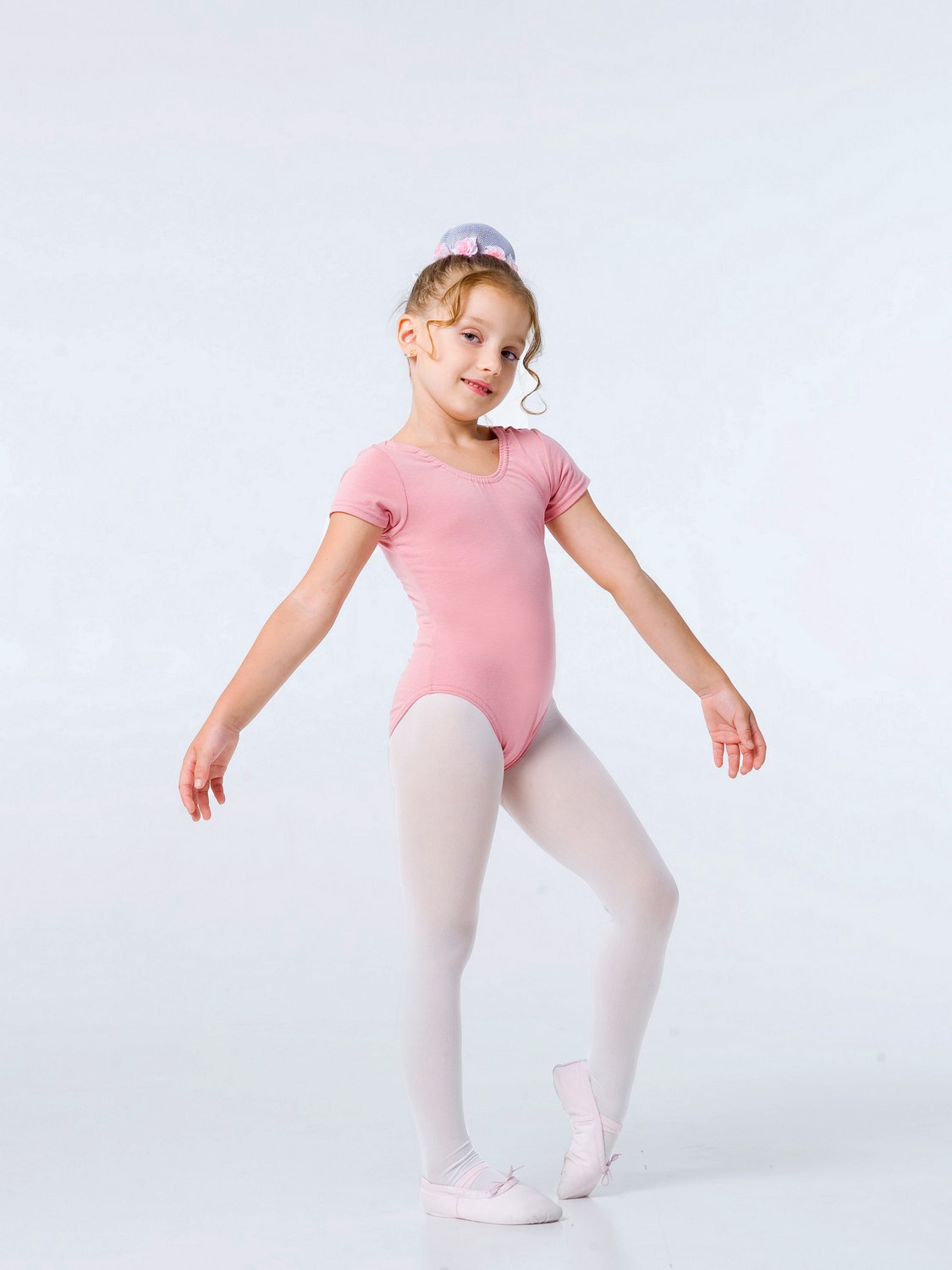 Универсальный купальник в пудровом оттенке – базовый элемент гардероба, который девочка сможет надевать на занятия спортом или танцами. Изделие пошито из мягкого хлопкового материала – стрейчевого кулира, который не вызывает аллергию или раздражение. Купальник с короткими рукавами плотно облегает тело, но не ограничивает движения и не давит. Изделие можно носить вместе с юбками, шортами, колготками и лосинами.