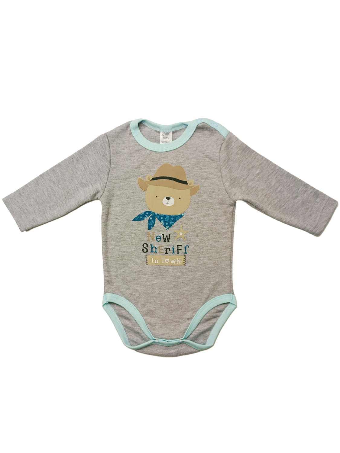 Боді для хлопчика в кольорі сірий меланж з унікальним дизайном: милий ведмедик-ковбой та напис "New Sheriff in Town" запрошує вас поринути у світ фантазій та захоплюючих ігор! Прямий друк ведмедика-ковбоя робить це боді неповторним. Ваш маленький шериф виділятиметься у натовпі своїм унікальним стилем. Боді оснащено кнопками на плічці і внизу, що полегшує перевдягання та зміну памперса. Бавовняне полотно інтерлок, що використовується в боді, має чудові гіпоалергенні властивості і хорошу повітропроникність, забезпечуючи комфортне відчуття протягом усього дня.