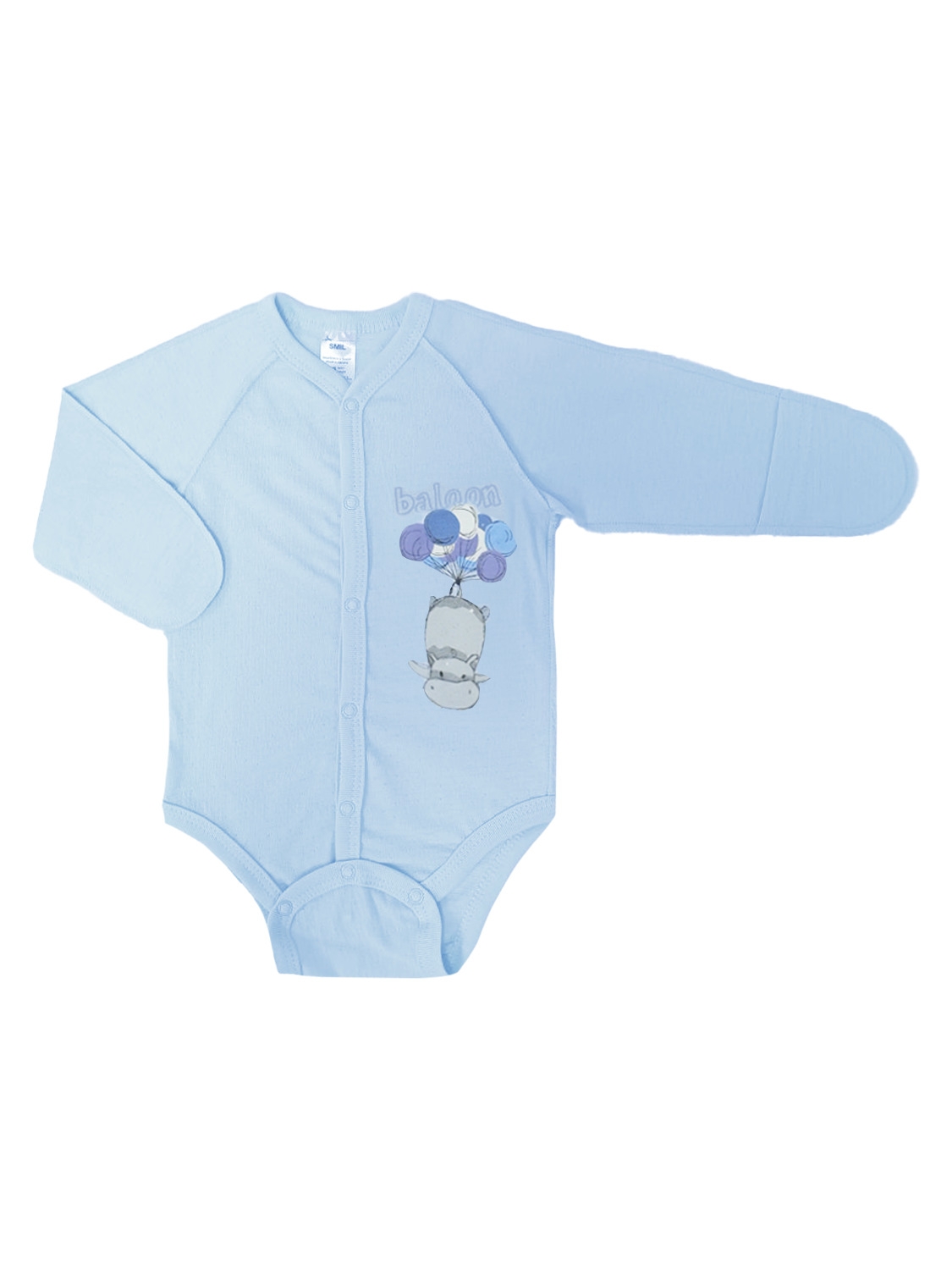 Блакитний боді - це втілення м'якості та ніжності! Пошитий з ажурного куліра, наш боді-розпашонка забезпечує максимальний комфорт для ніжної шкіри вашого малюка. Зовнішні шви та закриті ручки захищають його від неприємних відчуттів та подряпин, дозволяючи йому насолоджуватися кожним моментом свого дитинства. Зручні кнопки полегшують процес перевдягання, а прямий друк смішного бегемотика, що літає на повітряних кульках, і написом Balloon додадуть щедру порцію веселощів і грайливості.