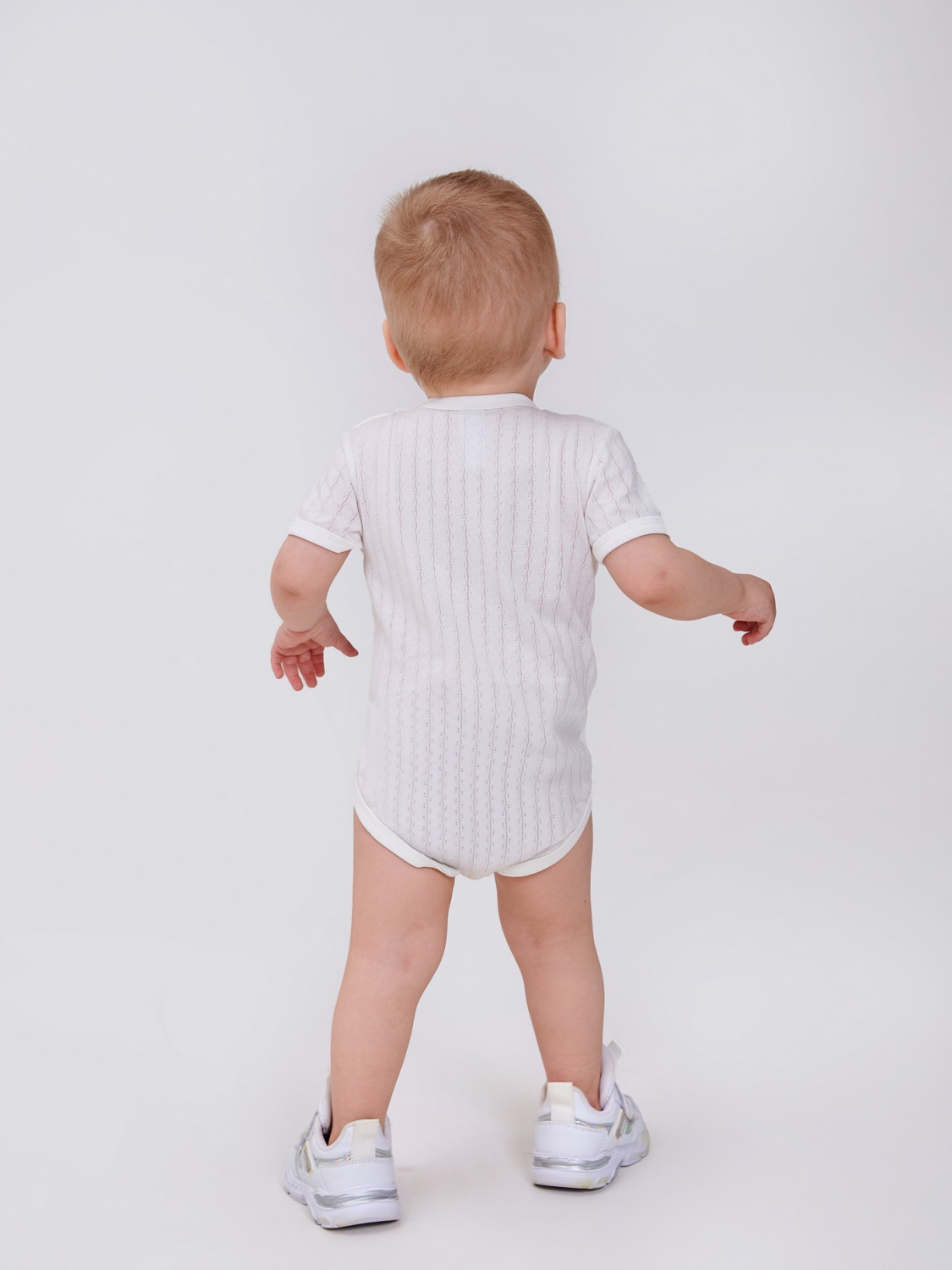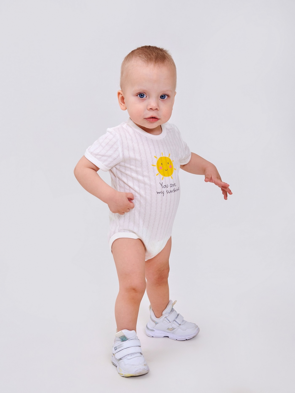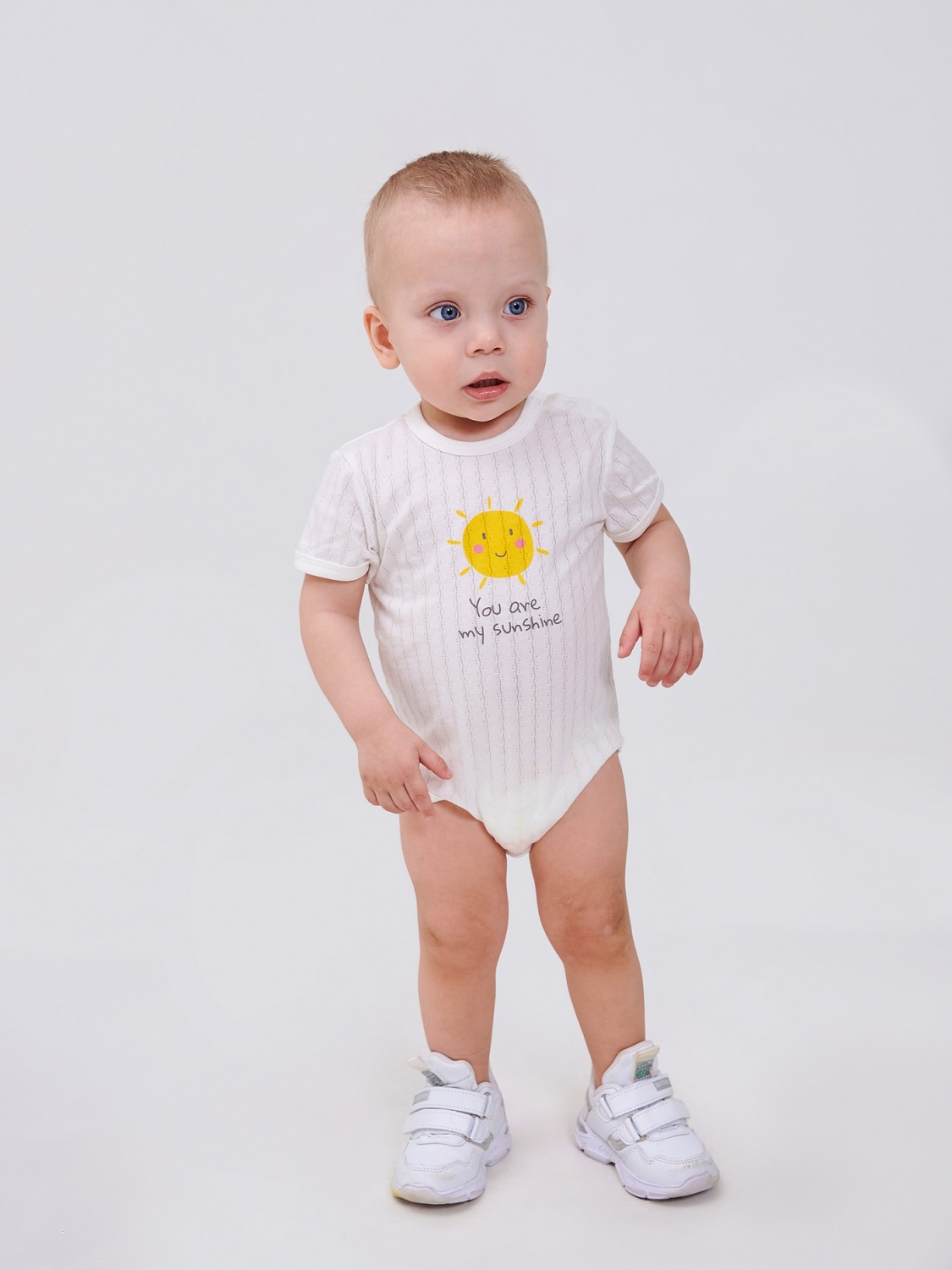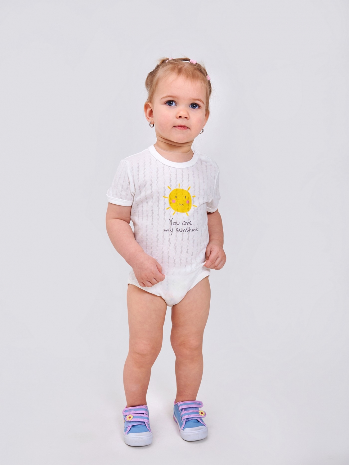 Боді-футболка з м'якого ажурного куліра - ідеальний вибір для теплих днів. Мила пряма печатка додає образу чарівності, а кнопочки на плічках роблять перевдягання швидким і зручним. Легкий, повітряний та стильний, цей боді забезпечить вашому малюку максимальний комфорт!