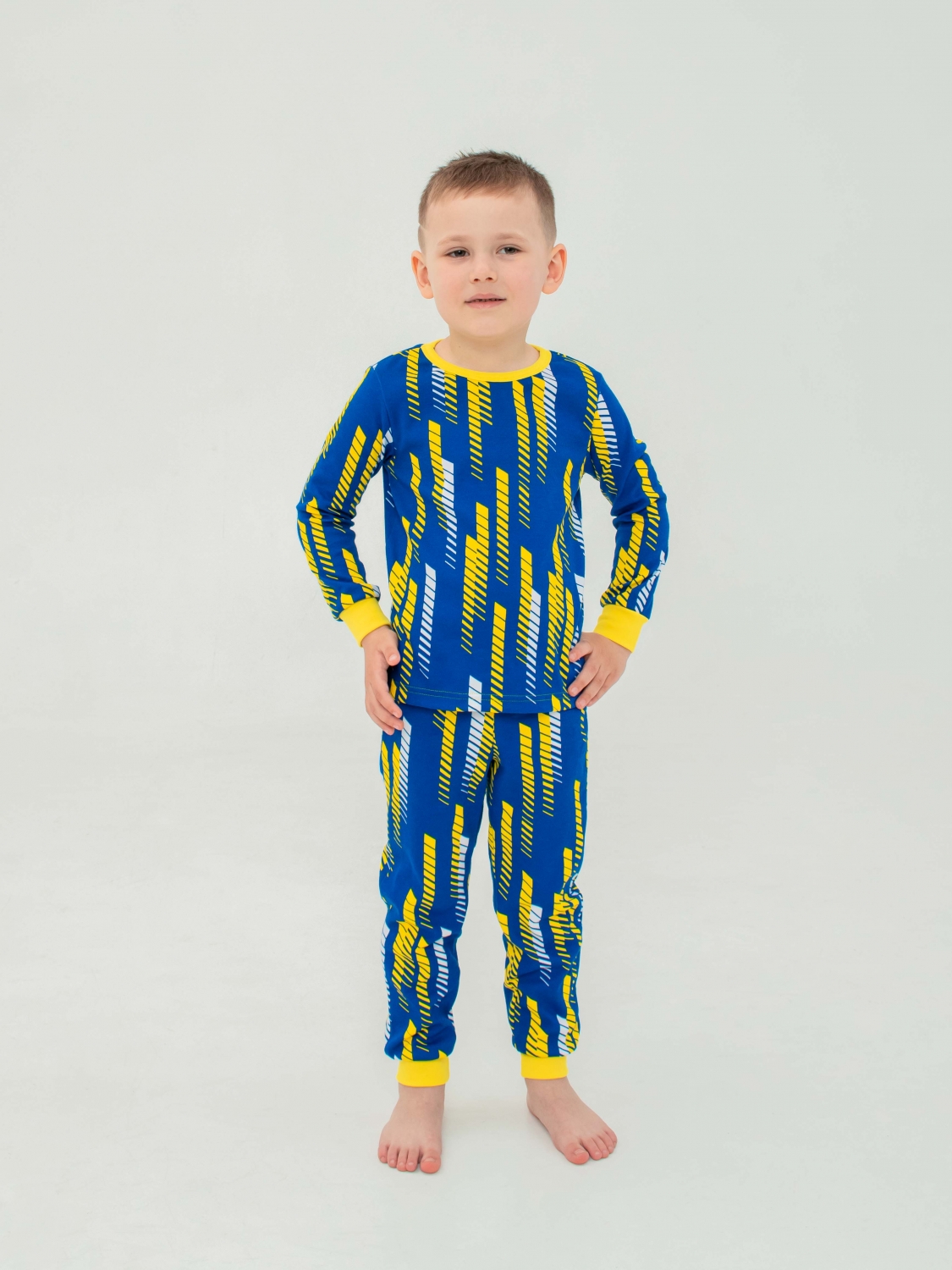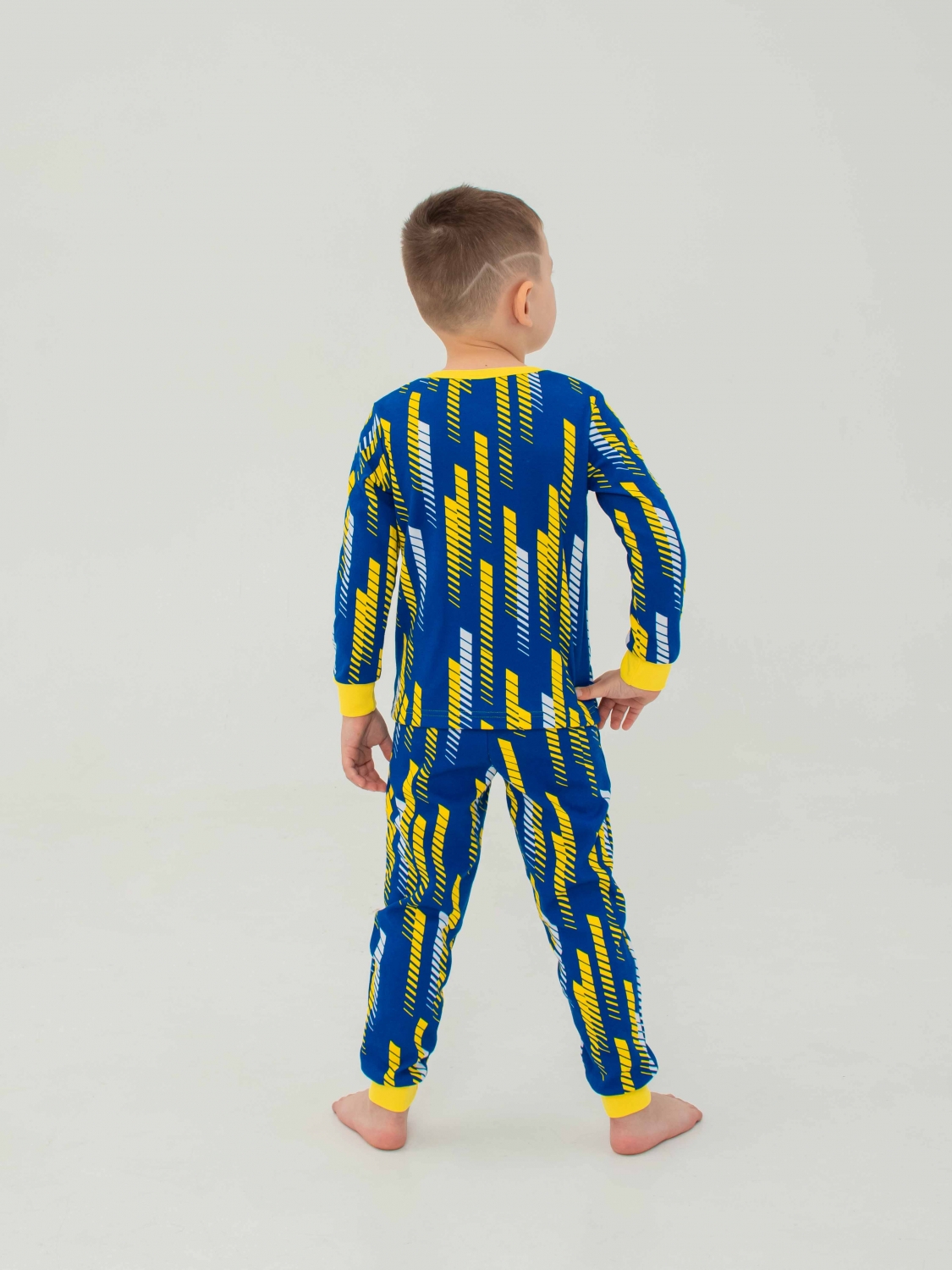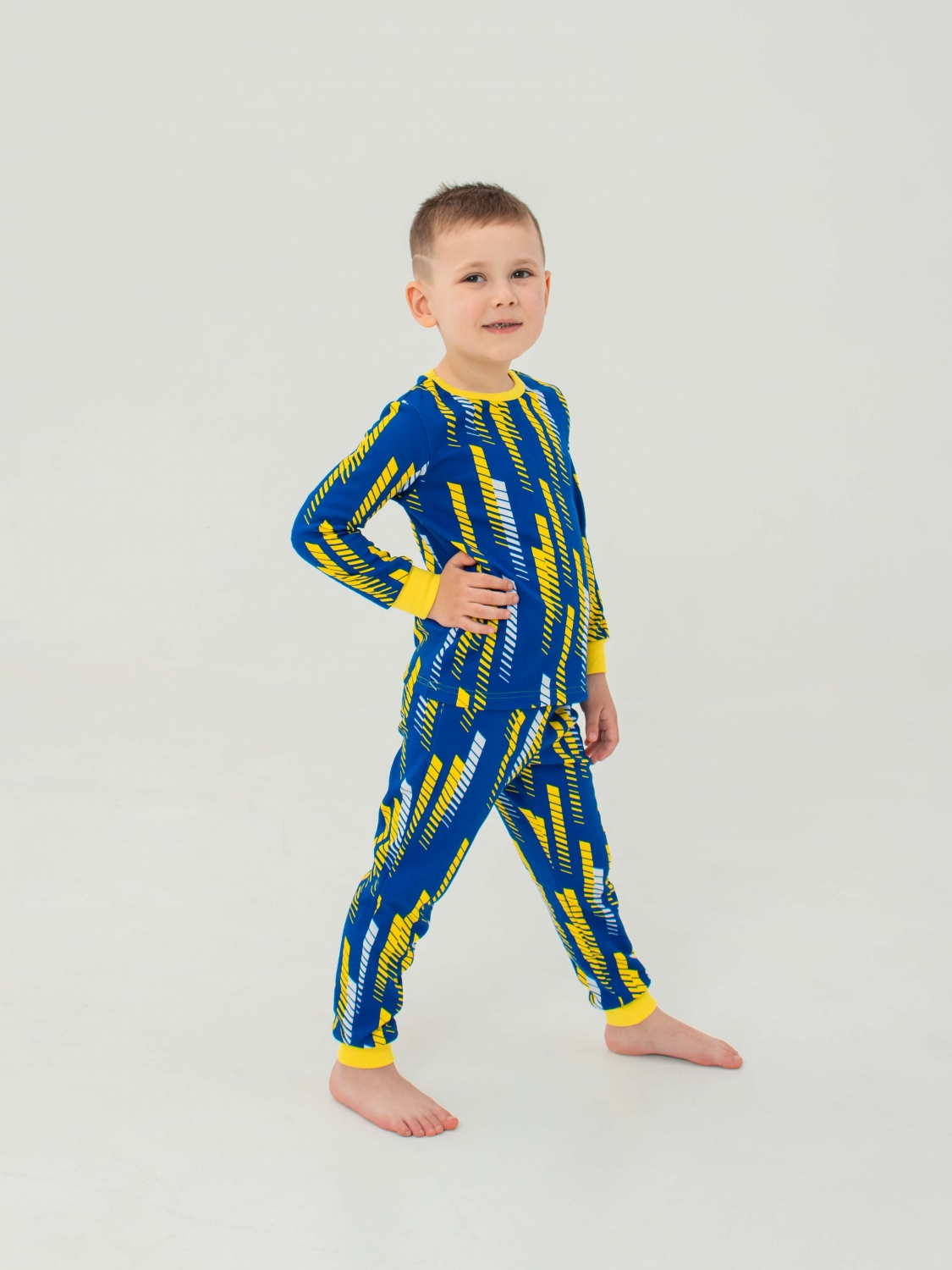 Оригінальний дизайн піжами у вигляді яскравого поєднання синього та жовтого кольорів привертає увагу та створює радісний настрій. Особлива деталь – жовті манжети на рукавах та штанинах – надають піжамі стильного акценту та додають яскравості до загального образу. Це поєднання кольорів робить піжаму ще більш привабливою і незабутньою. Піжама пошита з м'якого та дихального бавовняного полотна інтерлок, що забезпечує максимальний комфорт під час сну та відпочинку.
