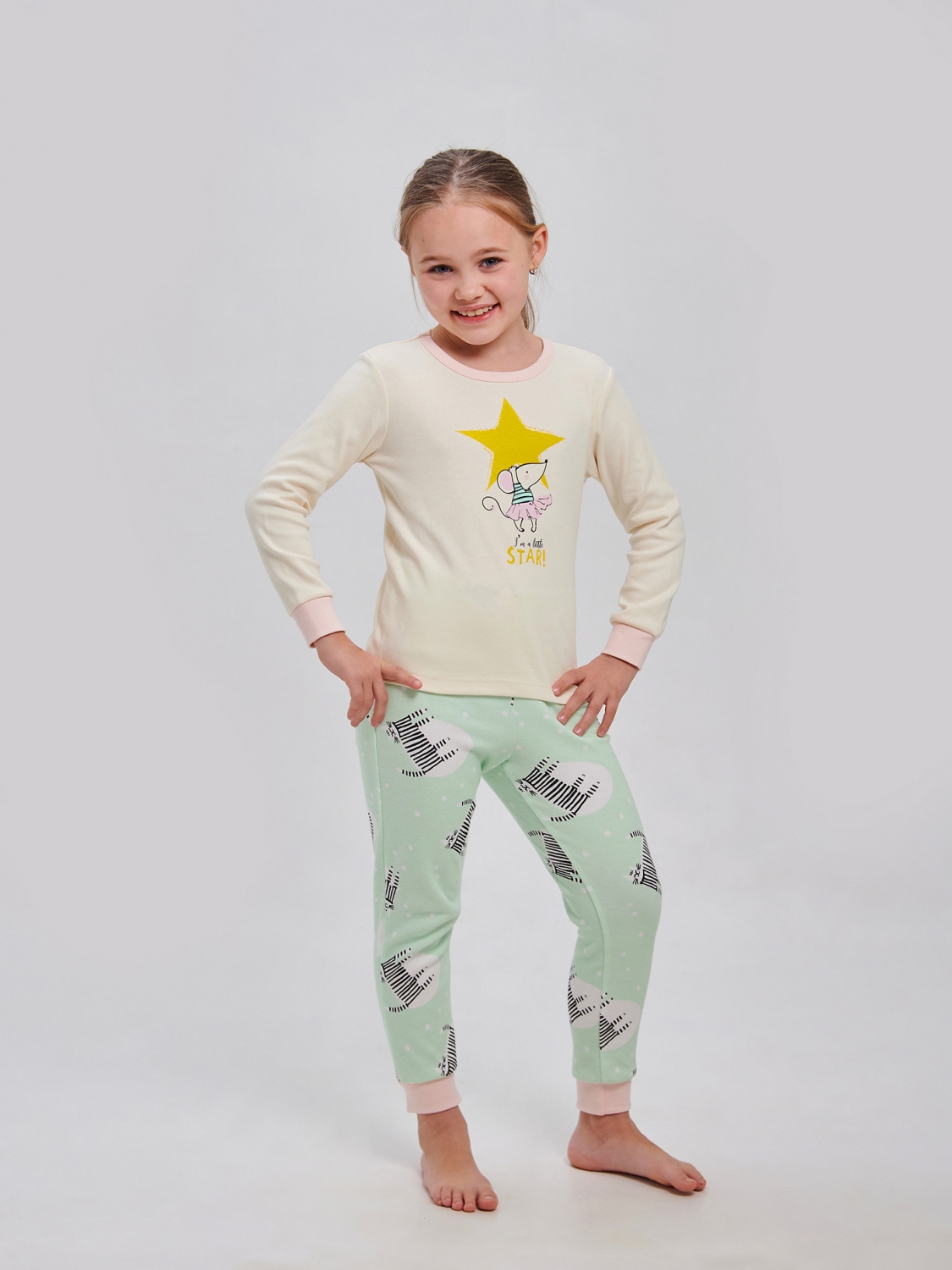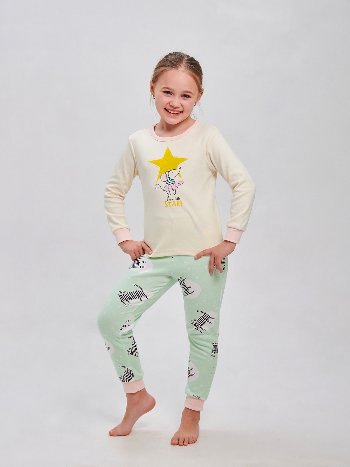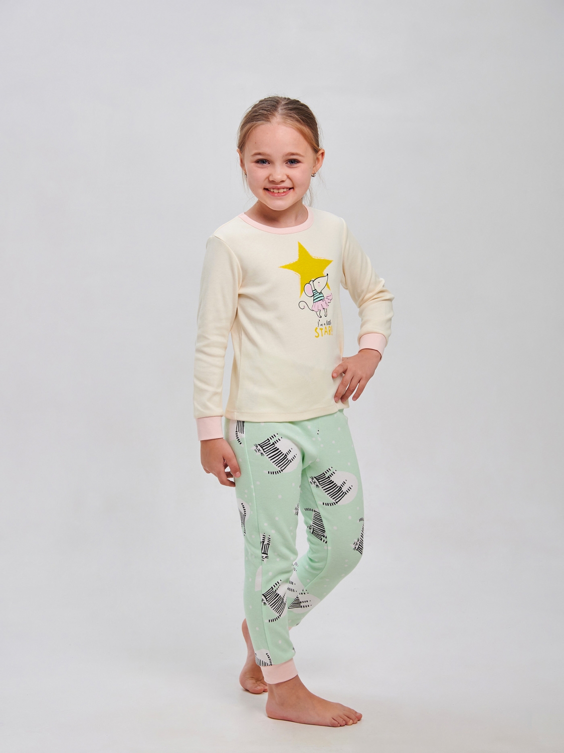 Ніжна молочна піжама для дівчаток із чарівною прямою печаткою мишки із зіркою та написом "I Am a Little Star". Пошита з м'якого інтерлоку, вона забезпечить комфорт і затишок вашій дитині на всю ніч. Нехай кожна ніч буде чарівною з цією піжамою для маленьких зірочок!