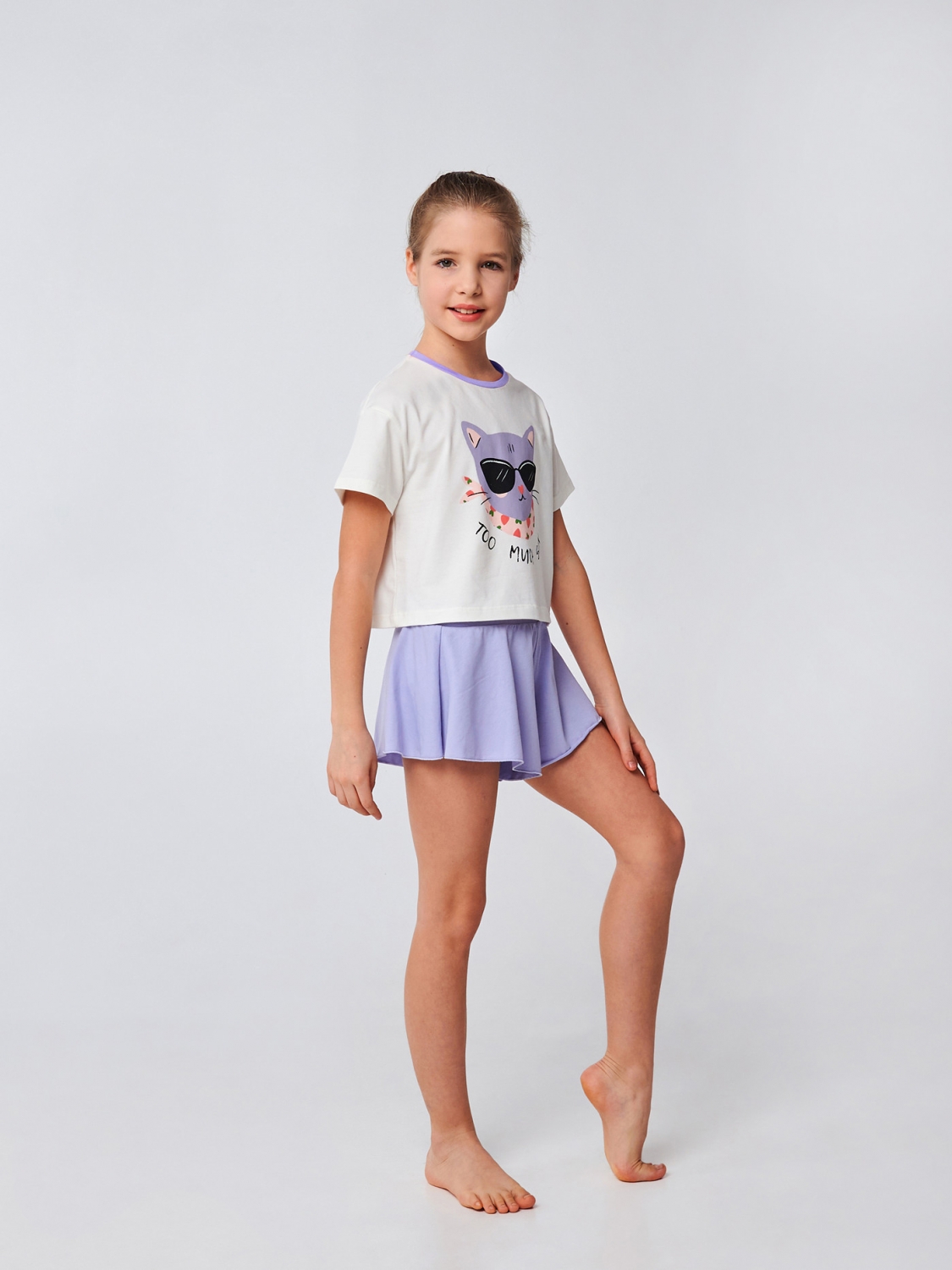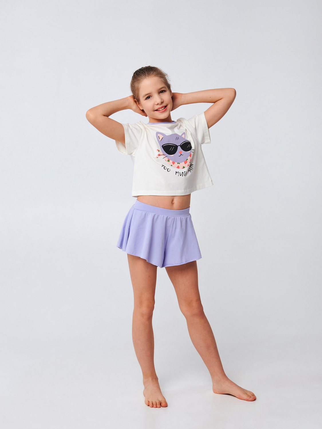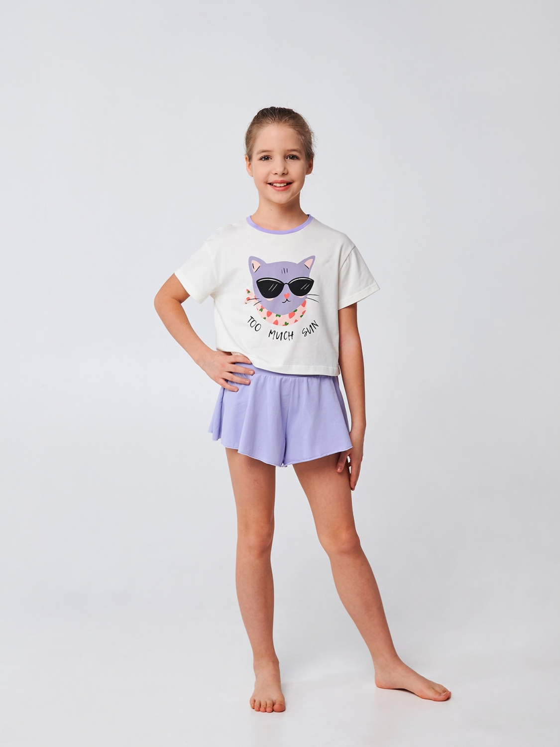 Молочна футболка та волошкові шорти створюють ніжний та свіжий образ. Прямий друк котика в сонячних окулярах і напис 'Too Much Sun' додають піжамі грайливості та створюють атмосферу літніх веселощів. Пошита з м'якого стрейчевого куліра, піжама забезпечить вашій дівчинці максимальний комфорт та свободу руху під час сну чи ігор. Дозвольте вашій маленькій модниці насолоджуватися кожним моментом у затишній та стильній піжамі!