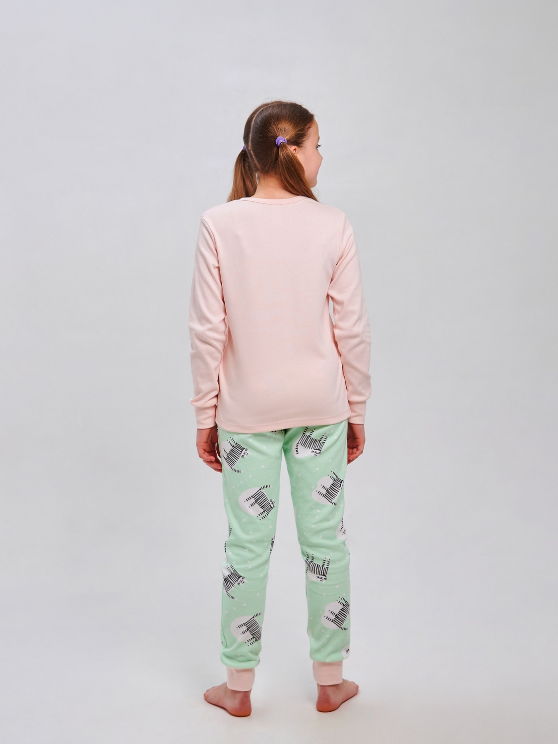 Чарівна ніжно-рожева піжама для дівчаток із прямою печаткою чорно-білої кішечки. Пошита з м'якого та приємного на дотик інтерлоку, вона подарує вашій дівчинці комфорт та затишок під час сну. Нехай щоранку починається з посмішки завдяки цій милій піжамі!