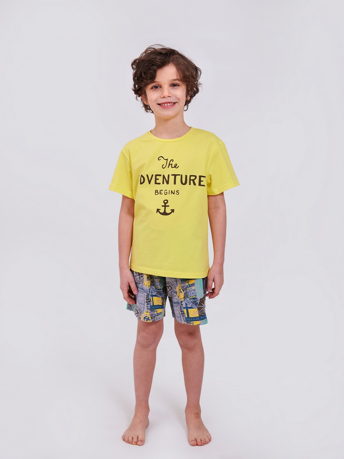 Літня піжама для хлопчика складається з футболки та шортів – ідеальний дует для комфортного сну! Прямий друк "ADVENTURE" - нехай щоночі починаються нові літні пригоди навіть уві сні! Стрейчевий кулір — м'яке полотно, що зручне в спекотні ночі.