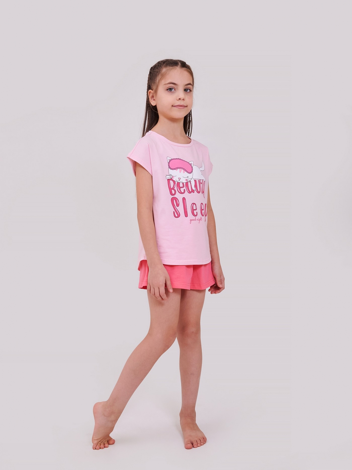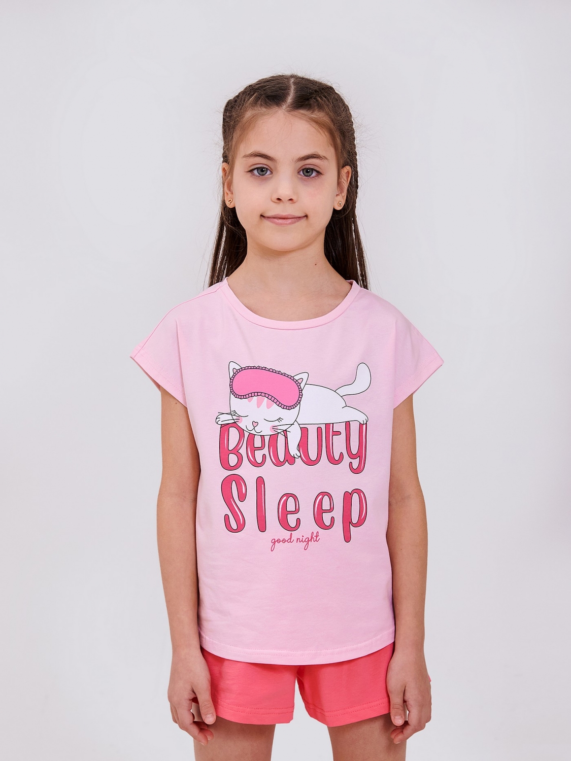 Наймиліший сон у стильній піжамі для дівчинки! Зручна футболка та легкі шортики – комфорт на всю ніч! Прямий друк "Beauty Sleep" і кумедна кішечка - зручно грати, веселитися і солодко засинати! Стрейчеве кулірне полотно – м'якість та легкість для теплих ночей.