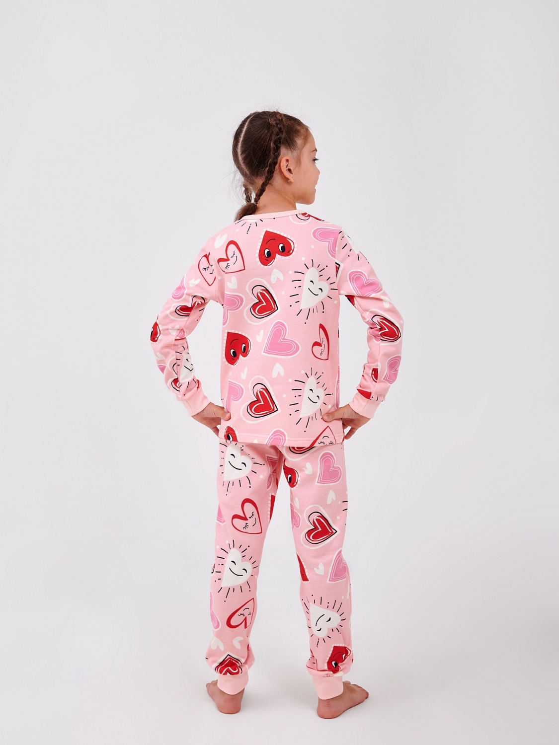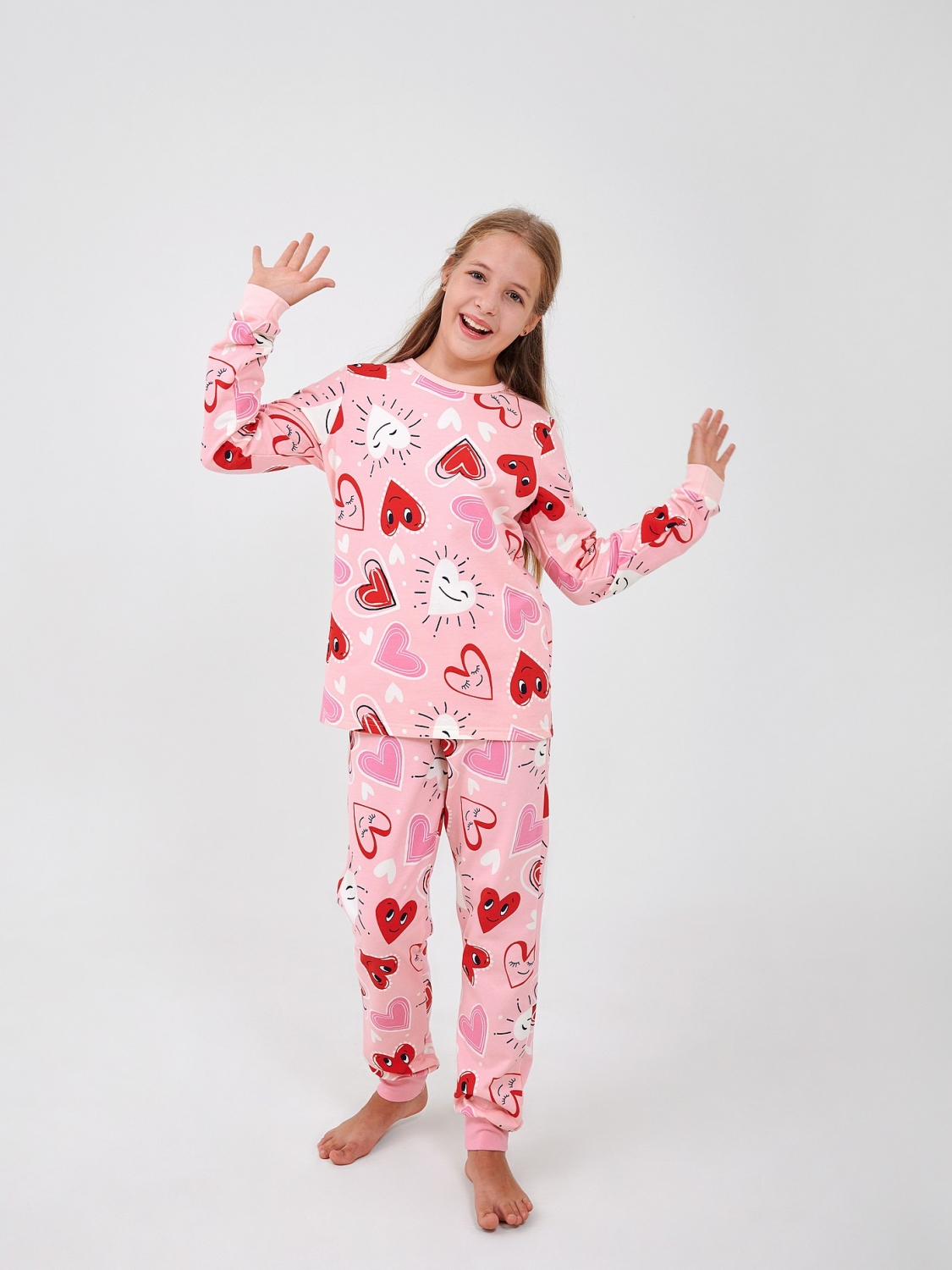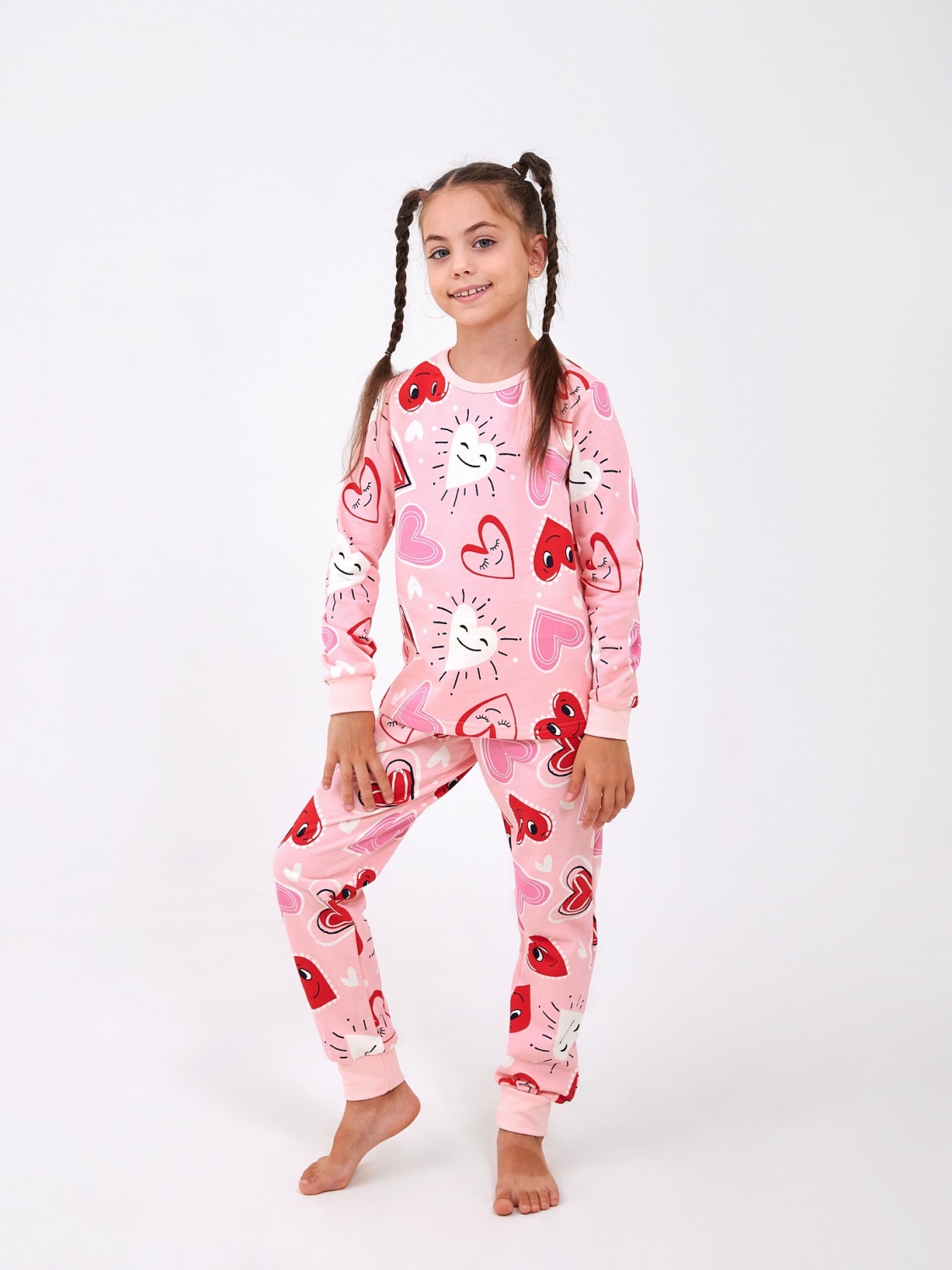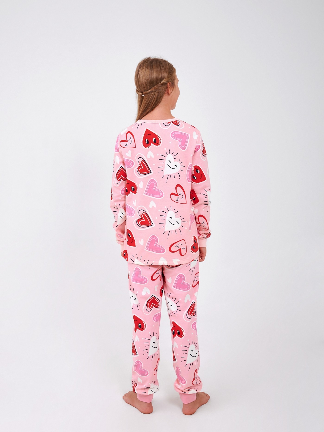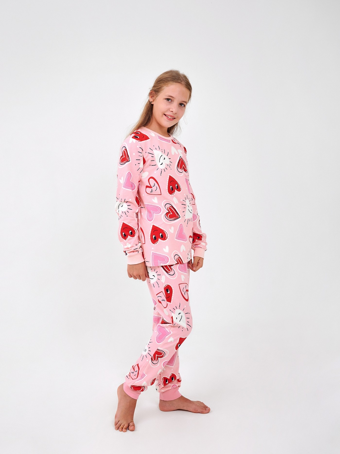 Затишна дитяча піжама з футера з начосом - ідеальний вибір для прохолодних вечорів та солодких снів. М'яке полотно дбайливо зігріває і дарує комфорт, а кумедний принт із милими сердечками створює настрій ніжності та радості. Манжети на рукавах і штанях забезпечують зручну посадку та тепло всю ніч.