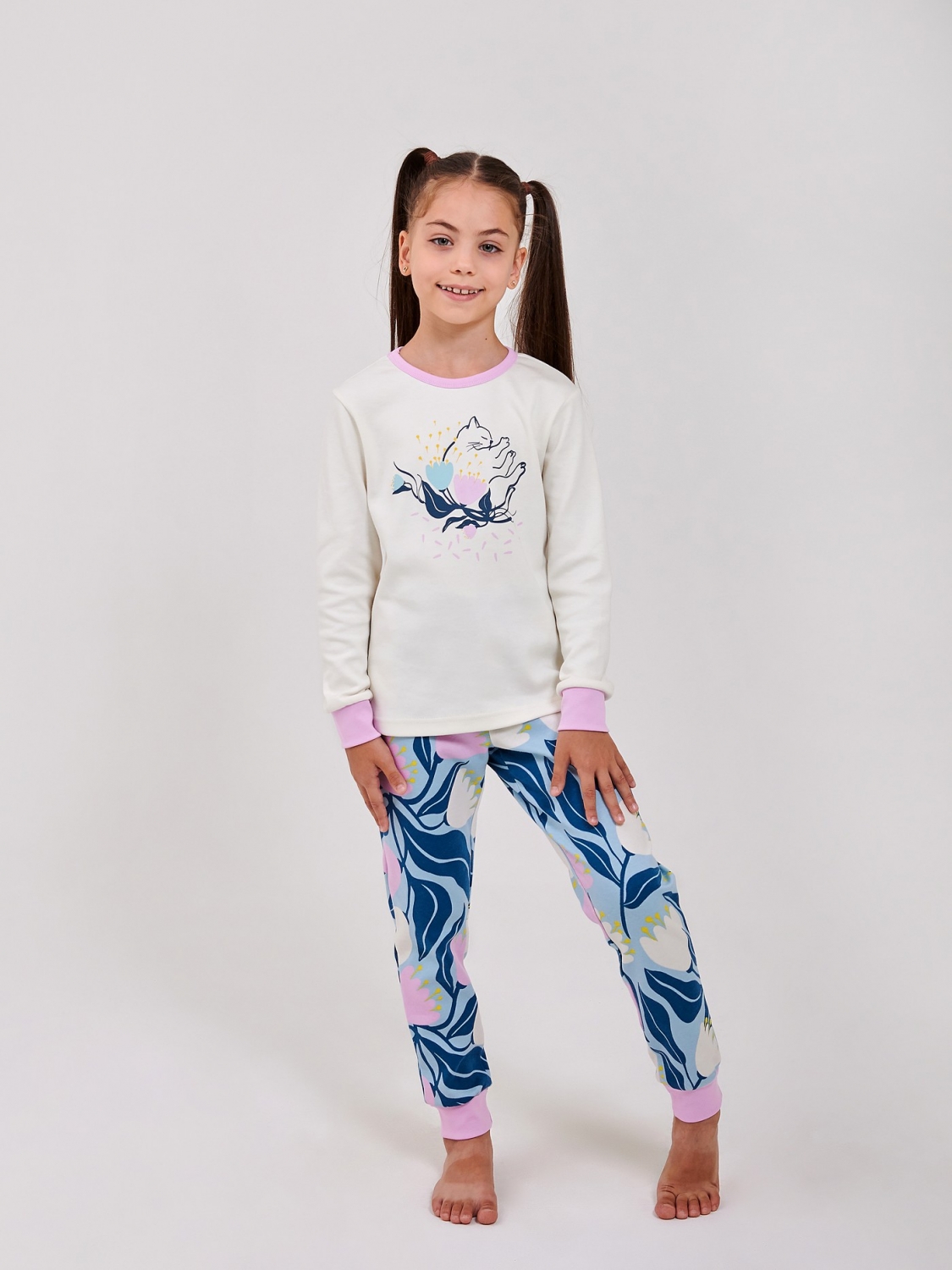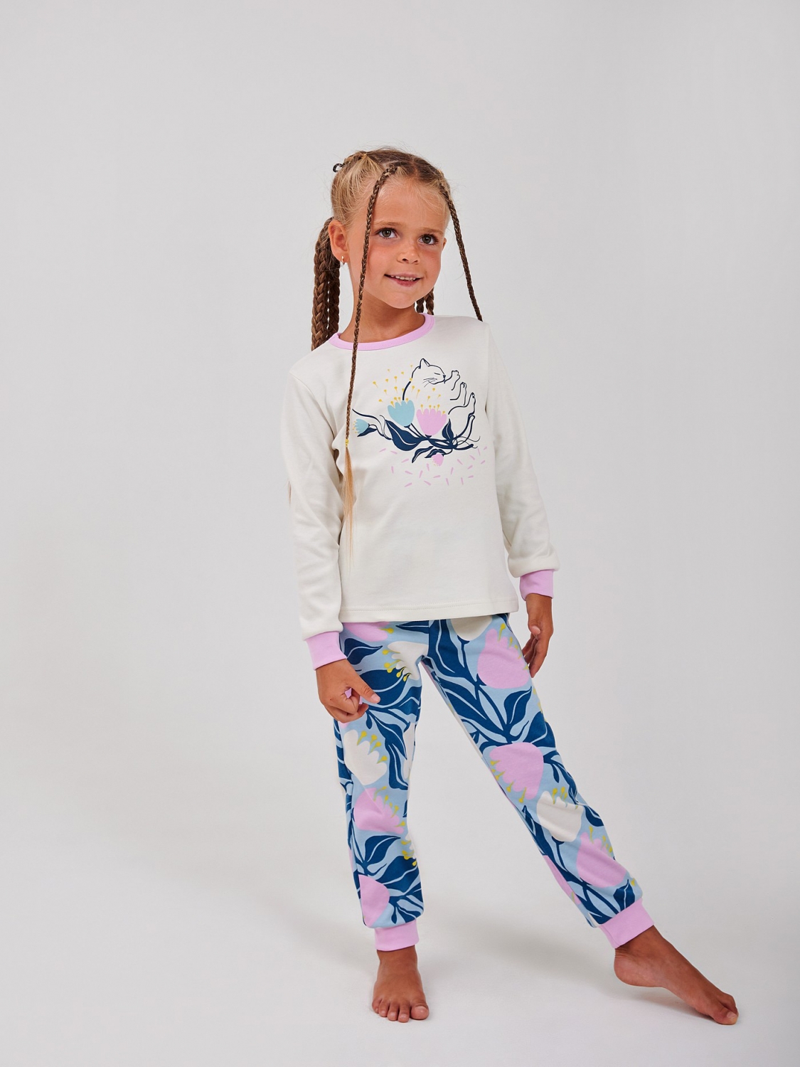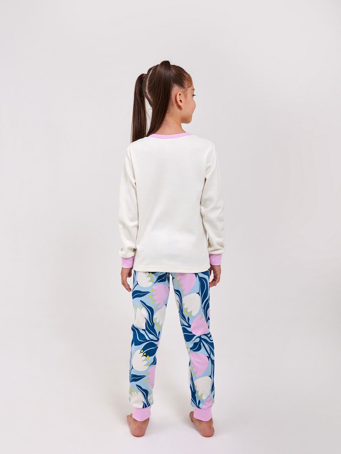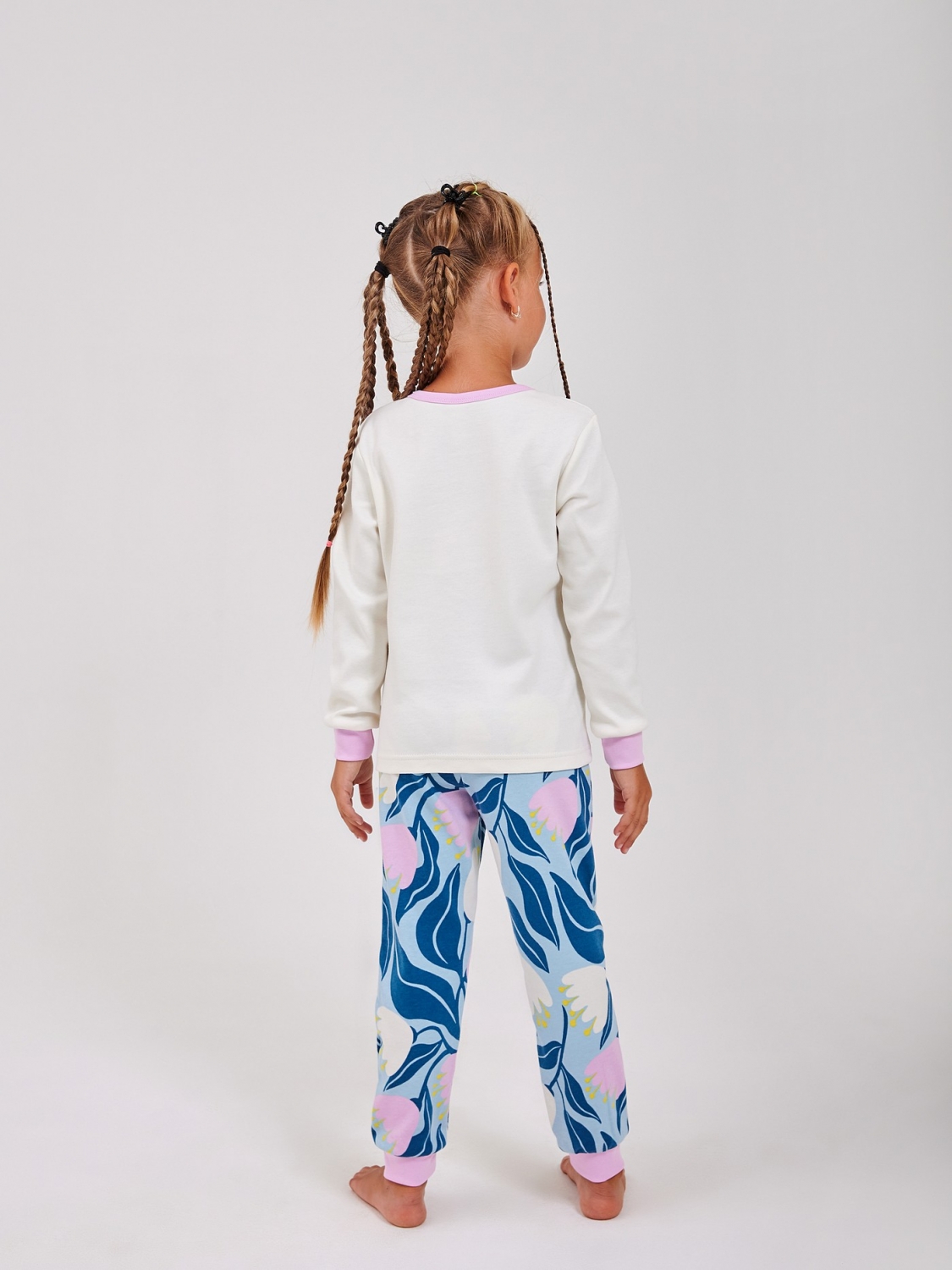 Піжама для дівчинки - комфортні сни та яскраві мрії! Ніжна молочна кофта з милим принтом та штани з яскравим квітковим візерунком створюють ідеальний настрій для сну та домашнього затишку. М'яке полотно інтерлок дарує комфорт та тепло, а еластичні манжети забезпечують зручну посадку. Піжама, в якій так приємно мріяти та прокидатися з усмішкою!