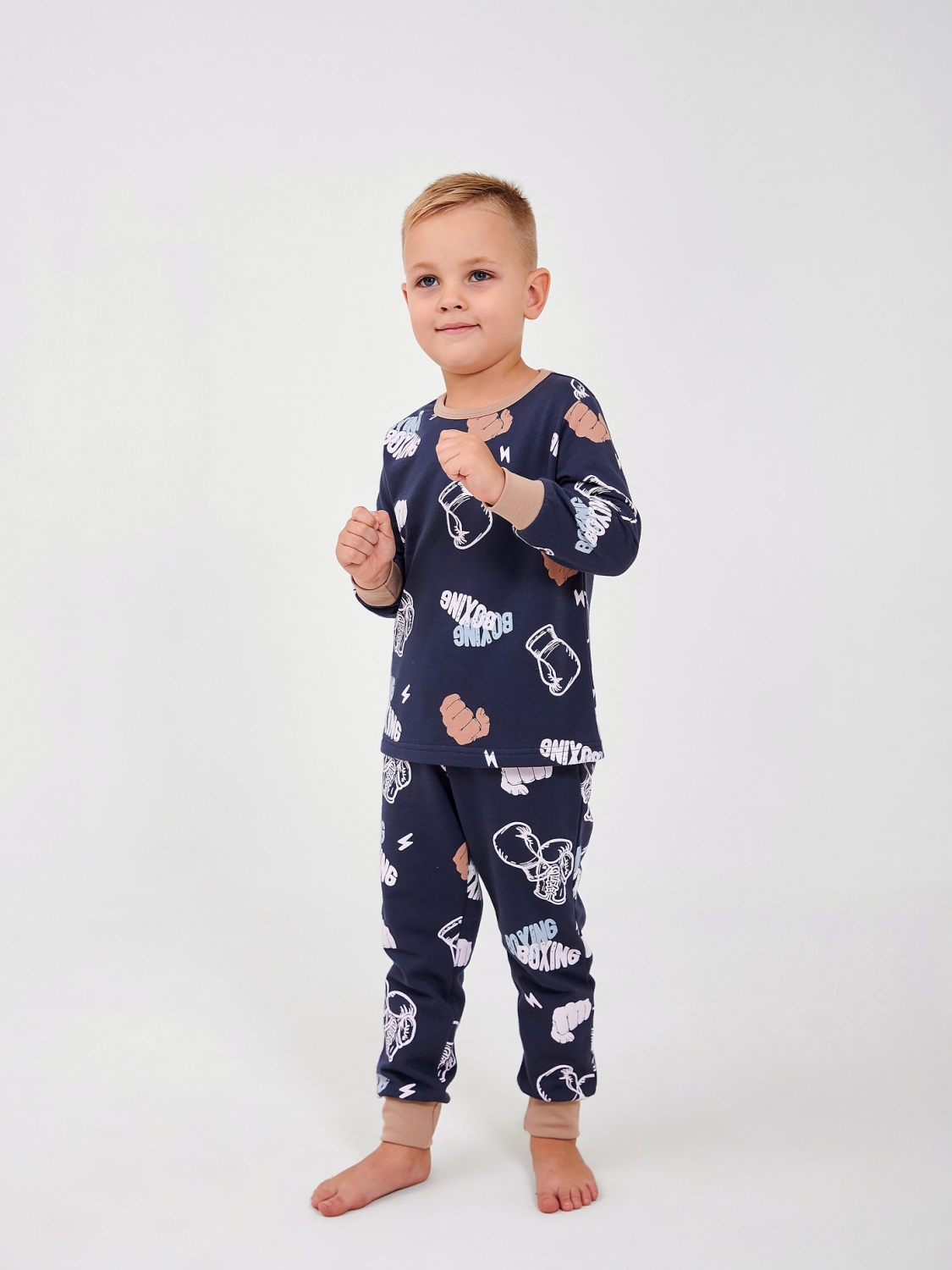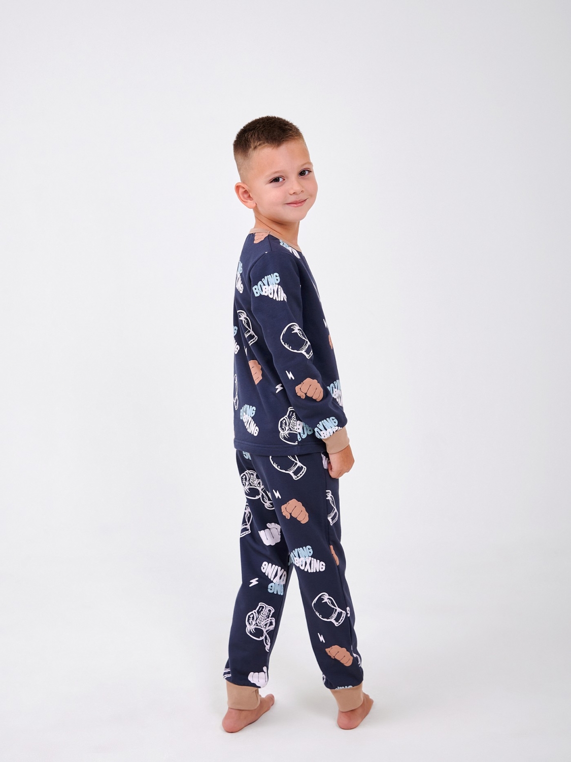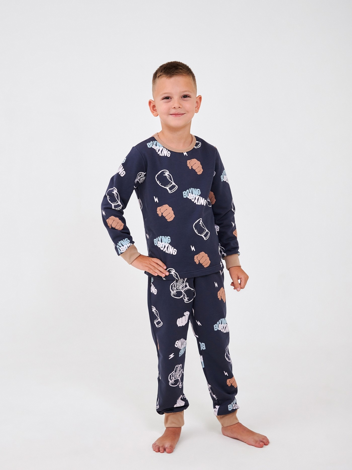 Стильна дитяча піжама для хлопчика з футера з начосом - тепло, комфорт та свобода рухів. М'яке полотно дбайливо зігріває, манжети на рукавах і штанинах фіксують посадку, а яскравий принт з боксерськими рукавичками та написами додає енергії та драйву маленьким чемпіонам!