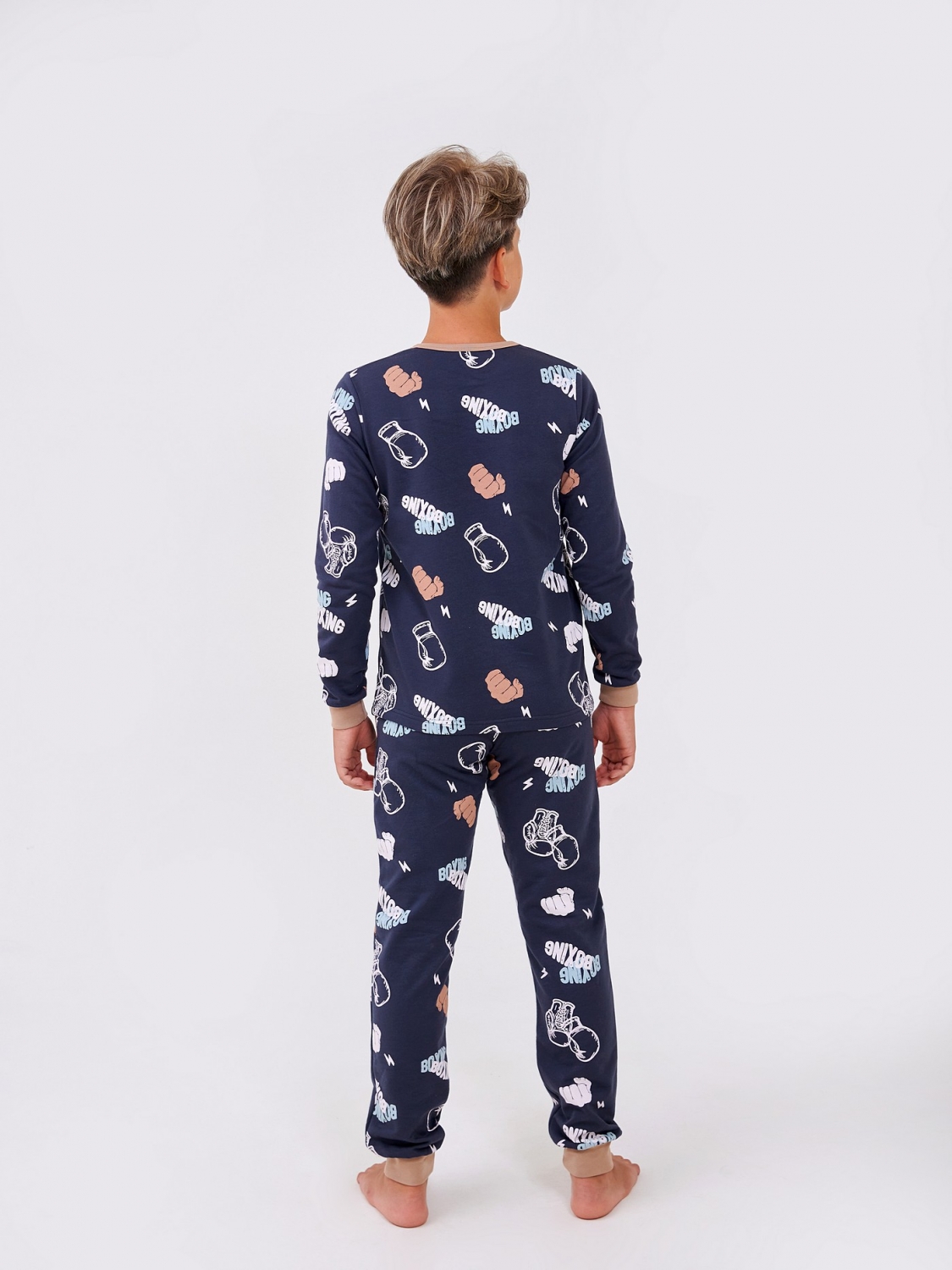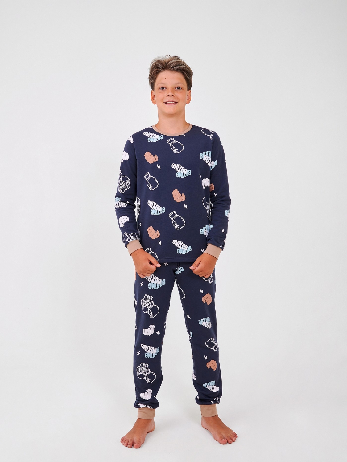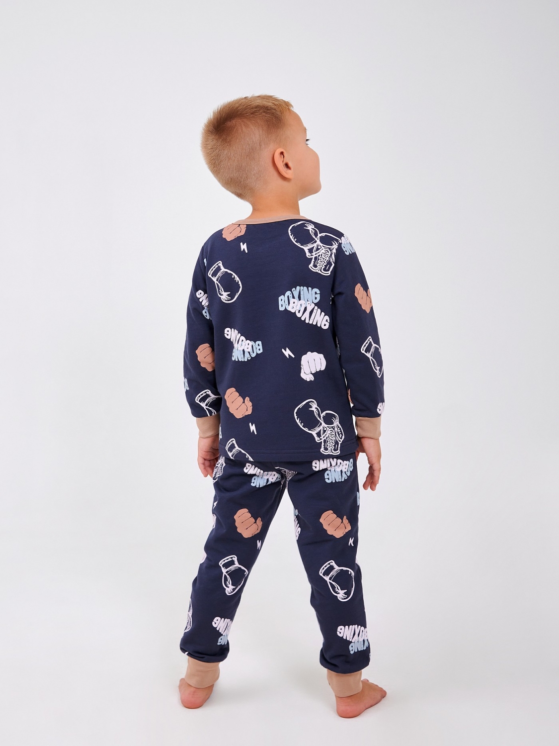 Стильна дитяча піжама для хлопчика з футера з начосом - тепло, комфорт та свобода рухів. М'яке полотно дбайливо зігріває, манжети на рукавах і штанинах фіксують посадку, а яскравий принт з боксерськими рукавичками та написами додає енергії та драйву маленьким чемпіонам!