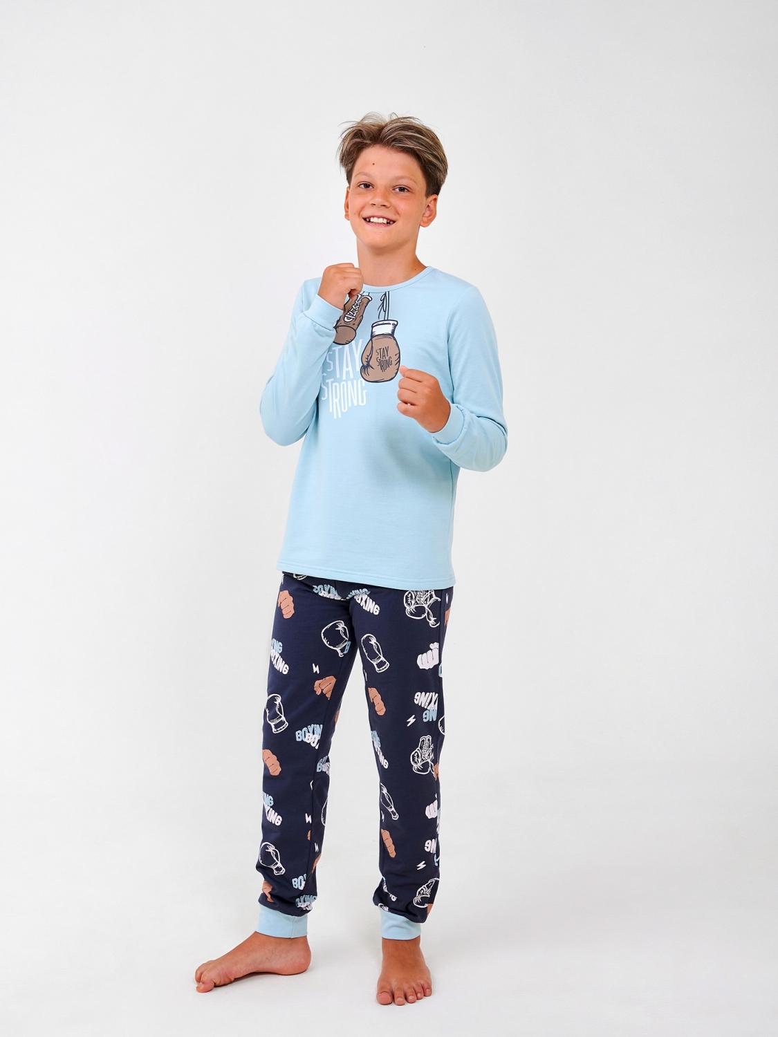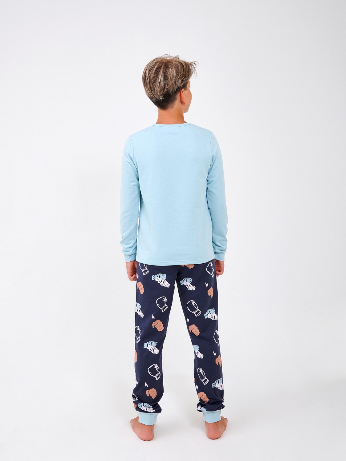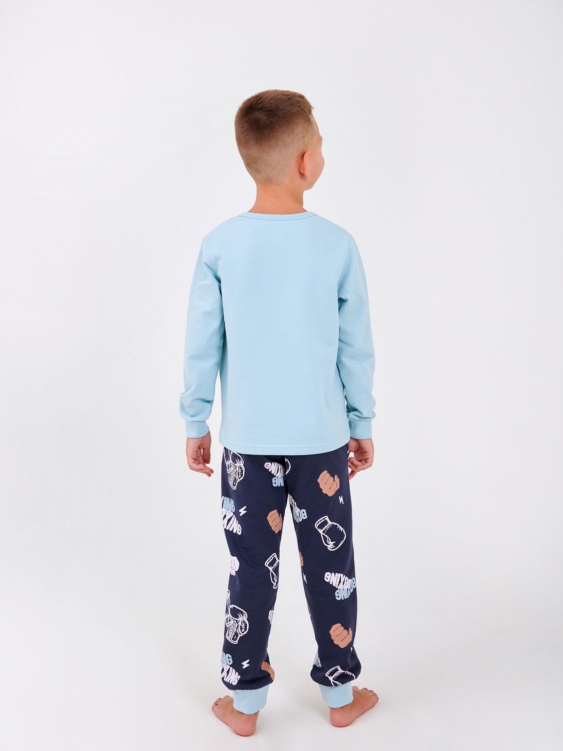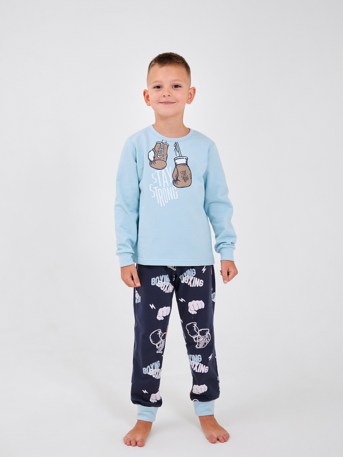 Стильна дитяча піжама для хлопчика з футера з начосом - тепло, комфорт та свобода рухів. М'яке полотно дбайливо зігріває, манжети на рукавах і штанинах фіксують посадку, а яскравий принт з боксерськими рукавичками та написами додає енергії та драйву маленьким чемпіонам!