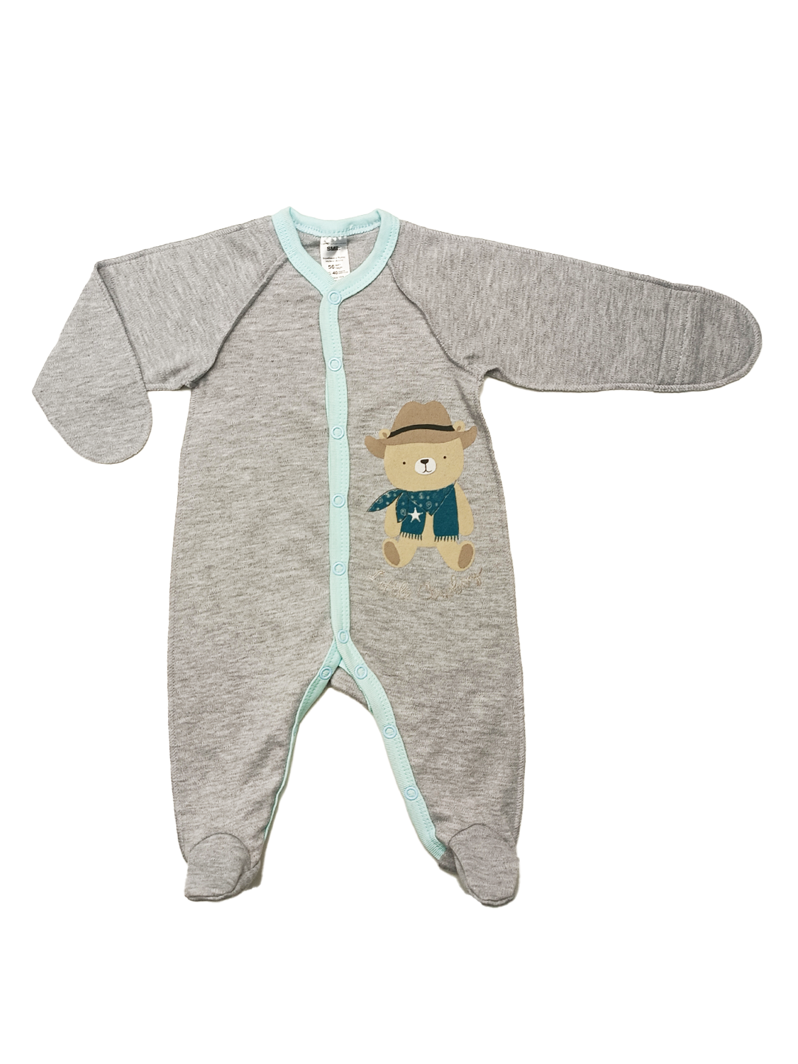 Колір сірий меланж практичний та сучасний. Прямий друк хороброго ведмедика-ковбоя робить цей комбінезон унікальним та стильним. Ми розуміємо, що шкіра новонародженого малюка особливо чутлива, тому вибрали бавовняне полотно інтерлок для наших комбінезонів. Воно має чудові гіпоалергенні властивості, забезпечує хорошу вентиляцію і приємне відчуття на тілі. Уздовж всього комбінезону розміщені кнопки, що полегшує його вдягання та зняття. Крім того, комбінезон має закриті ручки, що запобігають можливим подряпинам і забезпечують додаткове тепло для вашого малюка.