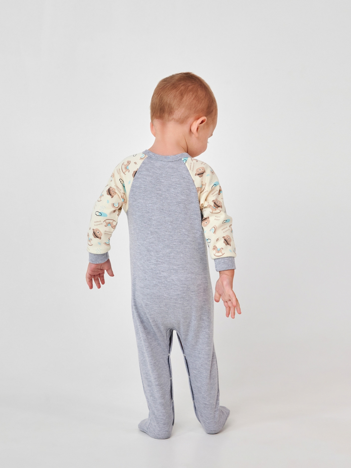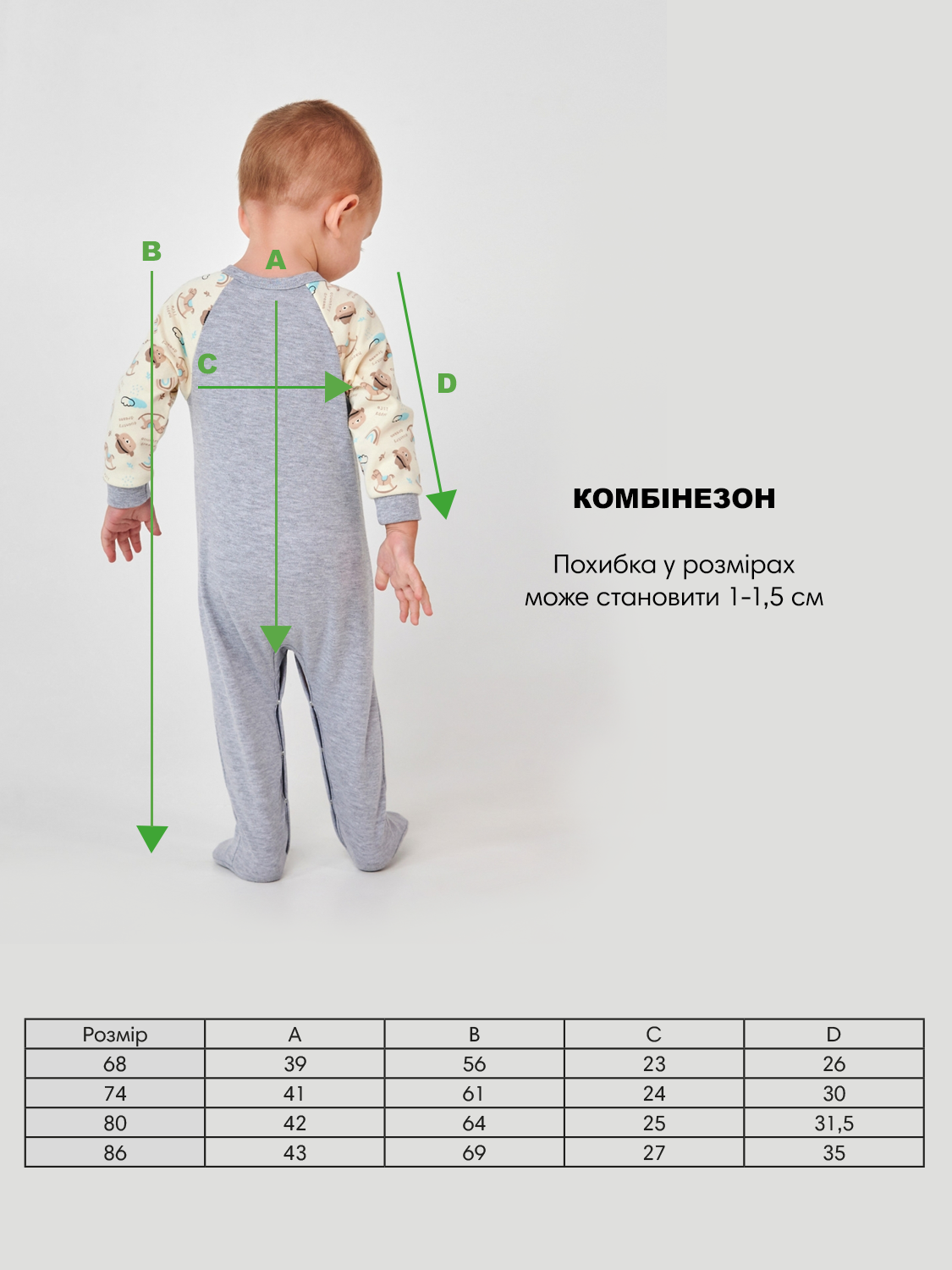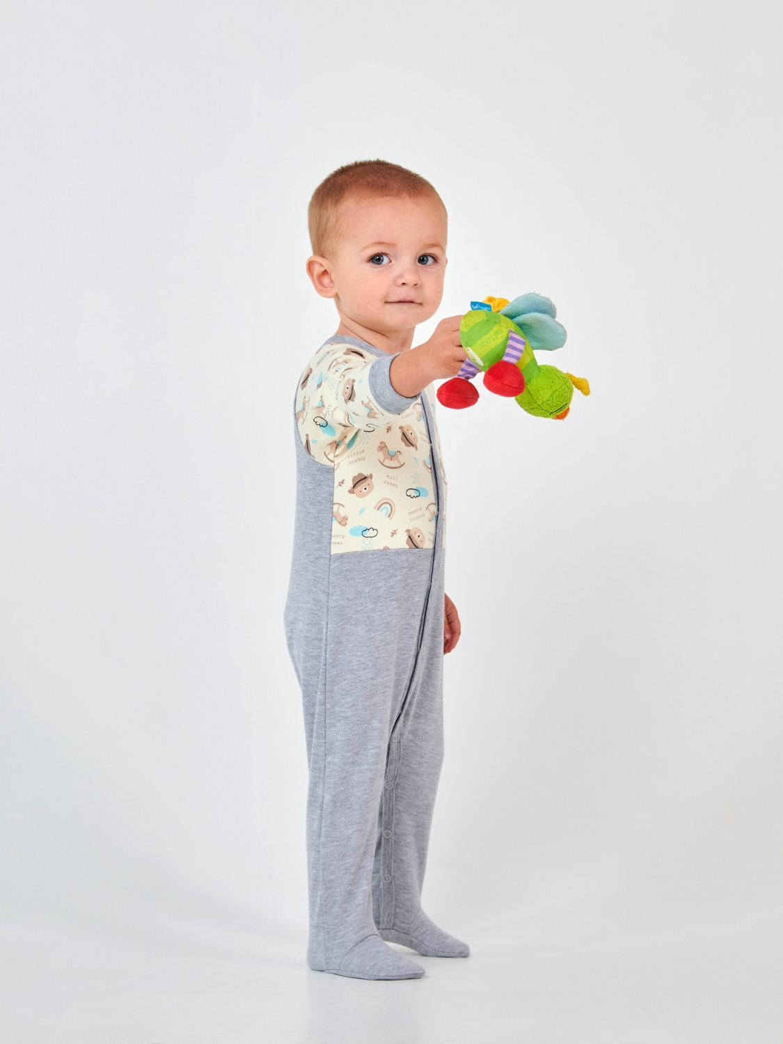 Цей комбінезон поєднує стиль сірого меланжу і милий малюнок ведмедиків- ковбоїв, створюючи неповторний вигляд вашого малюка. Закриті ніжки та манжети на ручках забезпечують тепло та комфорт. Кнопки по всій довжині роблять цей комбінезон зручним та практичним для дбайливих батьків. Вибирайте якість та індивідуальність - тому що ваш малюк заслуговує тільки кращого!