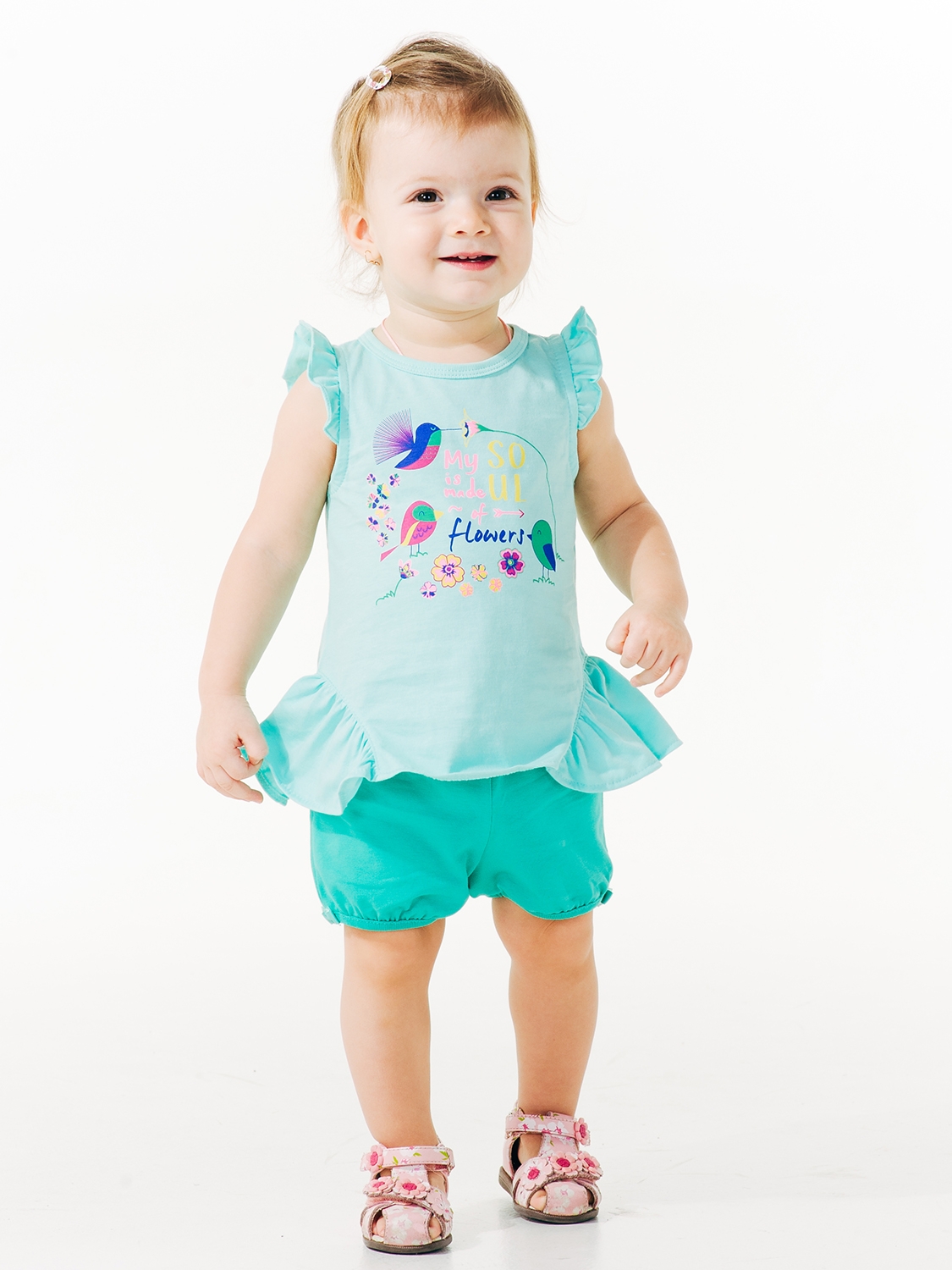 Туніка у м'ятному кольорі без рукавів розрахована для активних малюків, які люблять багато часу проводити на свіжому повітрі. Для пошиття використовувався досить міцний та зносостійкий кулір, який не перешкоджає повітрообміну. Туніка декорована рюшами, а також яскравим принтом у вигляді пташок та квіточок. Її можна комбінувати із шортиками та лосинами, створюючи стильні образи на кожен день.