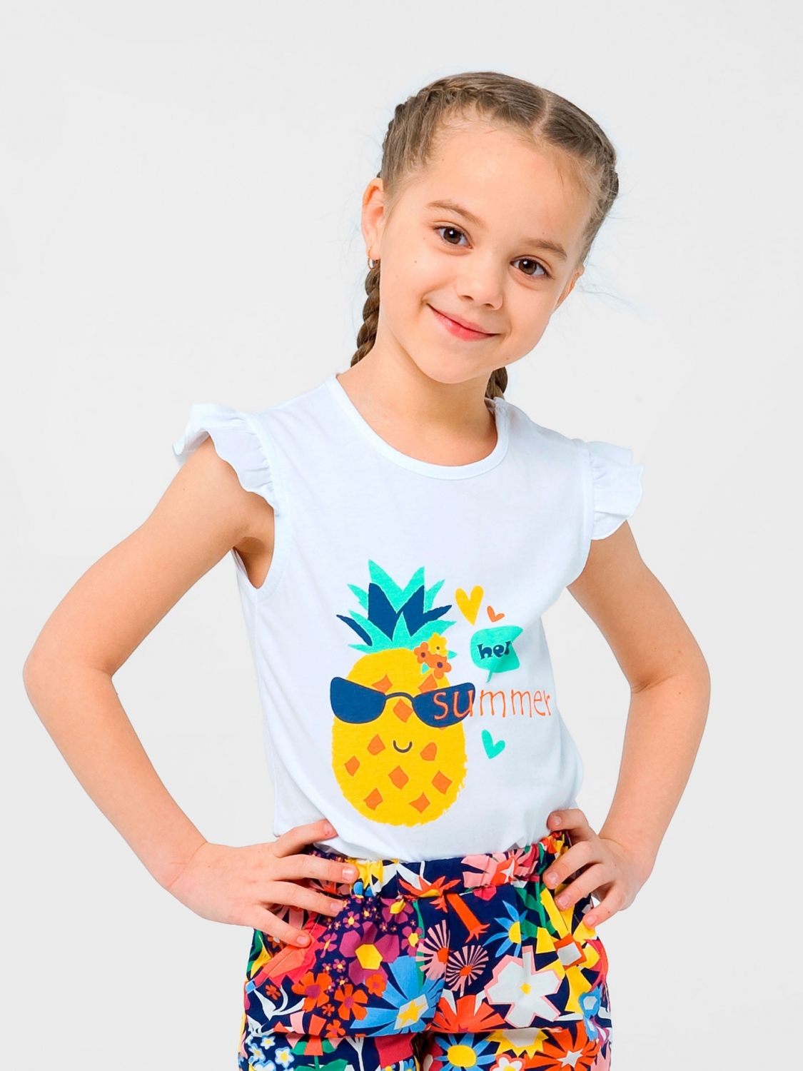 Стильна майка з рукавами-метеликами, пошита з бавовняної матеріалу, підійде дитині у віці 6-18 місяців. Цей наряд можна надягати на прогулянки або в гості. Виріб виконаний з якісного білого кулір, який приємно відчувається на тілі. Головною родзинкою можна вважати яскравий принт у вигляді жовтого ананаса і невеликий написи, які нанесені методом прямого друку.