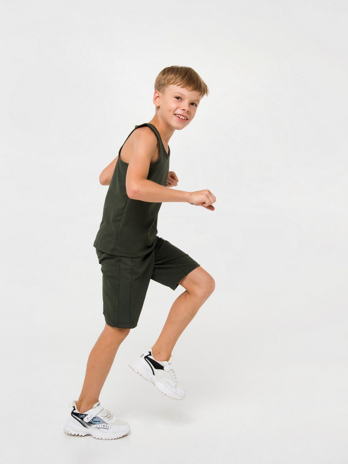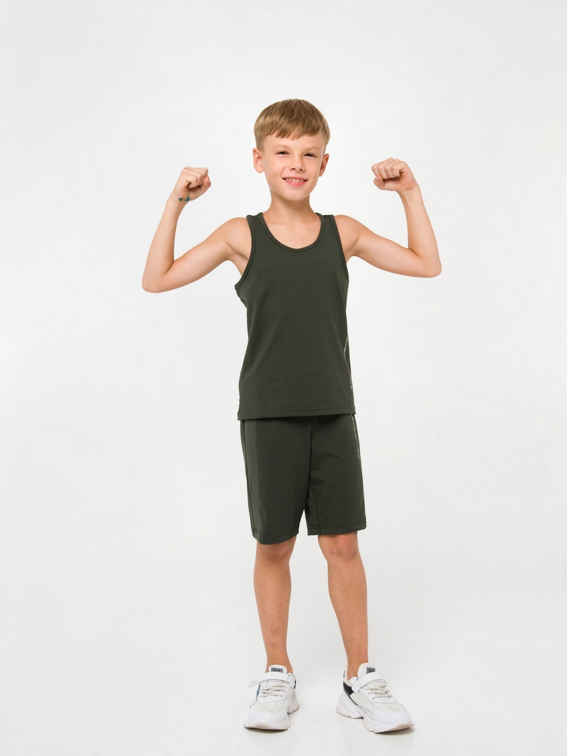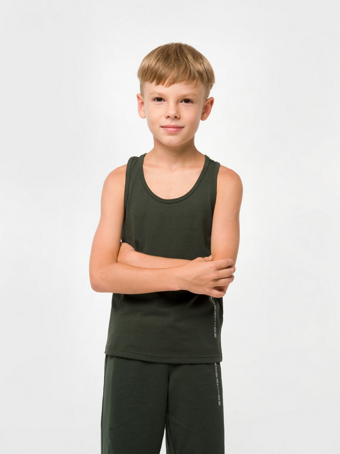 Лаконічна футболка кольору хакі буде добре виглядати з шортами і штанами. У такому образі хлопчик зможе відправитися на прогулянку або на фізкультуру. Для пошиття використовувався м'який стрейчевий кулир, який не перешкоджає повітрообміну і швидко вбирає вологу. Майка прикрашена невеликий наклейкою у вигляді напису білого кольору, який був нанесений методом прямого друку.