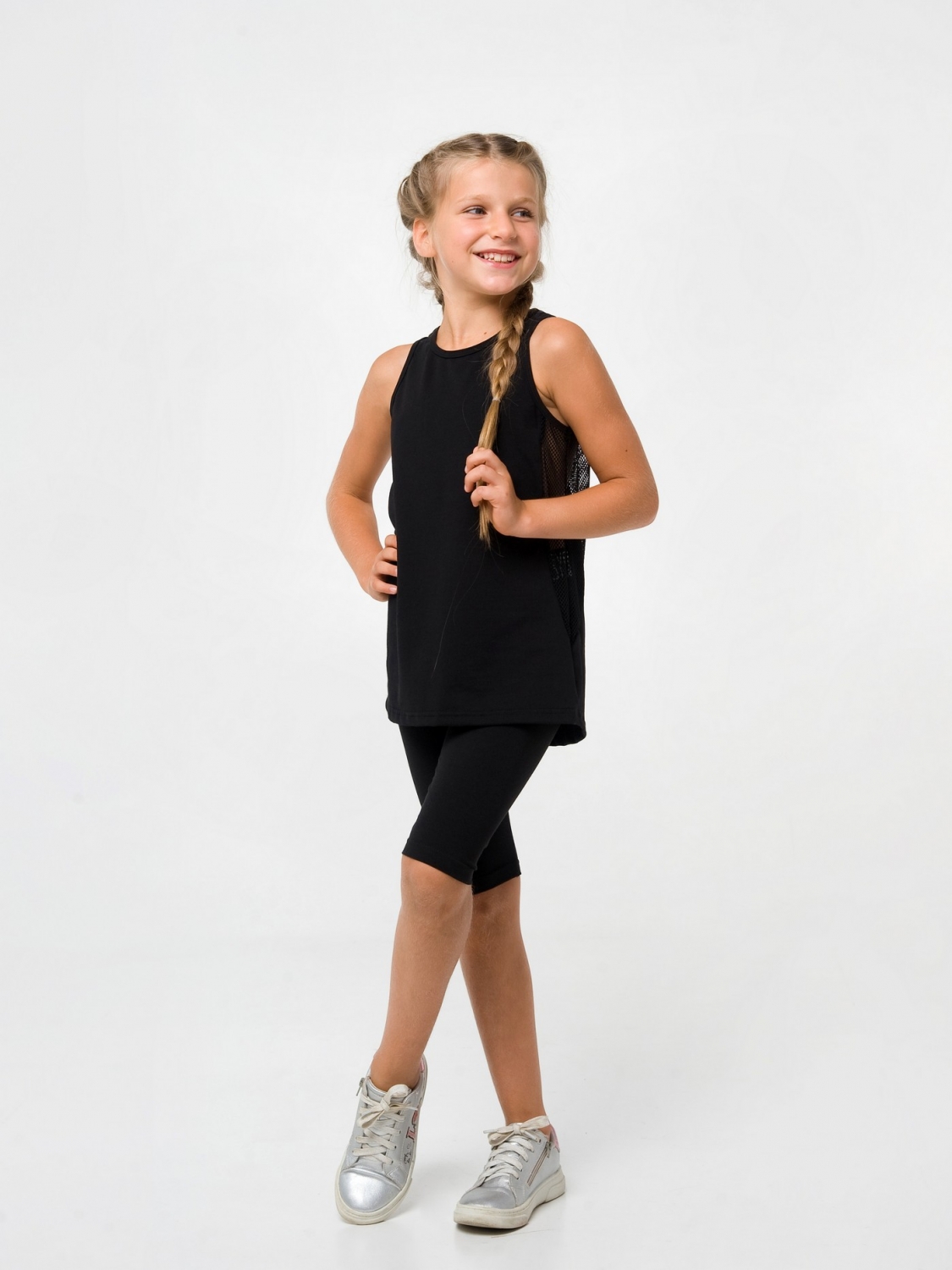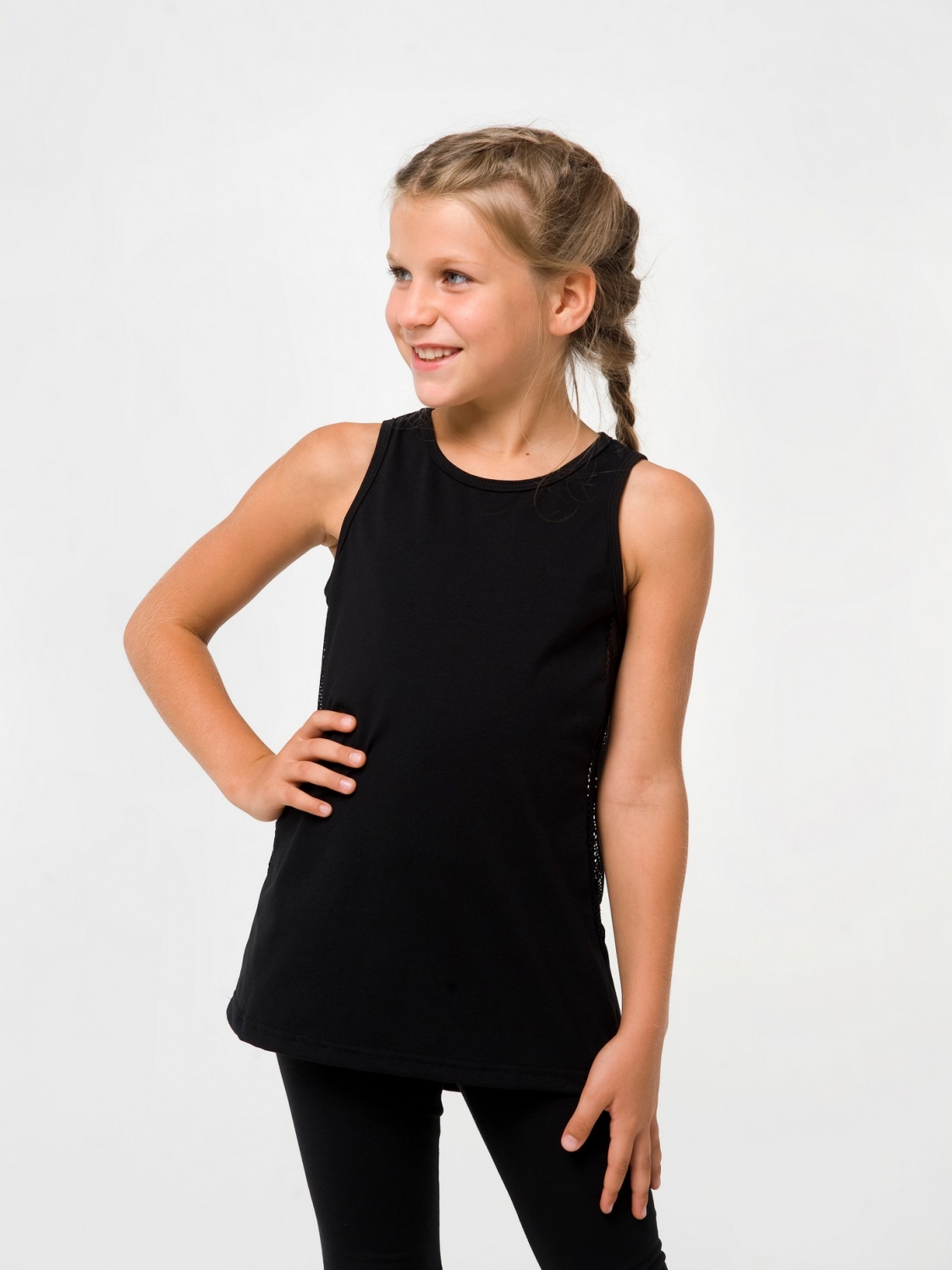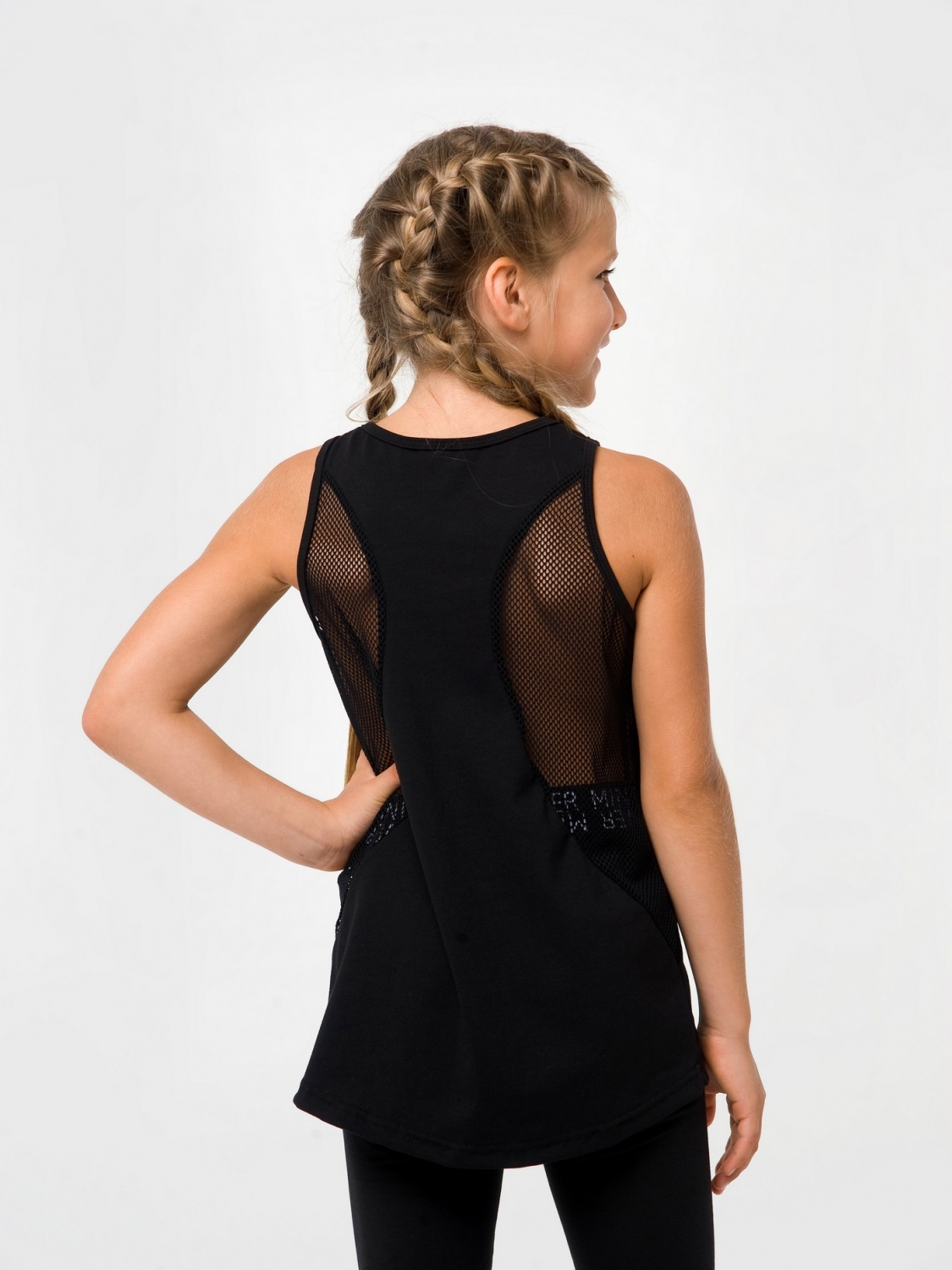 Чорна майка-борцовка з сіточкою на спині. Вона може стати частиною спортивної форми, але також вона відмінно поєднується і з повсякденними речами, наприклад, шортами, легінсами. У пошитті моделі використовувався стрейчевий кулир.