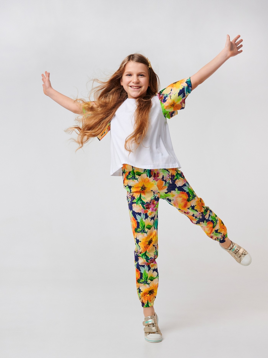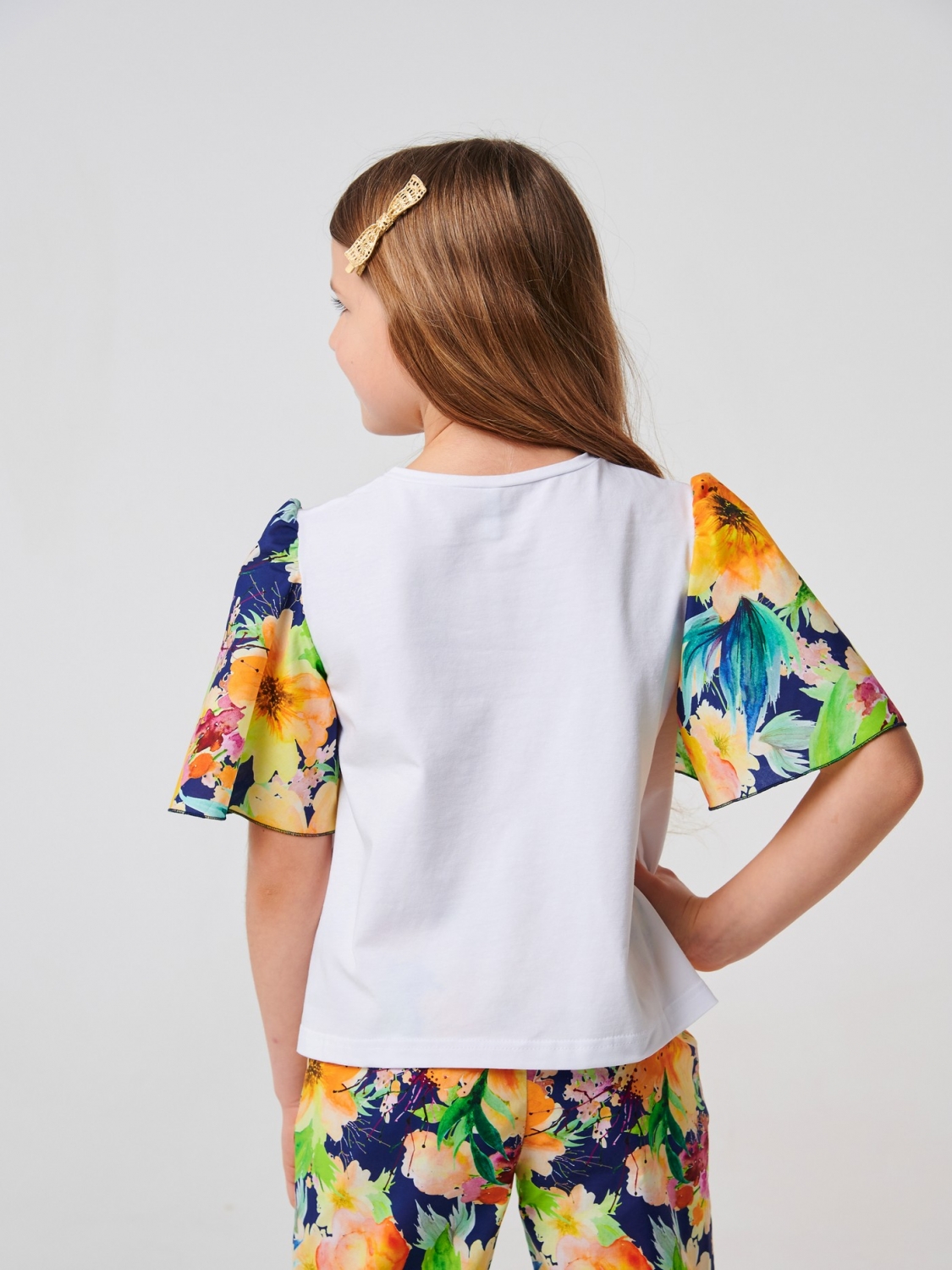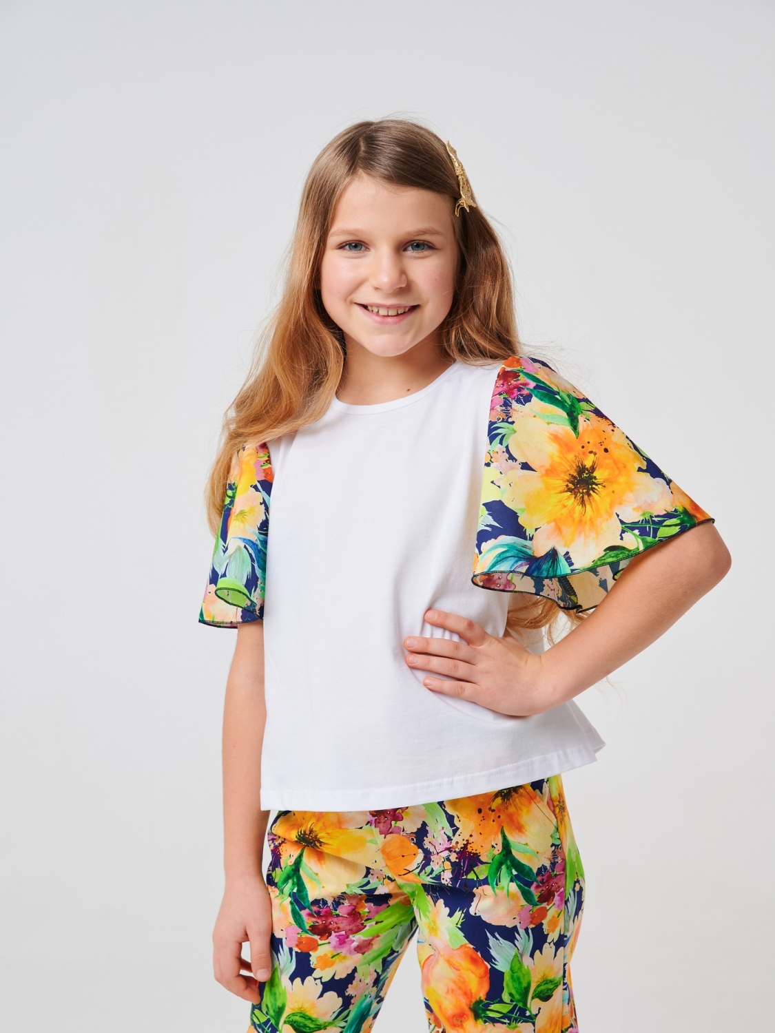 Біла футболка для дівчинки. Модель пошита із стрейчевого куліра, рукави метелика створені із принтованого ситця. Обидва матеріали легкі, приємні на дотик Виріб можна носити щодня. Футболка виглядає гарно, тому підійде і для свят. Вона добре поєднується зі спідницями, легінсами, брюками.