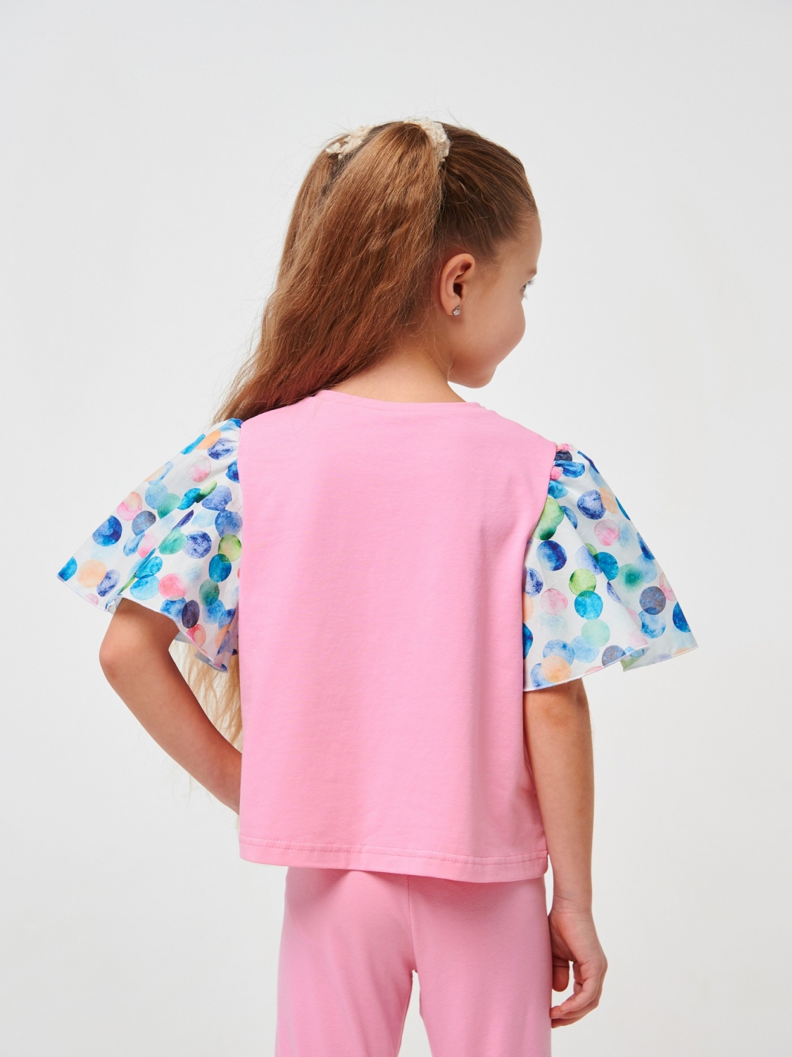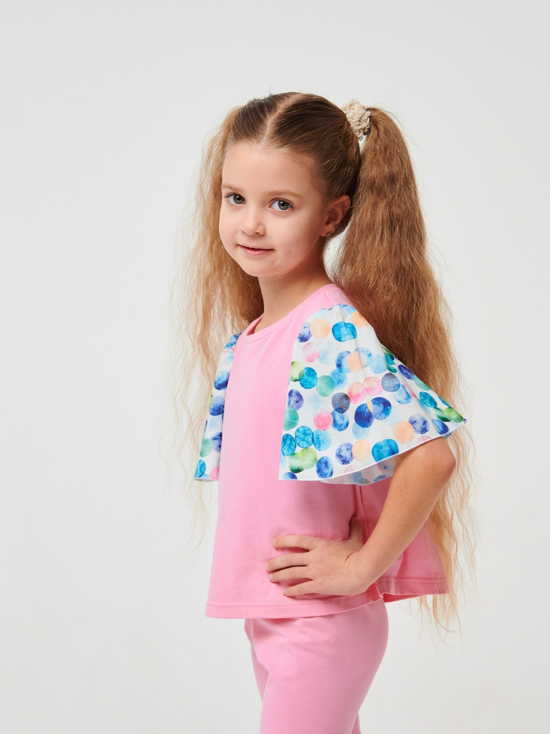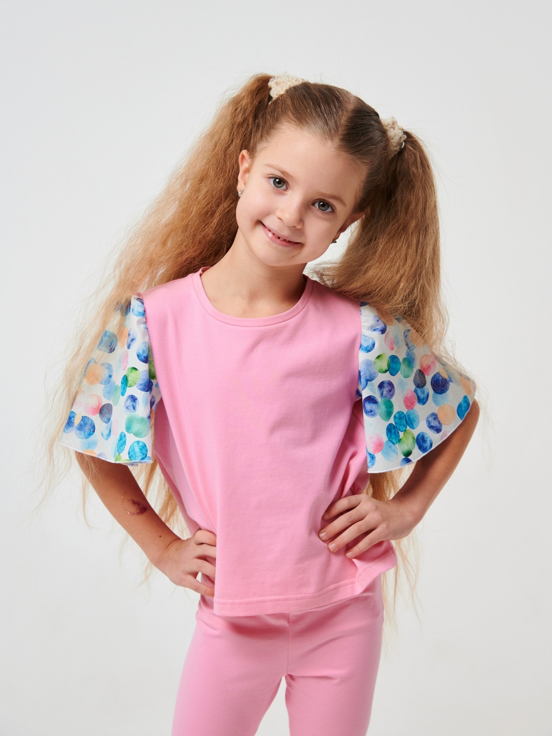 Гарна футболка ніжного рожевого кольору. Модель виконана із стрейчевого куліра, а її рукави метелика – із принтованого ситця. Обидва бавовняні матеріали, вони добре пропускають повітря. Виріб легко поєднувати з іншим одягом, наприклад, легінси, штани, шорти. Для нього знайдеться місце у літньому дитячому гардеробі.