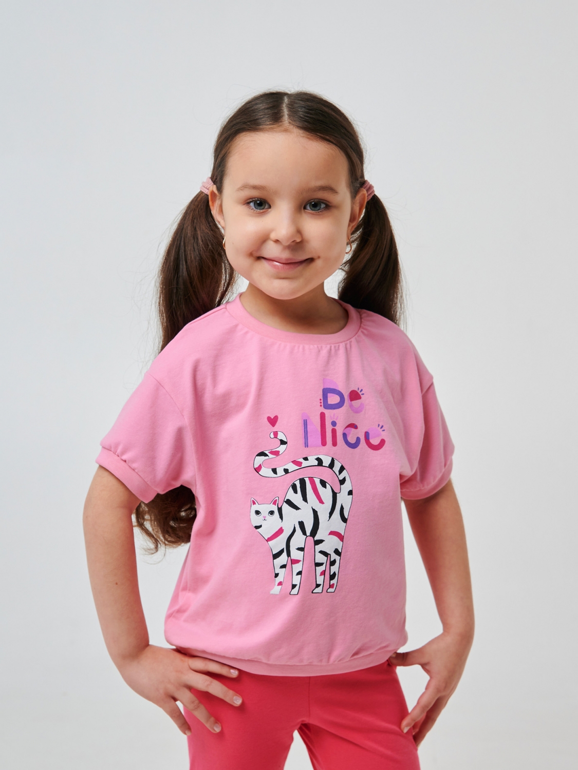Футболка у ніжному рожевому кольорі. Манжети на рукавчиках, які не тиснуть і не доставляють дитині ніякого дискомфорту, а роблять футболку стильнішою та моднішою! Оригінальний принт чарівної кішечки дуже сподобається всім дівчаткам.