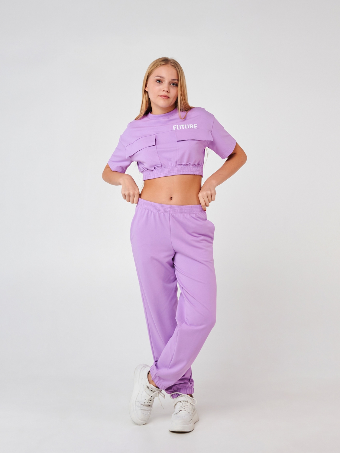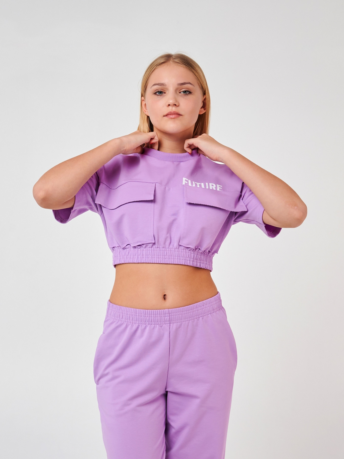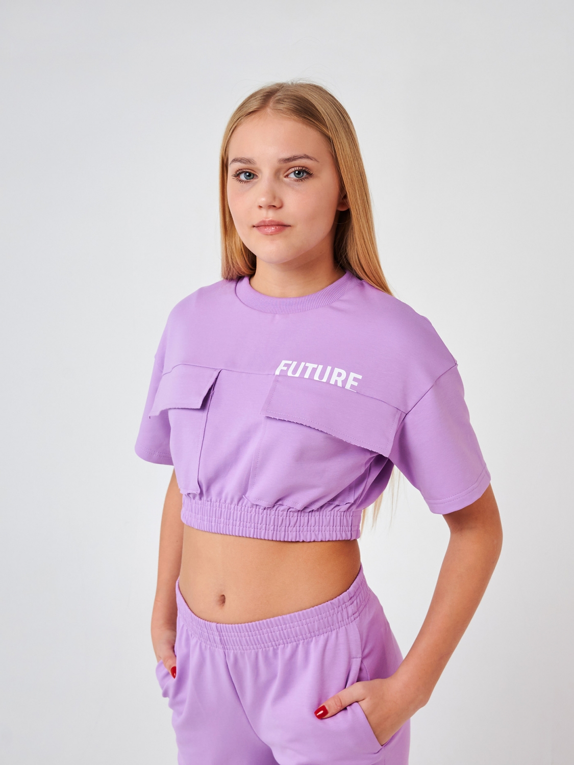 Насичений фіолетовий колір робить цей топ справжньою прикрасою для гардеробу. Сучасний та стильний, він створює неповторний образ. Наголосить на індивідуальності вашої дівчинки з оригінальною наклейкою "Future". Наші дизайнери подумали про зручність. Кишені на грудях - це стильний елемент, а гумка робить цей топ комфортним у носінні. Носіть його з брюками, шортами або спідницею, топ створюватиме ефектний і модний образ у будь-якому варіанті.