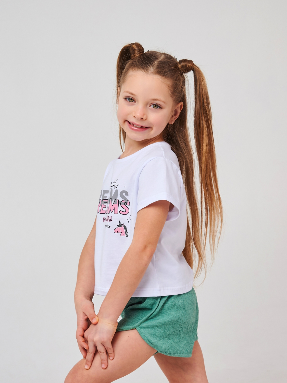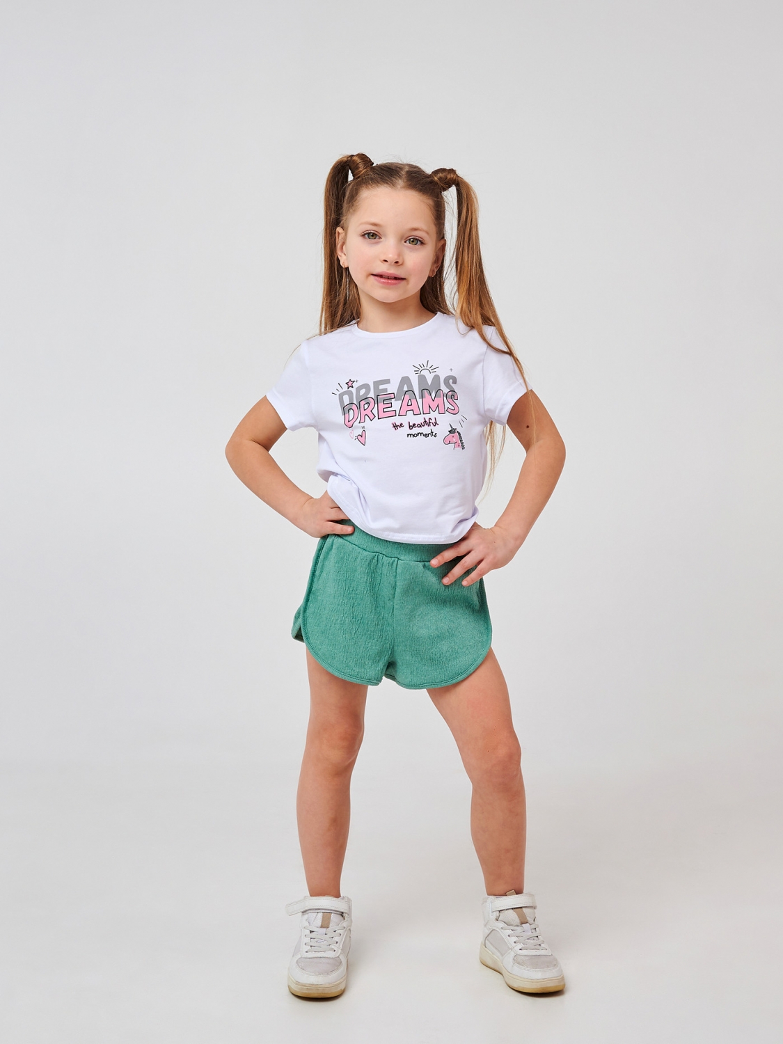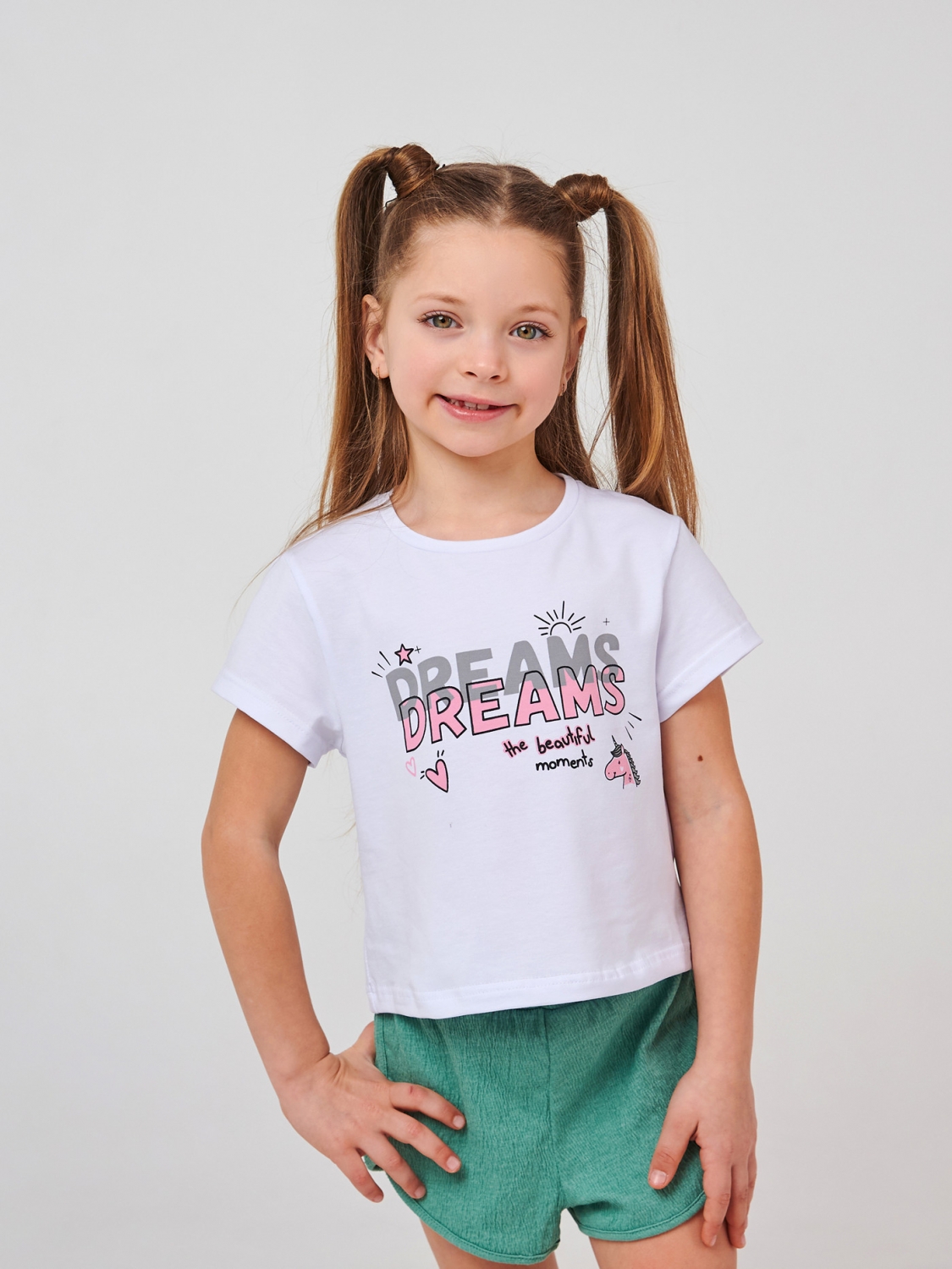 Ця чарівна біла футболка з прямим друком напис Dreams нагадає вашій маленькій дівчинці, що все можливо, коли вона вірить у свої мрії. Пошита з високоякісного стрейчевого куліра, наша футболка забезпечує максимальний комфорт та свободу руху. Нехай ваше малятко почувається легко і впевнено в цій стильній та зручній футболці.