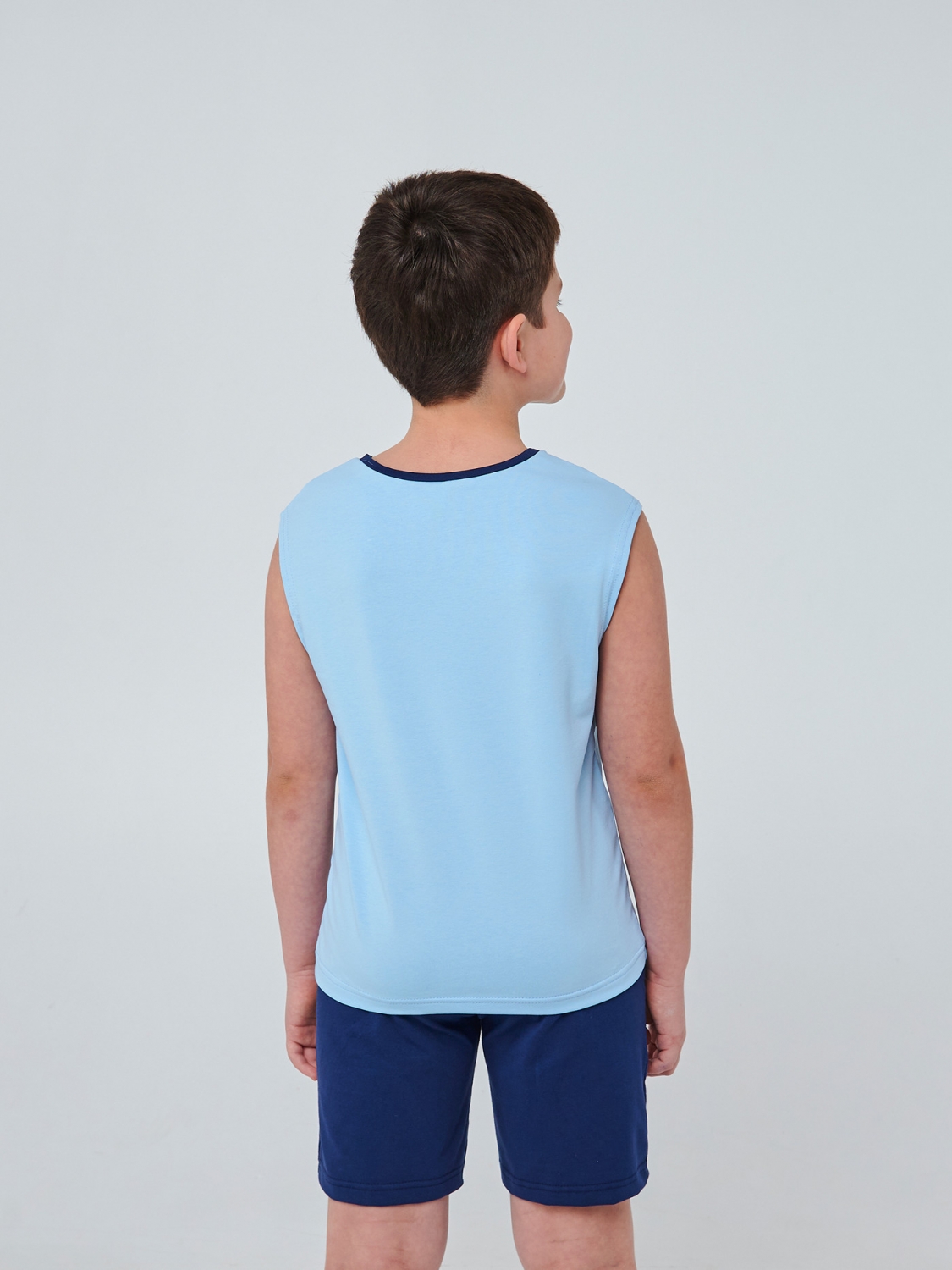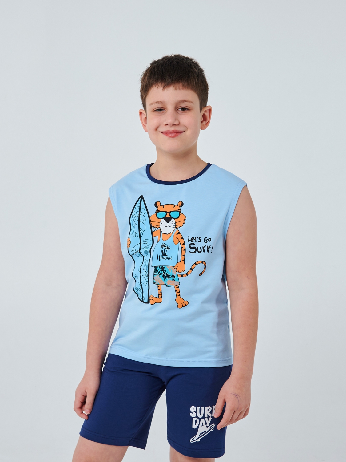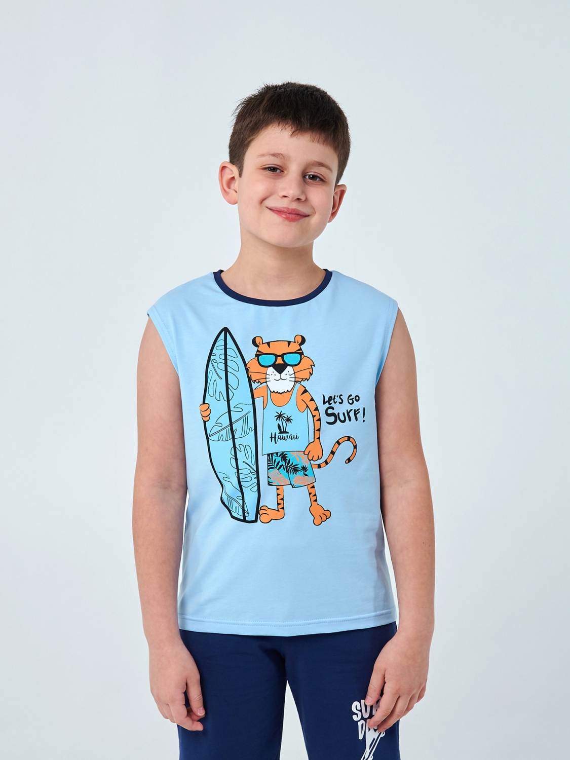 Нехай кожен день вашого хлопчика буде наповнений сонцем, морем та свободою в нашій блакитній майці зі стильним тигром-серфенгістом. Пошита з легкого та комфортного полотна, наша майка забезпечить свободу руху під час активних занять та прогулянок. Прямий друк тигра-серфінгіста додасть грайливості образу вашого хлопчика, а напис Let's Go Surf буде запрошенням до нових морських пригод.