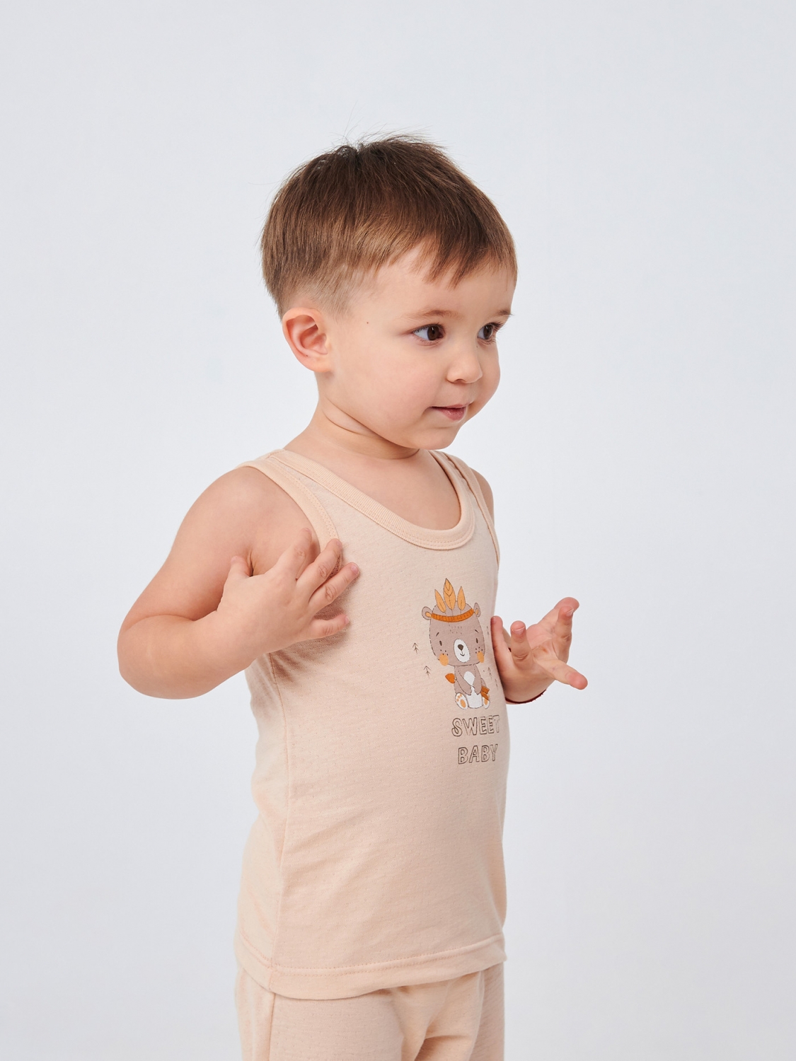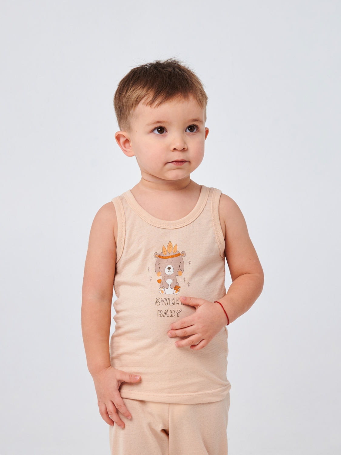 Дозвольте вашому малюку насолоджуватися кожним моментом свого дитинства у цій ніжній майці ванільного кольору, яка подарує йому почуття затишку та радості. Пошита з м'якого ажурного куліра, ця майка гарантує вашому малюку максимальний комфорт та легкість. Прямий друк смішного ведмедика-індіанця і напис 'Sweet Baby' додасть веселого і грайливого вигляду в образ вашого хлопчика.