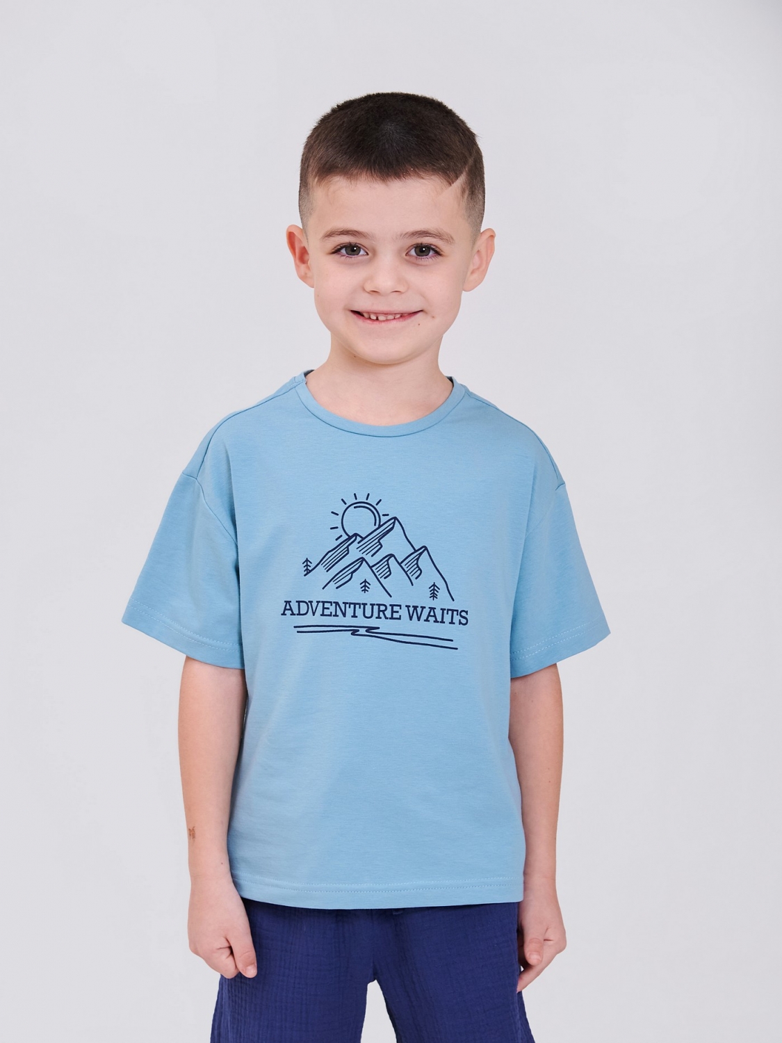 Футболка для хлопчика кольору морської хвилі - ідеально для маленьких мрійників! Яскравий прямий друк із зображенням гір та написом "Adventure Wait" надихає і на нові пригоди. М'яке стрейчеве кулірне полотно дарує комфорт та свободу рухів у будь-яку пору року. Стильний дизайн та практичність роблять цю футболку чудовим вибором для активних днів.