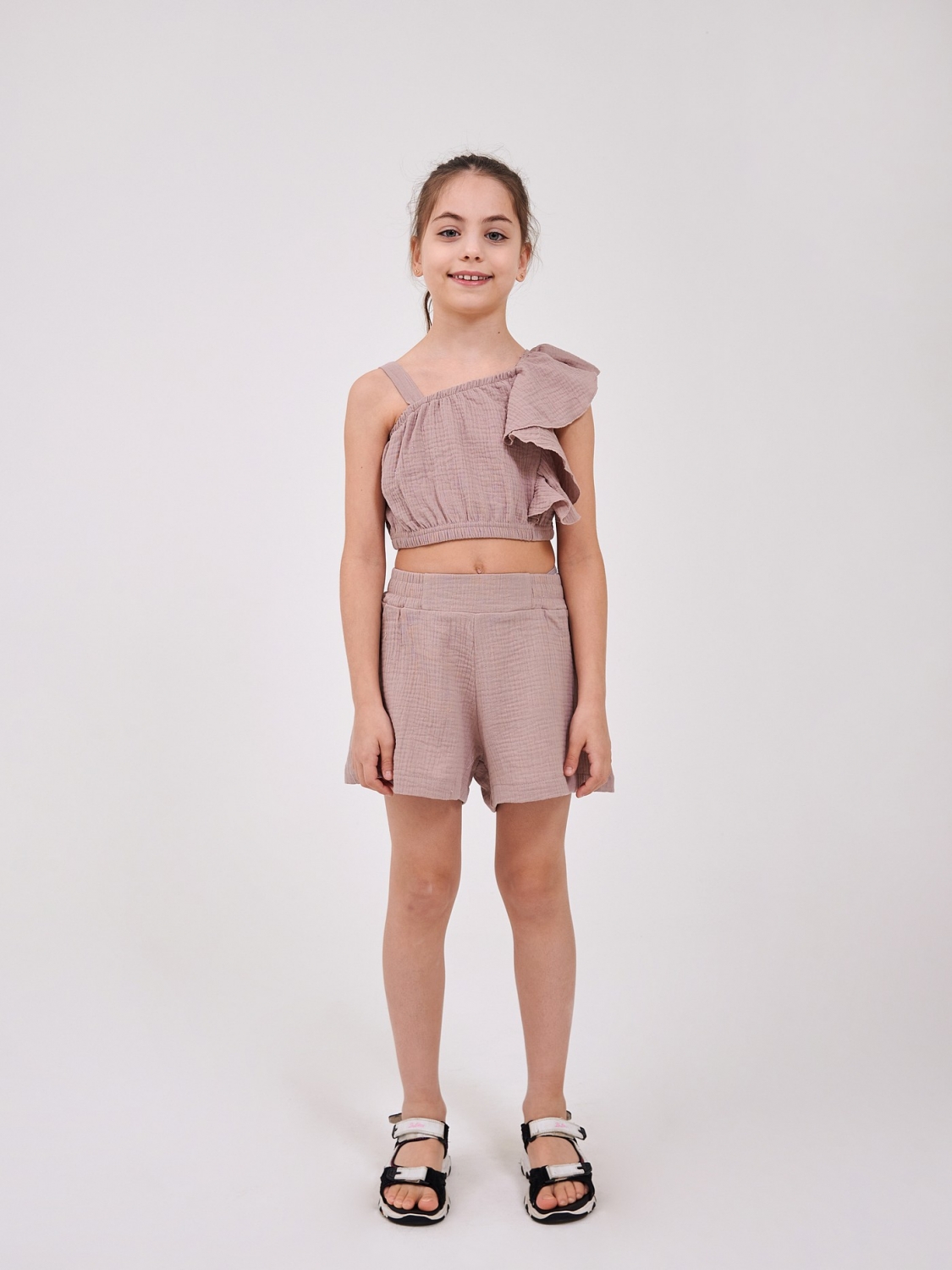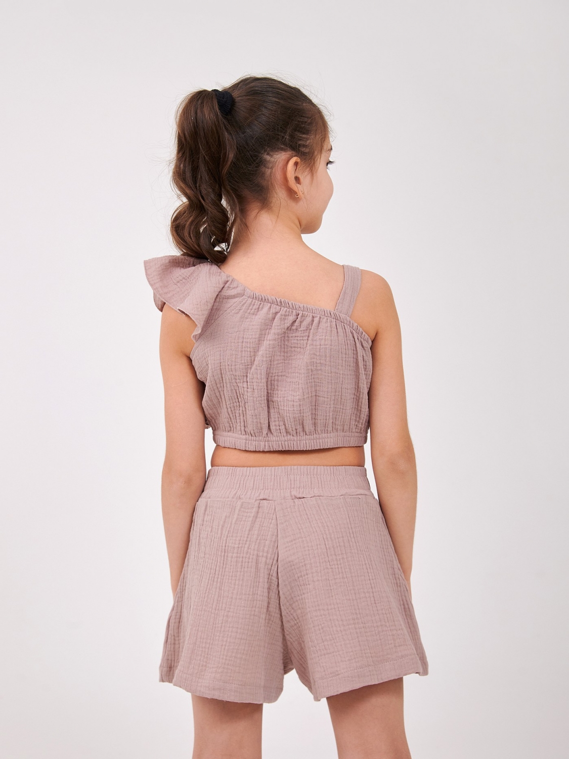 Топ для дівчинки з м'якого мусліну в відтінку кави — стильна і ефектна модель для літнього гардеробу. Натуральне полотно забезпечує легкість та комфорт навіть у спеку, приємно прилягаючи до шкіри. Головний акцент — гарний волан на одному плечі, який надає образу оригінальності та особливого шарму. Вільний крій не сковує рухів, а асиметричний дизайн робить топ по-справжньому модним і незабутнім. Ідеальний варіант для стильних літніх образів.