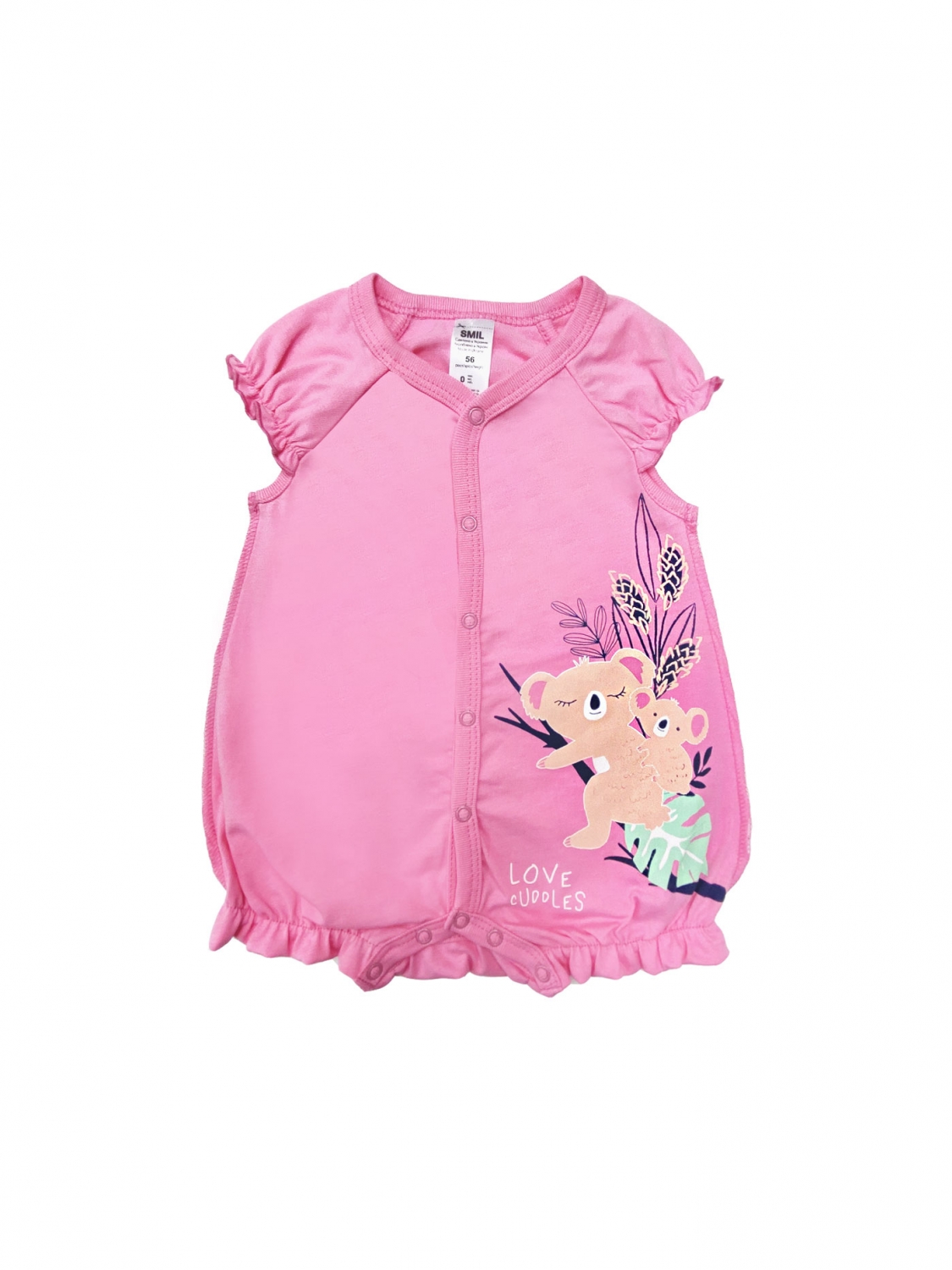 Універсальний пісочник малинового відтінку розрахований на дівчаток у віці до трьох місяців. У такому вбранні малятко буде комфортно почувати себе на прогулянках і на пляжі. Виріб виконаний з якісного гіпоалергенного матеріалу - кулір. Пісочник з короткими рукавами прикрашений рюшами декорований принтом у вигляді милих коал, нанесеним методом прямого друку. Застібається виріб на кнопки, розташовані спереду і між ніг.