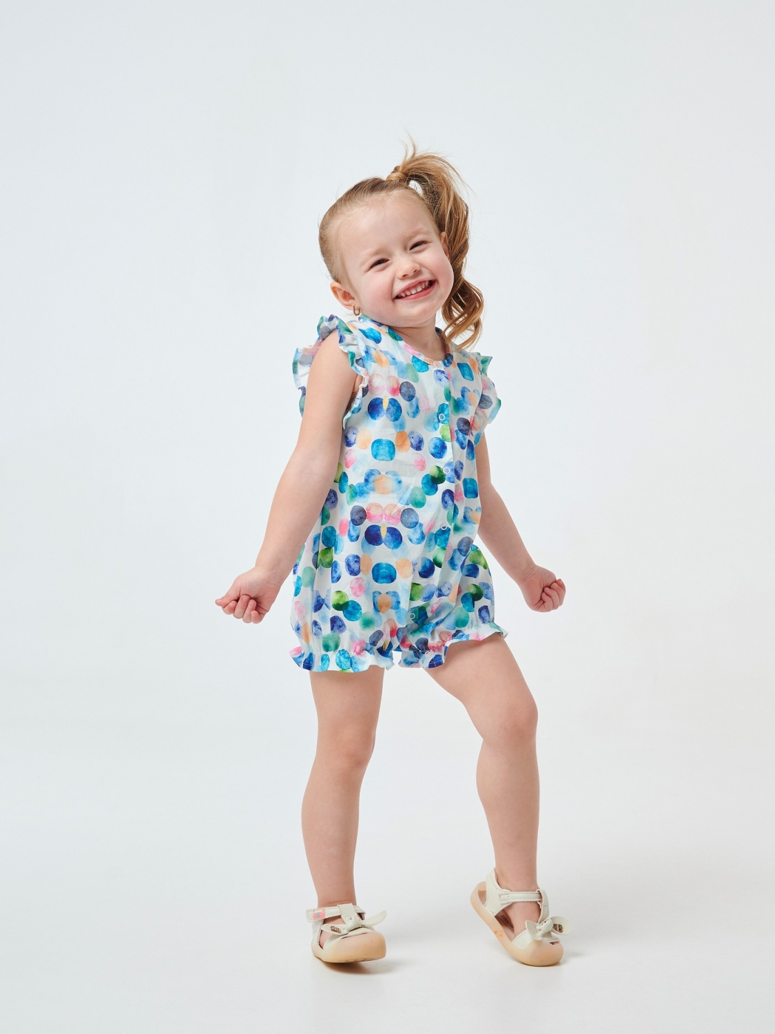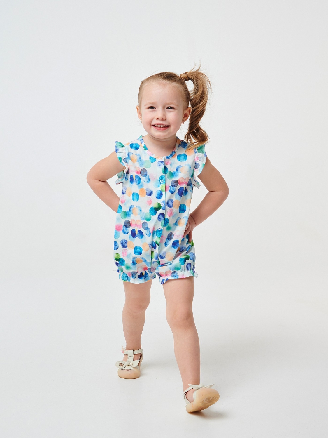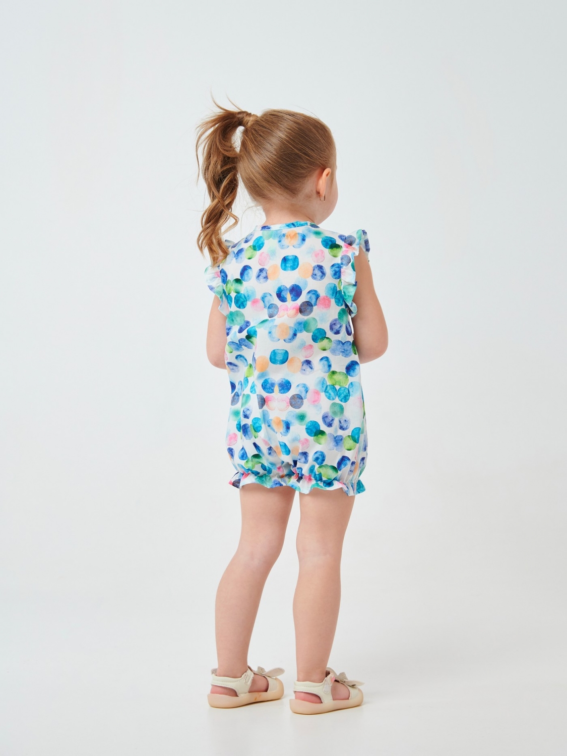 Літній пісочник для малечі. Він створений із ситцю, 100% бавовняного матеріалу. Тканина добре пропускає повітря. Спереду на моделі є застібки-кнопки. На ніжках – резиночки з рюшами, вони не тиснуть. Рукави-метелики надають виробу краси. У пошитті використана тканина в принт кульки.