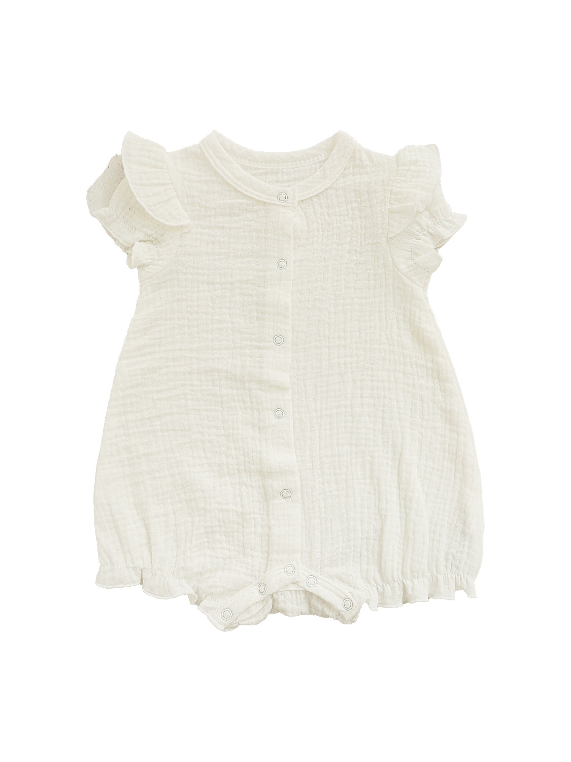 Ніжний і зручний пісочник для дівчаток, пошитий з мусліну - дихаючого, гіпоалергенного матеріалу, що ідеально підходить для чутливої ​​шкіри. Кнопки вздовж усього виробу зручно перевдягати навіть найменших. Рюші на рукавах додають зворушливої ​​чарівності. Рукави та ніжки зібрані на м'яку гумку.