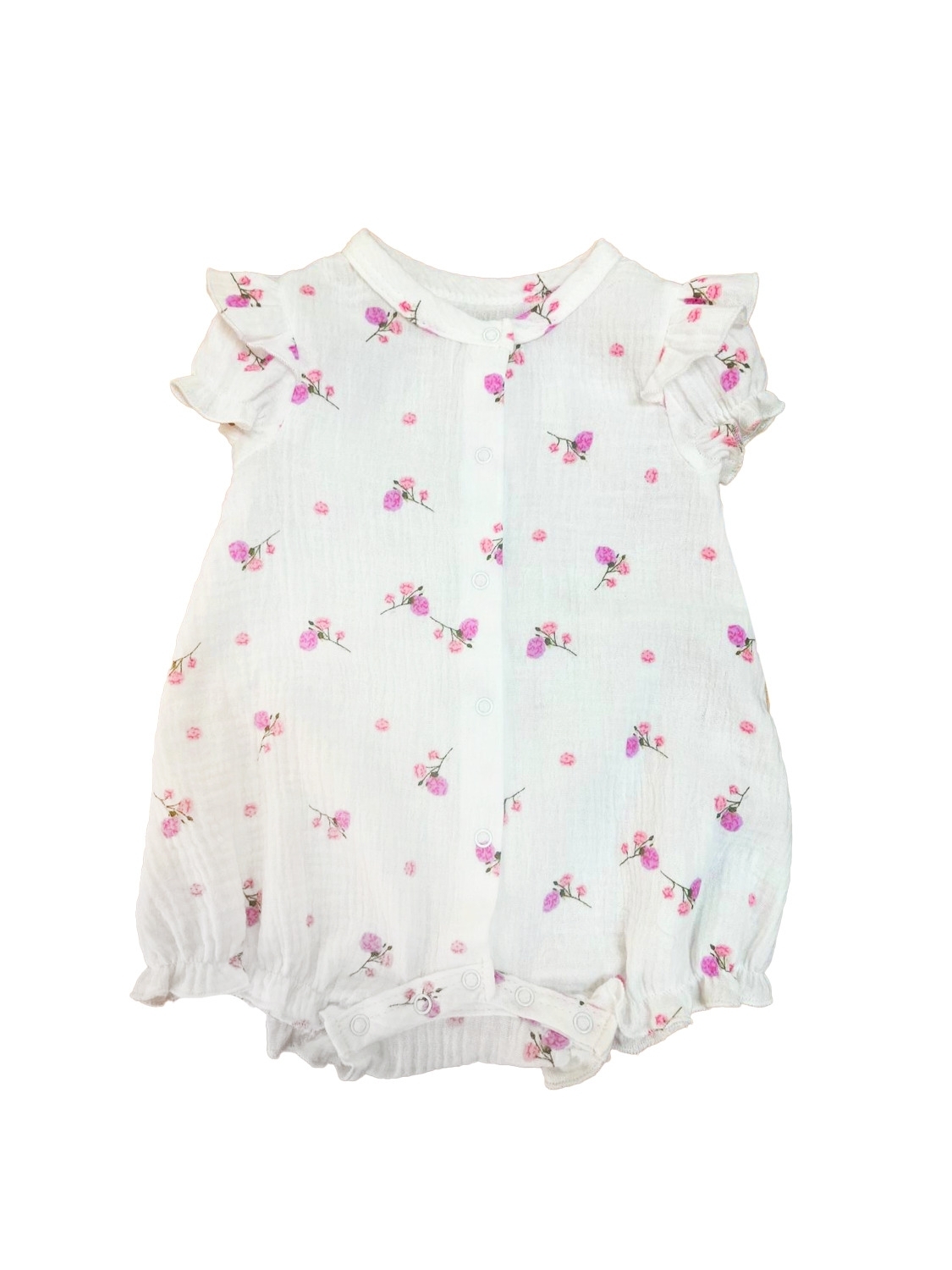 Ніжний і зручний пісочник для дівчаток, пошитий з мусліну - дихаючого, гіпоалергенного матеріалу, що ідеально підходить для чутливої шкіри. Кнопки вздовж усього виробу зручно перевдягати навіть найменших. Рюші на рукавах додають зворушливої чарівності. Рукави та ніжки зібрані на м'яку гумку.