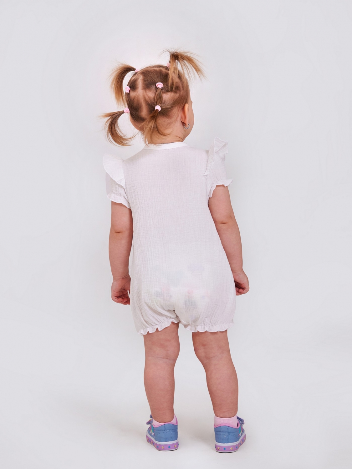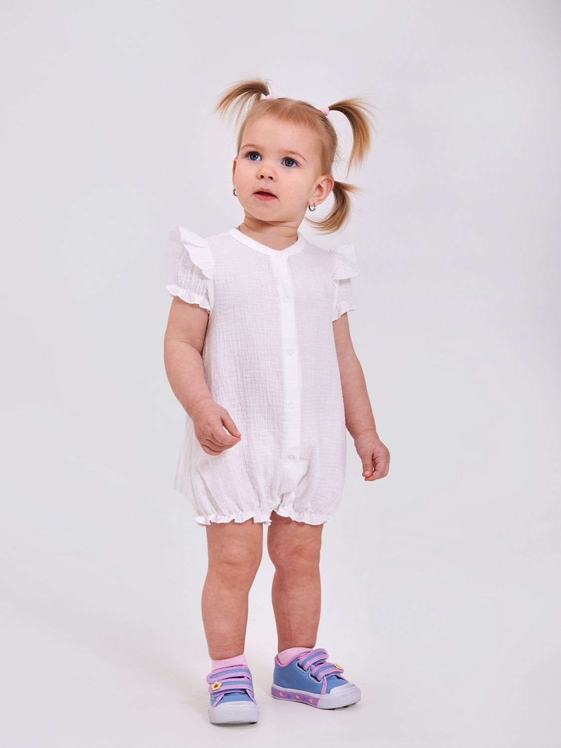 Ніжний і зручний пісочник для дівчаток, пошитий з мусліну - дихаючого, гіпоалергенного матеріалу, що ідеально підходить для чутливої шкіри. Кнопки вздовж усього виробу зручно перевдягати навіть найменших. Рюші на рукавах додають зворушливої чарівності. Рукави та ніжки зібрані на м'яку гумку.