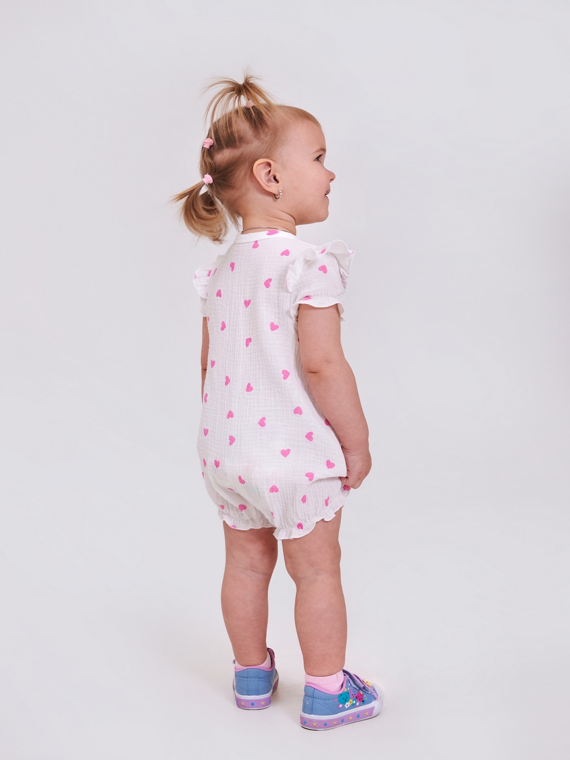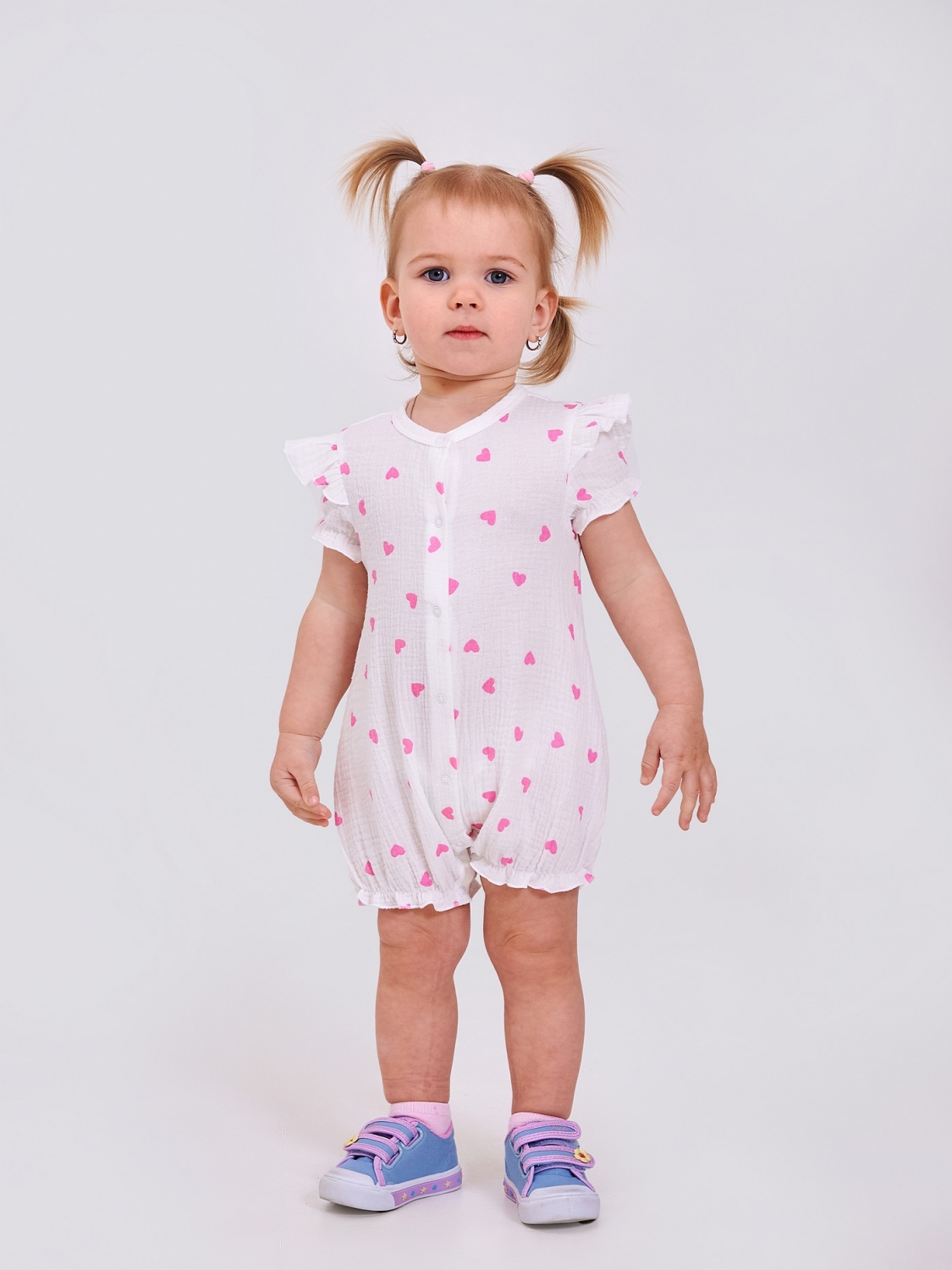 Ніжний і зручний пісочник для дівчаток, пошитий з мусліну - дихаючого, гіпоалергенного матеріалу, що ідеально підходить для чутливої шкіри. Кнопки вздовж усього виробу зручно перевдягати навіть найменших. Рюші на рукавах додають зворушливої чарівності. Рукави та ніжки зібрані на м'яку гумку.