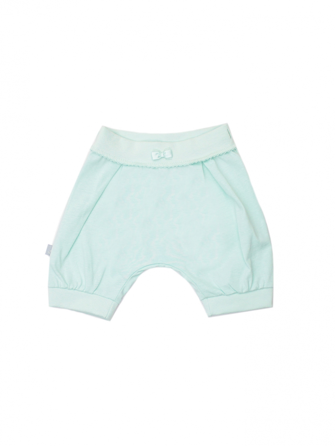 Однотонні ментолові бриджі на еластичному поясі. У моделі передбачені манжети. В якості прикраси спереду розташований бантик.