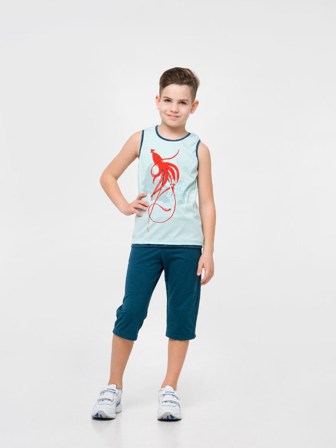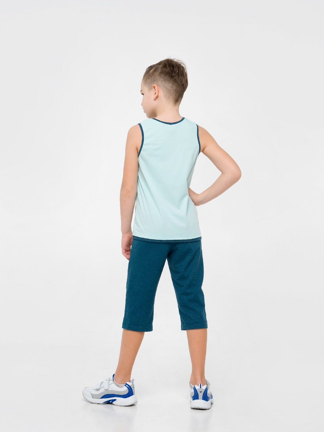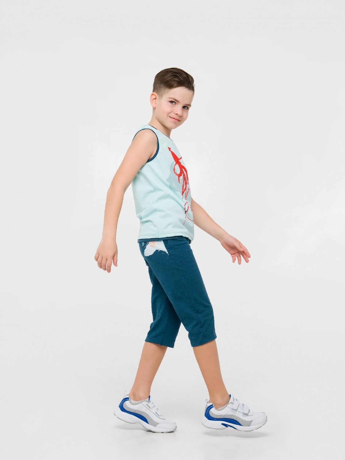 У гардеробі хлопчика у віці двох-шести років повинні бути стильні бриджі. Так як виріб добре виглядає з футболками і майками, дитина зможе відправиться в такому вбранні і на прогулянку, і на спортивний майданчик, і на пляж. Бриджі синьо-блакитного кольору пошиті з зносостійкого стрейчевой Лакост, оснащені кишенями і еластичним поясом. Але головна родзинка - це абстрактний принт, нанесений на бічну частину виробу методом прямого друку.