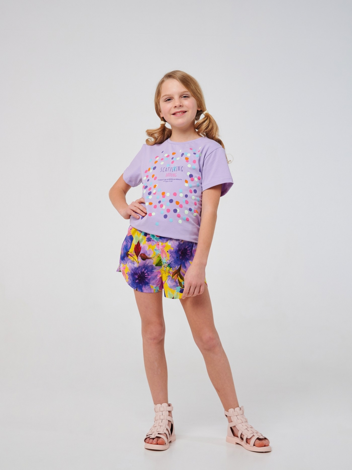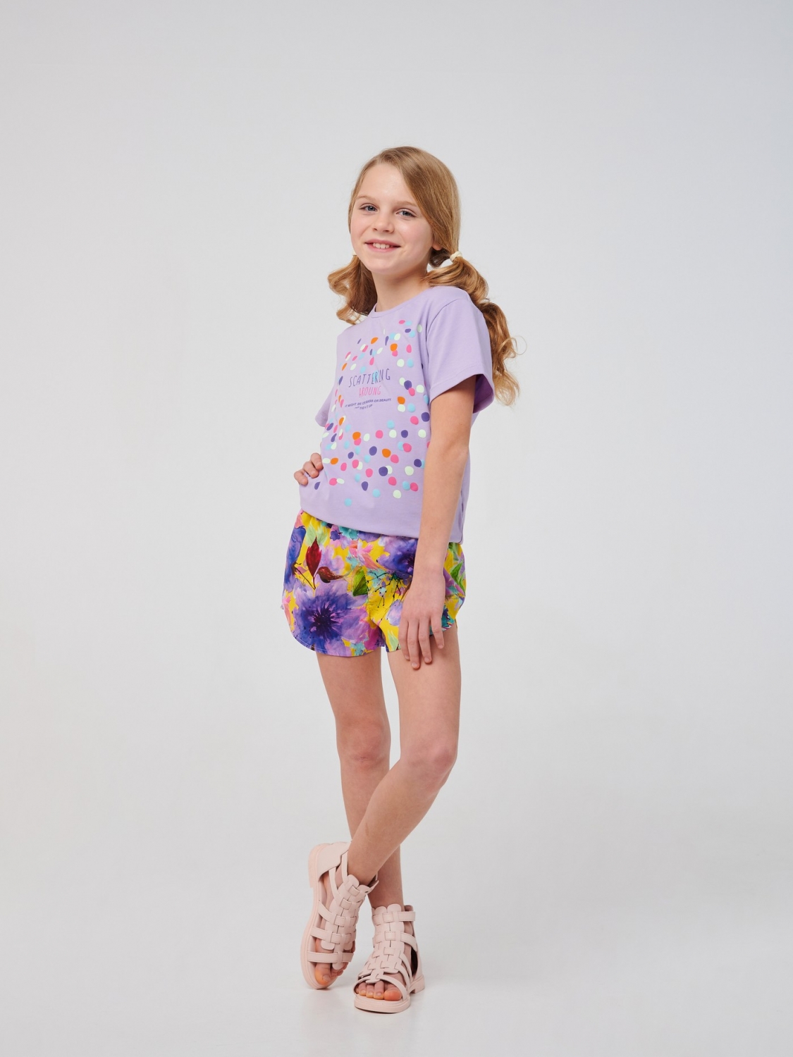 Гарні короткі шорти для дівчинки. Модель пошита їх дихаючим бавовняним матеріалом – ситцем. Матеріал покритий квітковим принтом. Виріб оснащений еластичним поясом, який не тисне, але забезпечує надійну фіксацію та зручну посадку на тілі. З боків передбачені розрізи. Шорти підійдуть для повсякденного носіння.